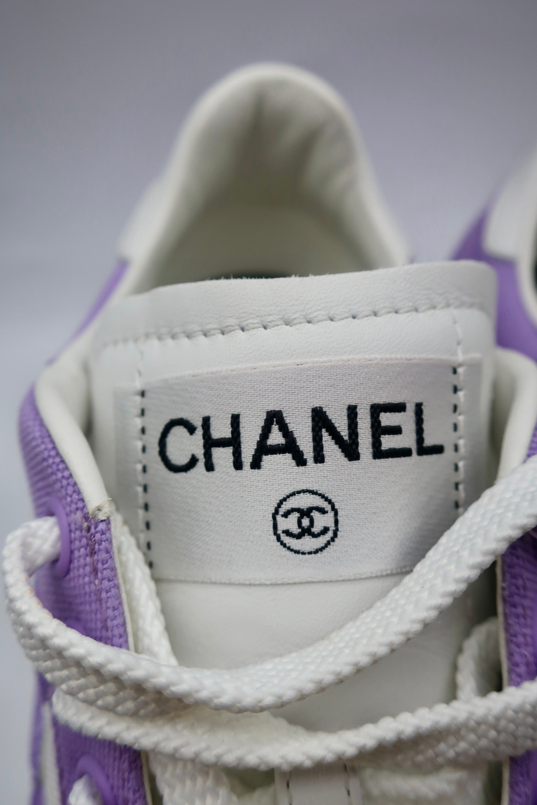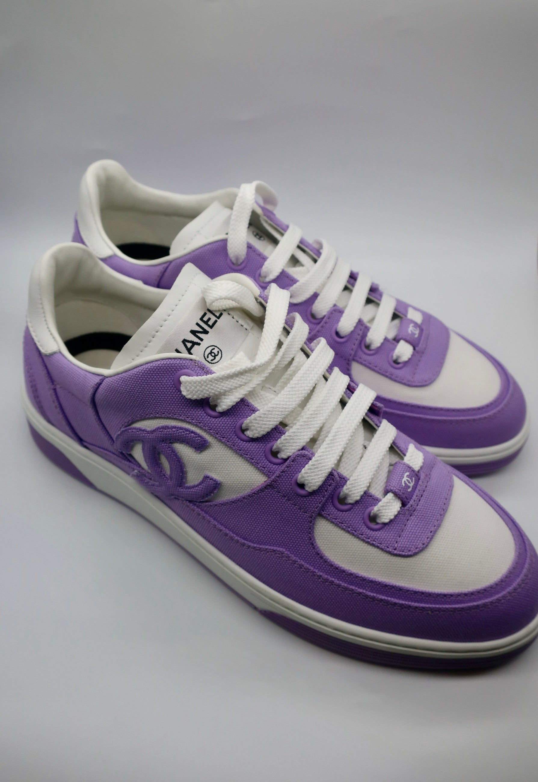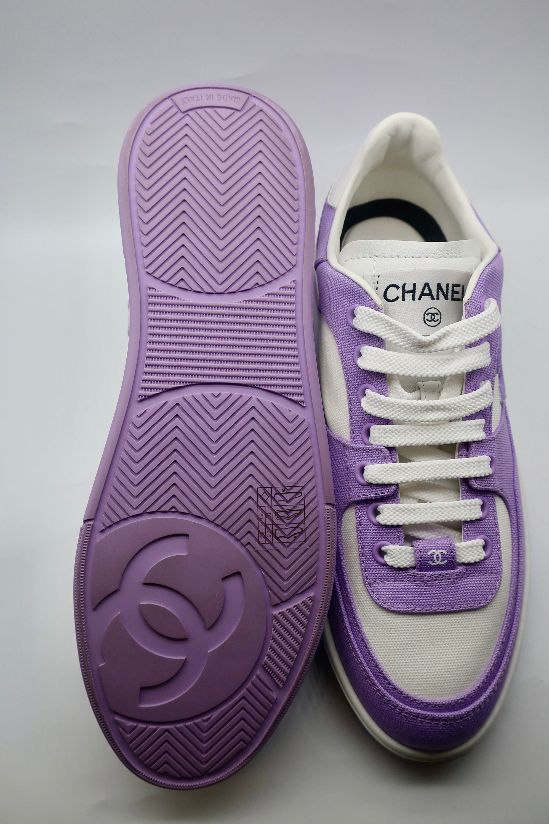 This is an authentic pair of CHANEL Cotton Sneakers size 39 in Purple and White. These sneakers are crafted of white and purple fabric with purple rubber soles and a "CC" logo on each shoe.