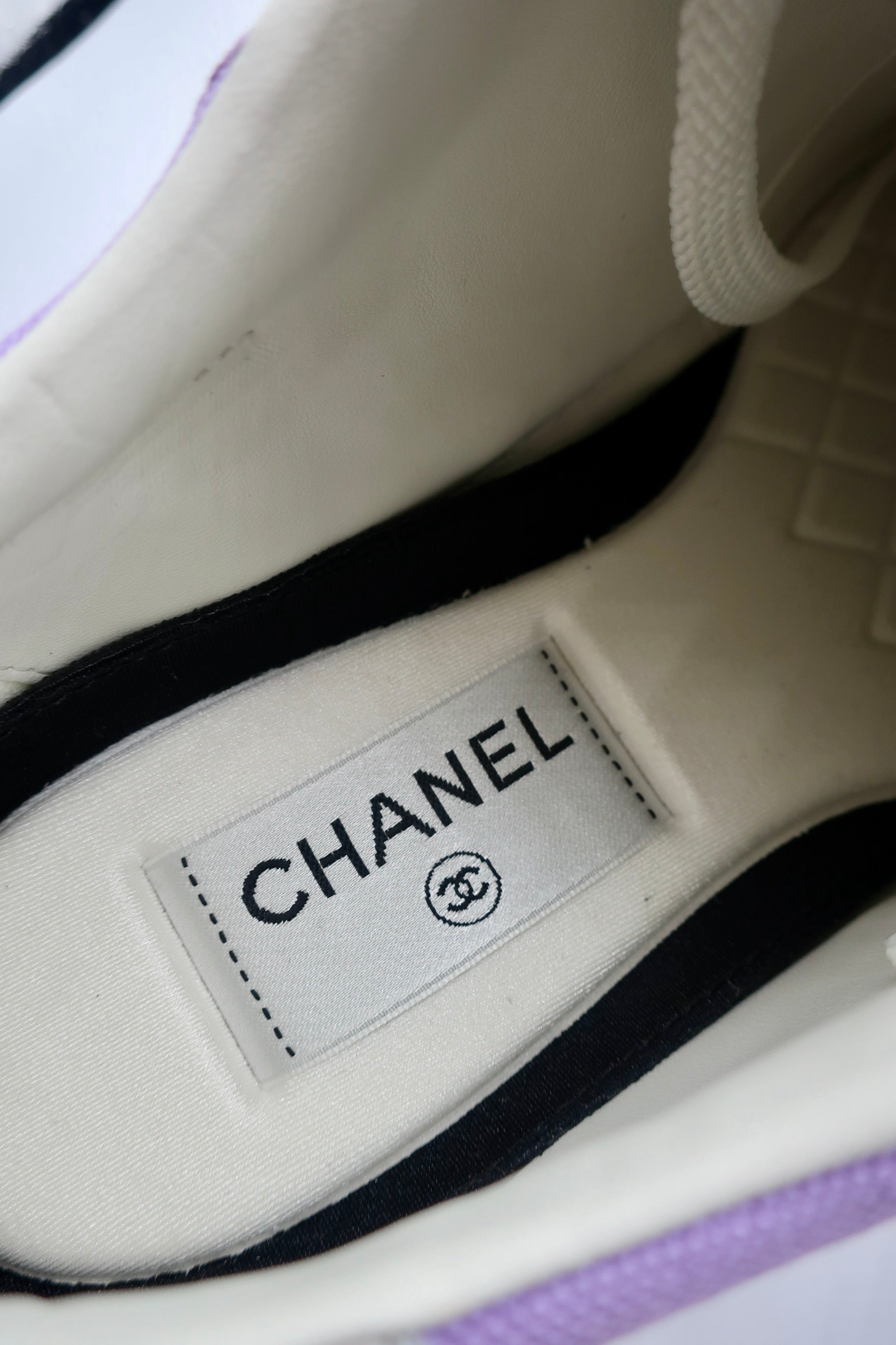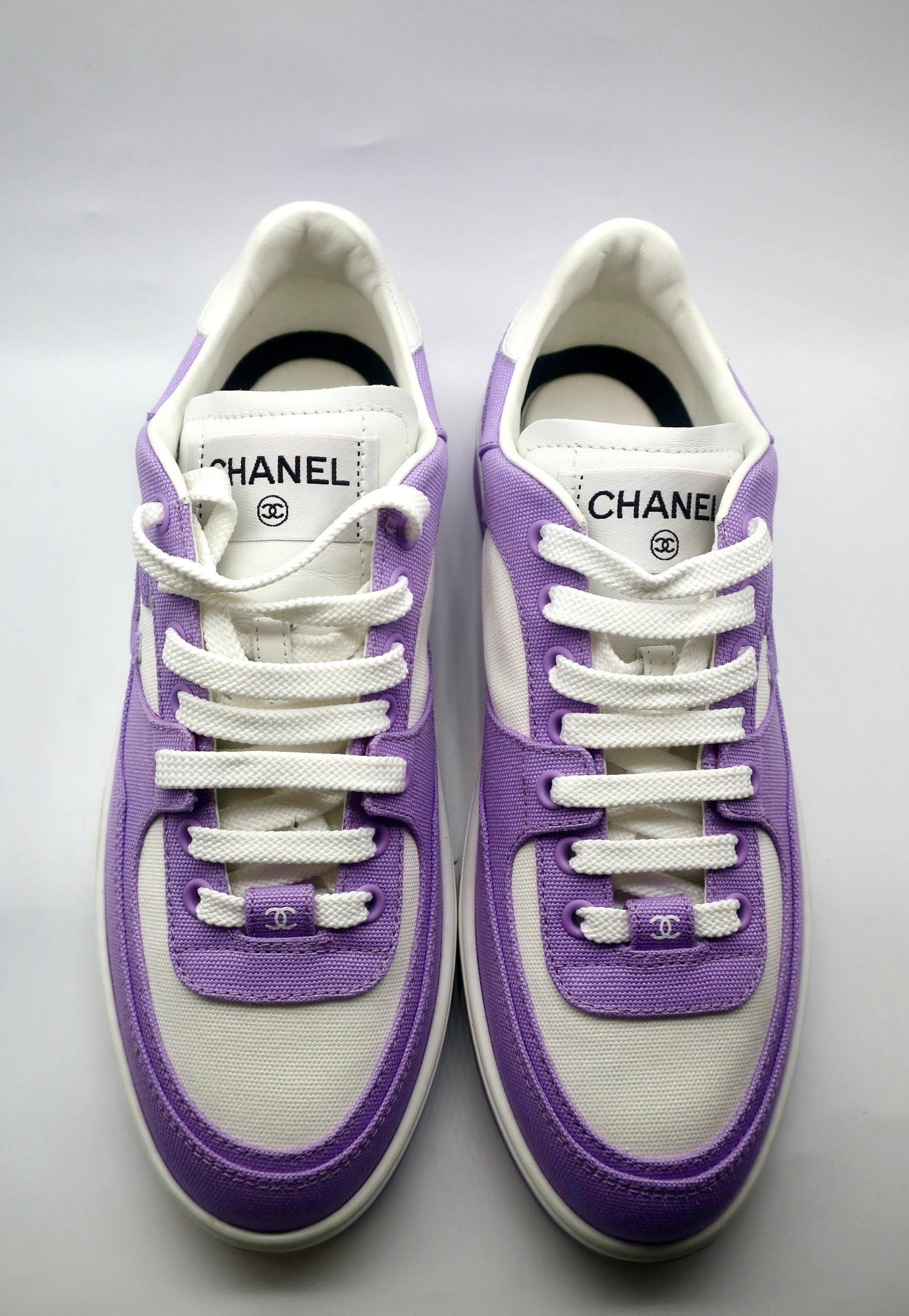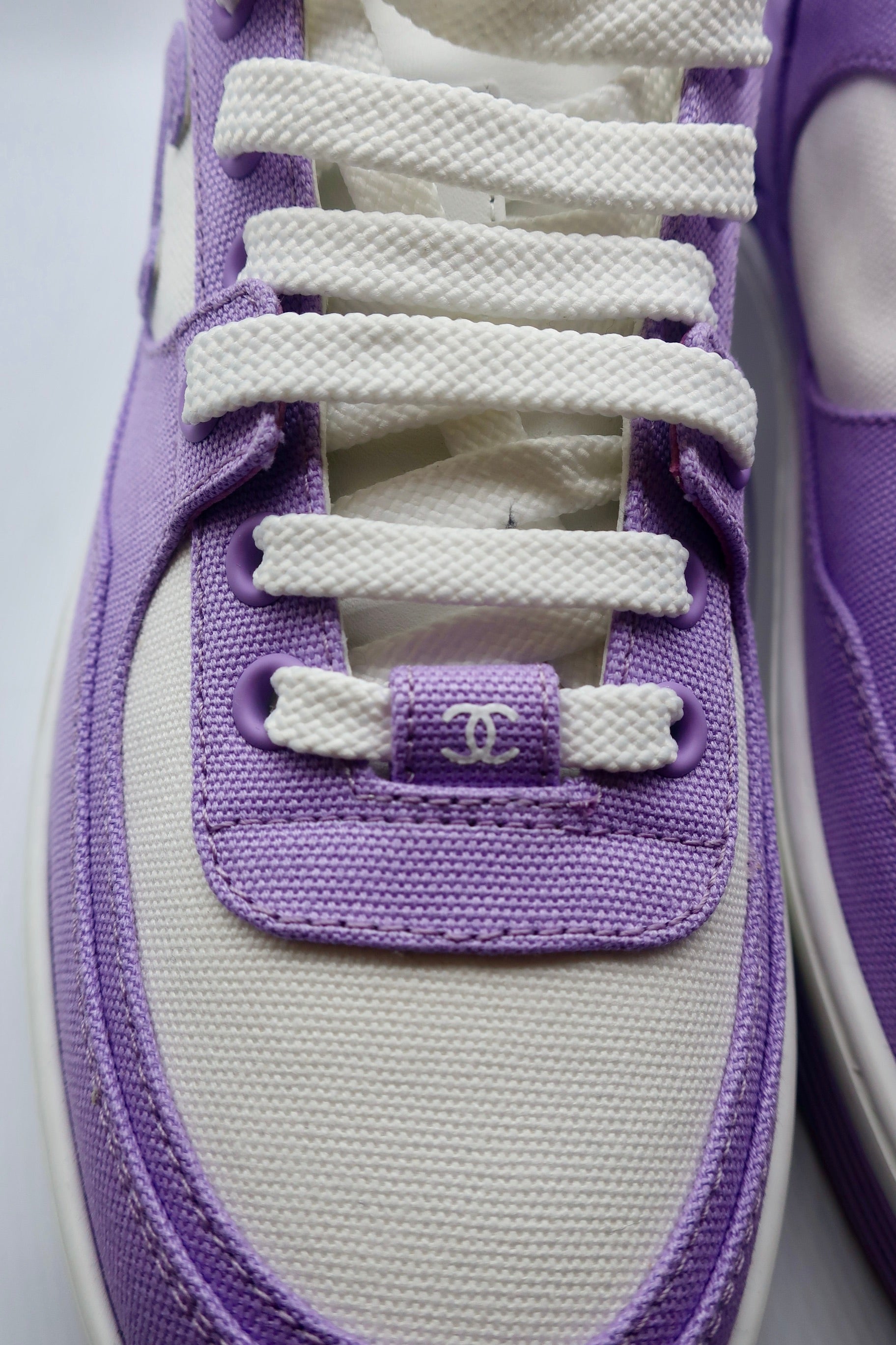 This is an authentic pair of CHANEL Cotton Sneakers size 39 in Purple and White. These sneakers are crafted of white and purple fabric with purple rubber soles and a "CC" logo on each shoe.