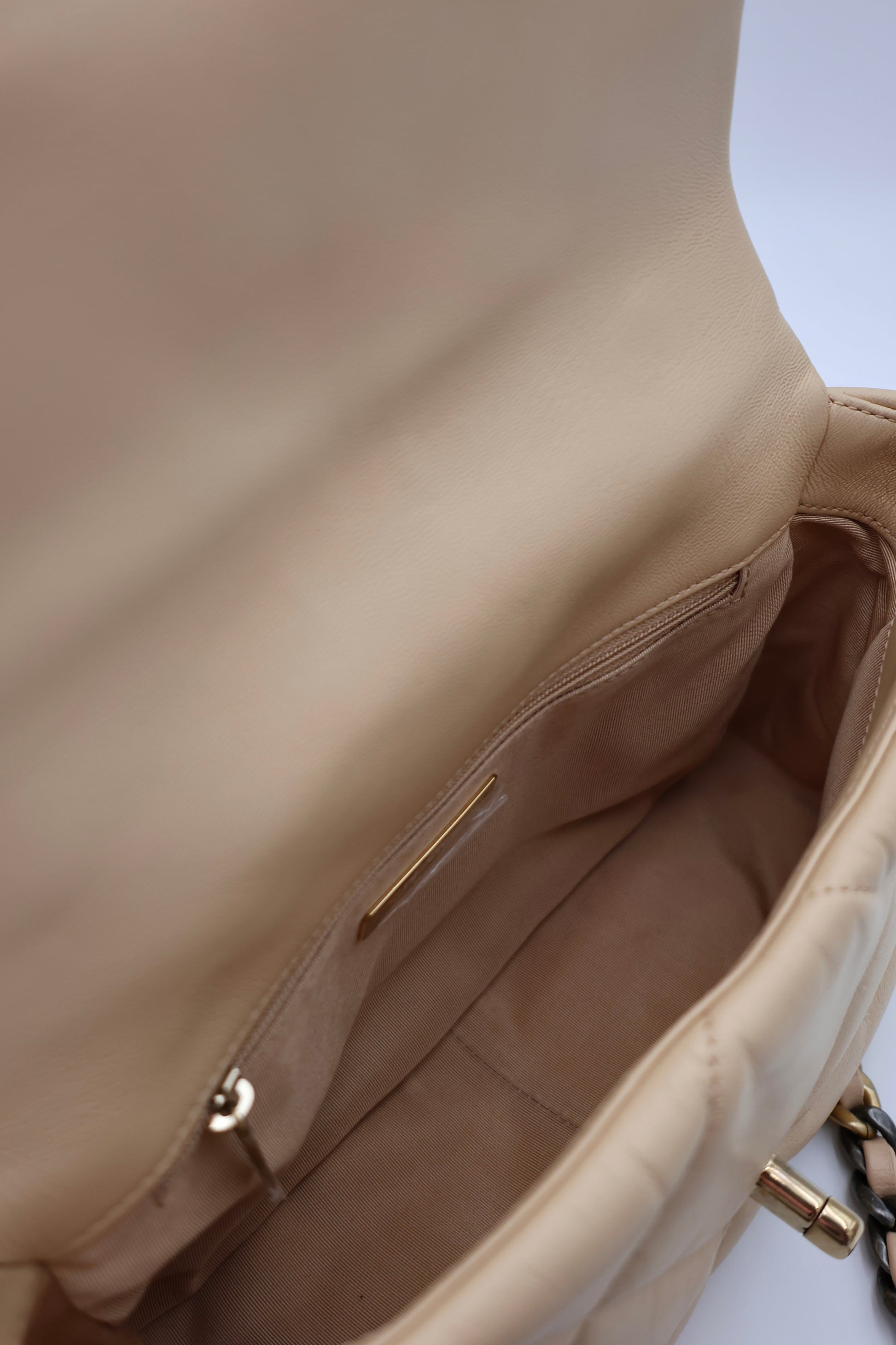 This exquisite Chanel 19 shoulder and backpack is crafted from soft beige lambskin sheepskin leather, offering both luxury and versatility. It can be worn two ways for effortless style. The bag features a secure turn-lock closure, an interior zip pocket, and comes with a storage bag and hologram sticker, affirming its authenticity. In excellent pre-owned condition, this elegant piece seamlessly blends Chanel’s signature craftsmanship with practical design for everyday sophistication.