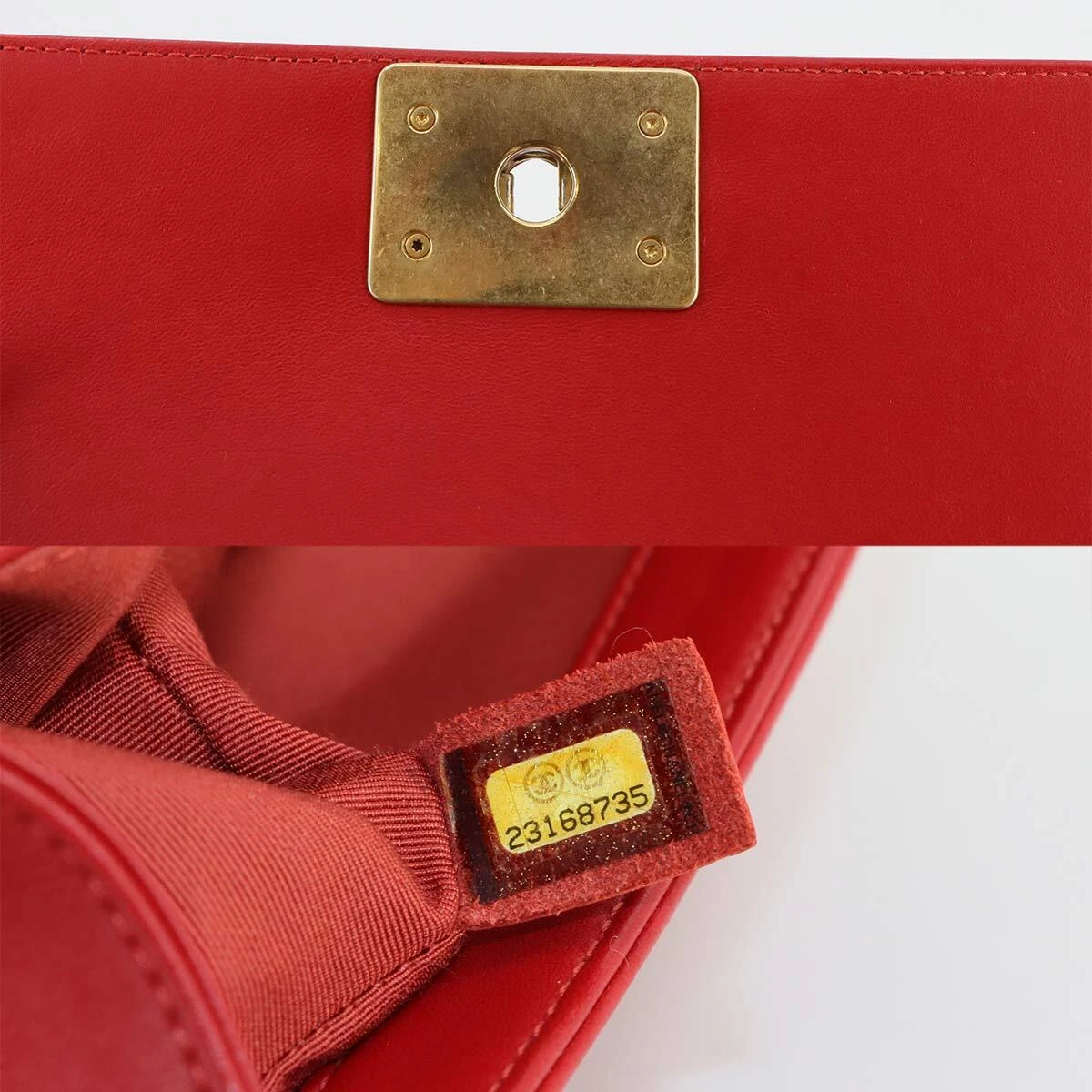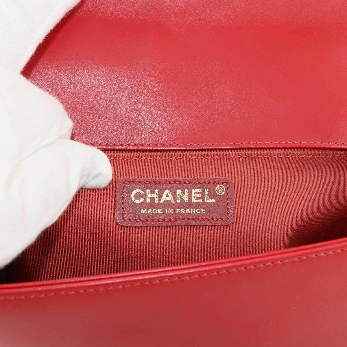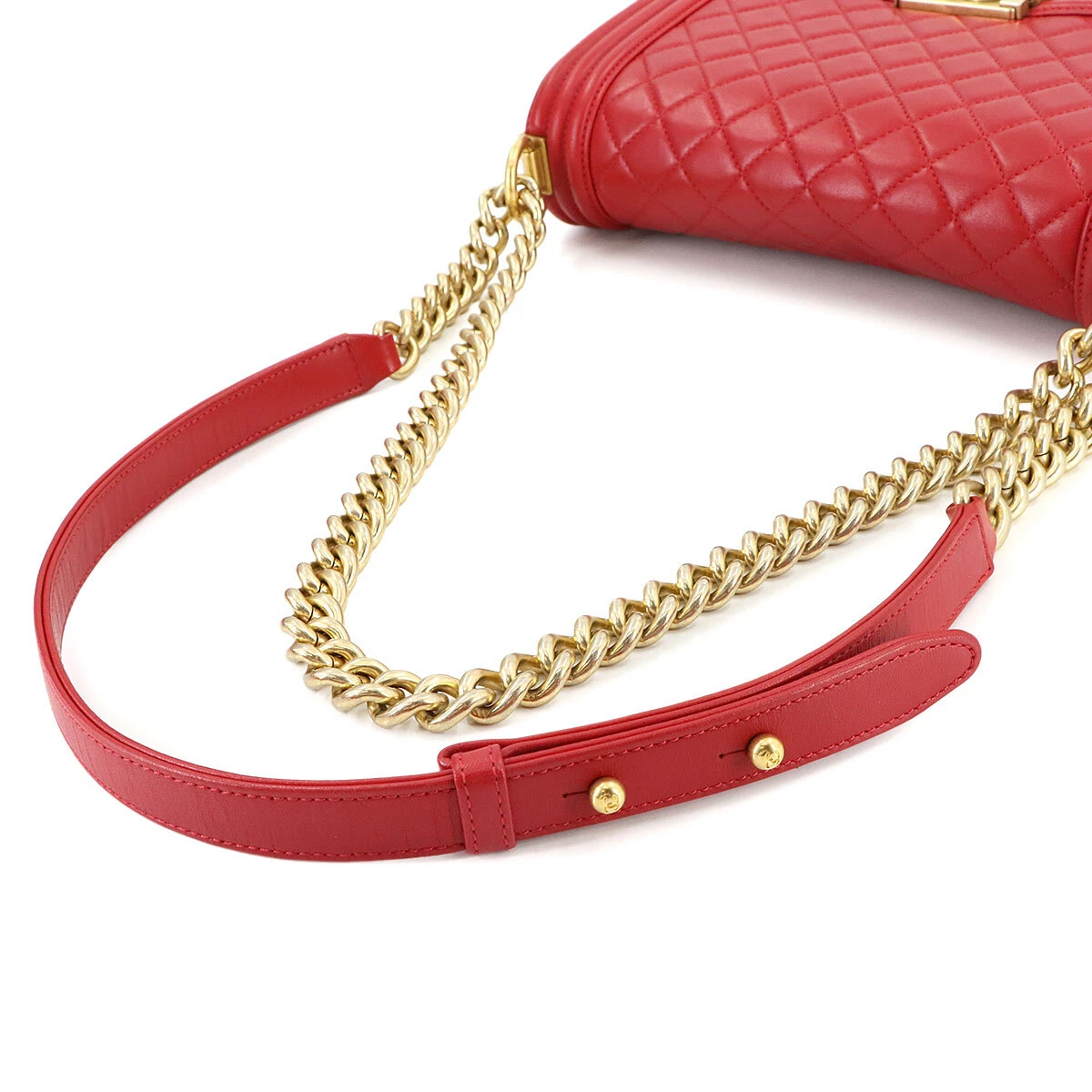 - Gently used CHANEL BOY CHANEL red leather shoulder bag with minor wear on strap, slight plating deterioration on hardware, and minimal leather imperfections.