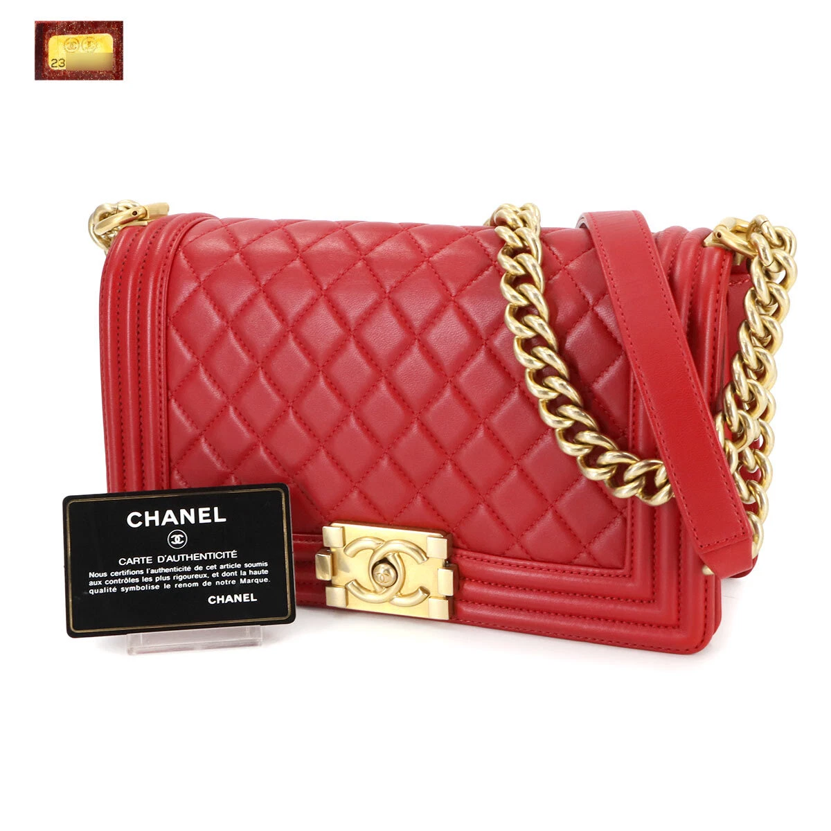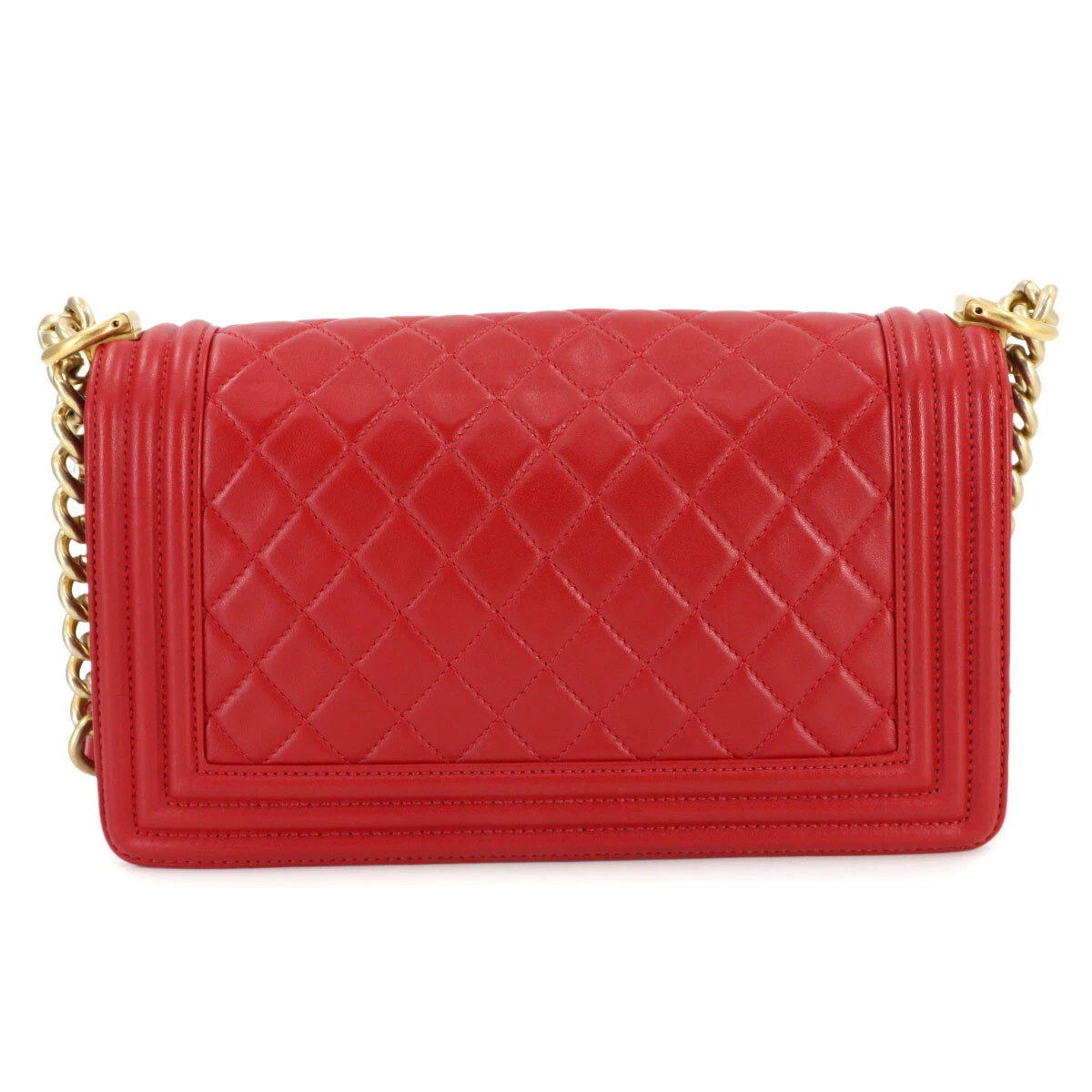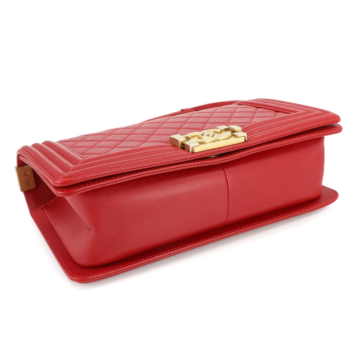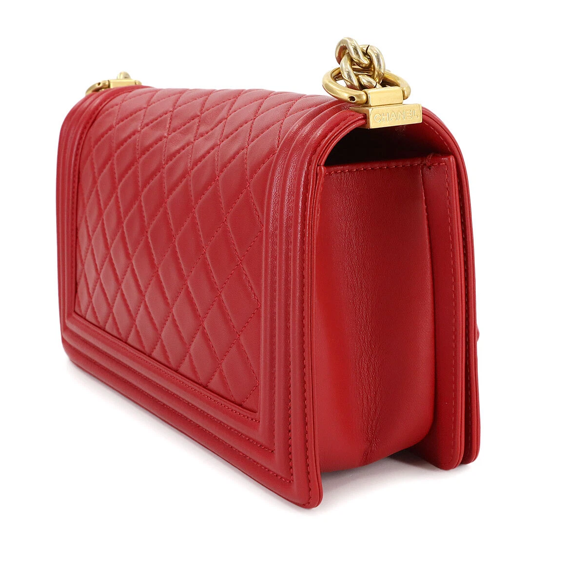 - Gently used CHANEL BOY CHANEL red leather shoulder bag with minor wear on strap, slight plating deterioration on hardware, and minimal leather imperfections.