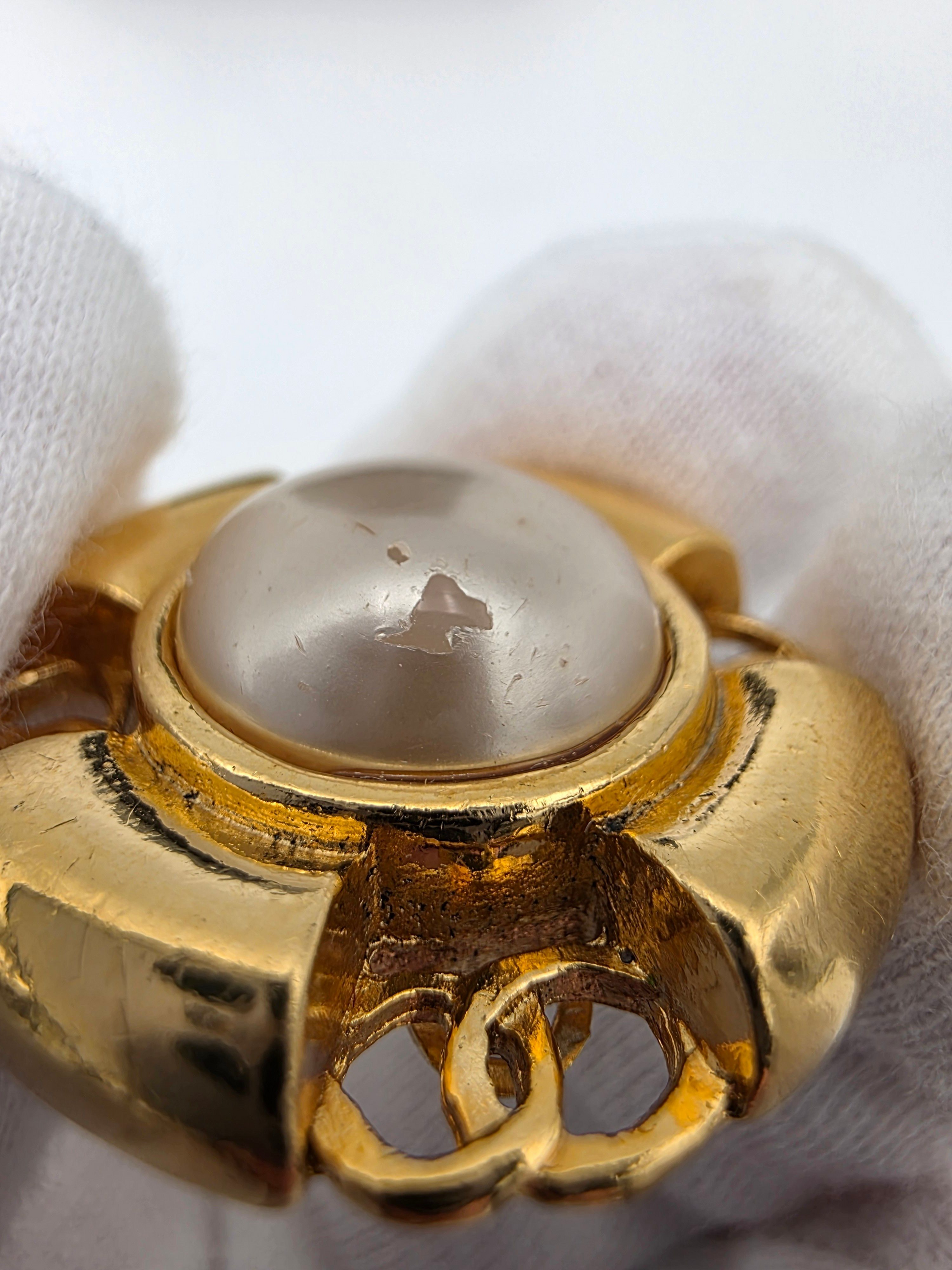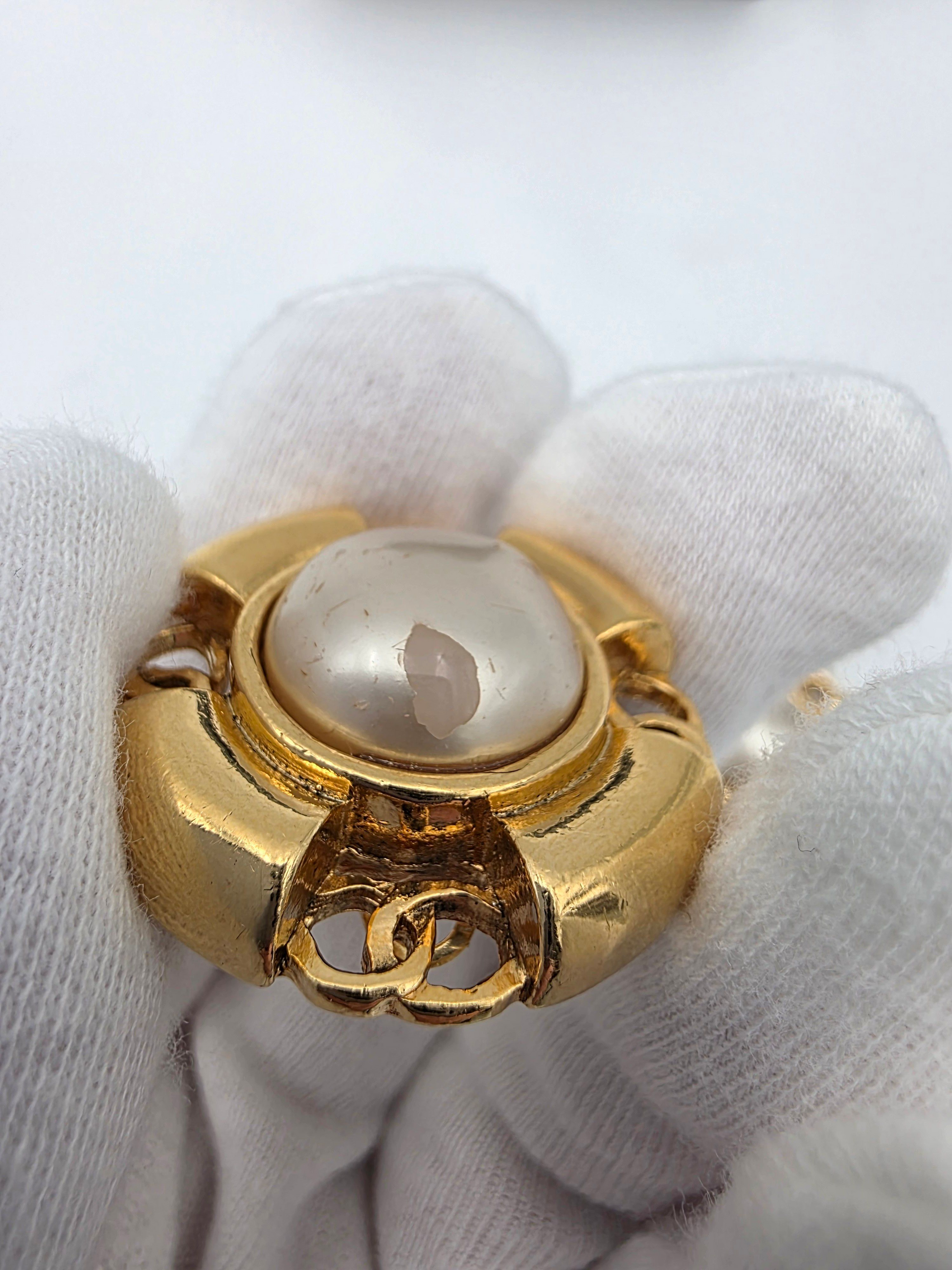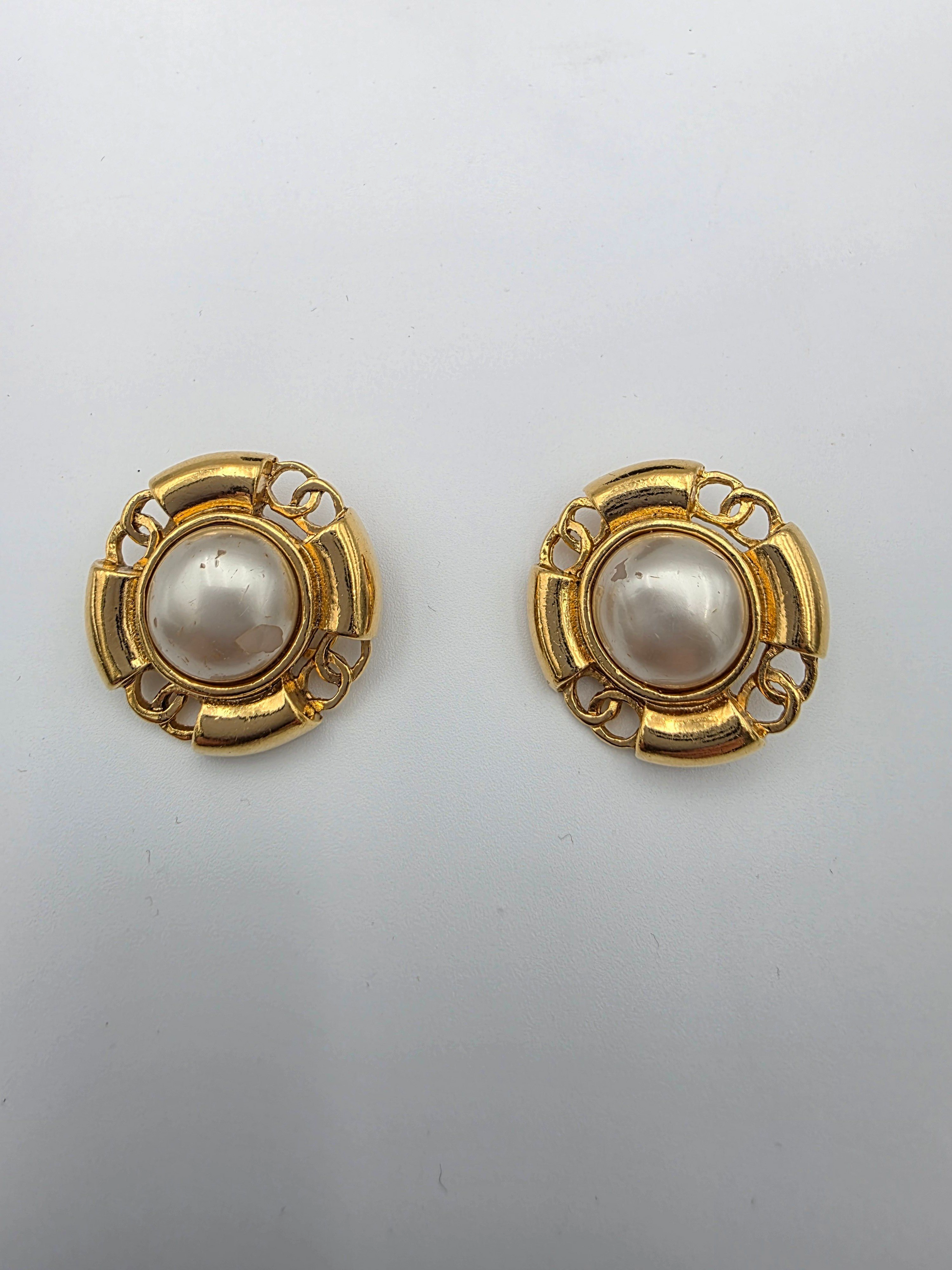 These Chanel Coco earrings feature a classic faux pearl design accented with gold-tone metal, offering a bold yet timeless Chanel look. The round silhouette and engraved detailing reflect the house’s iconic costume jewelry style from the era. In fair condition, the earrings show visible wear consistent with age and use, including chipping to the faux pearl finish. The box is included but shows wear, which is typical for vintage Chanel accessories. Despite these condition notes, the earrings remain a collectible statement piece with unmistakable Chanel character.