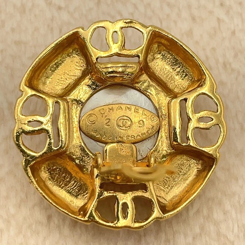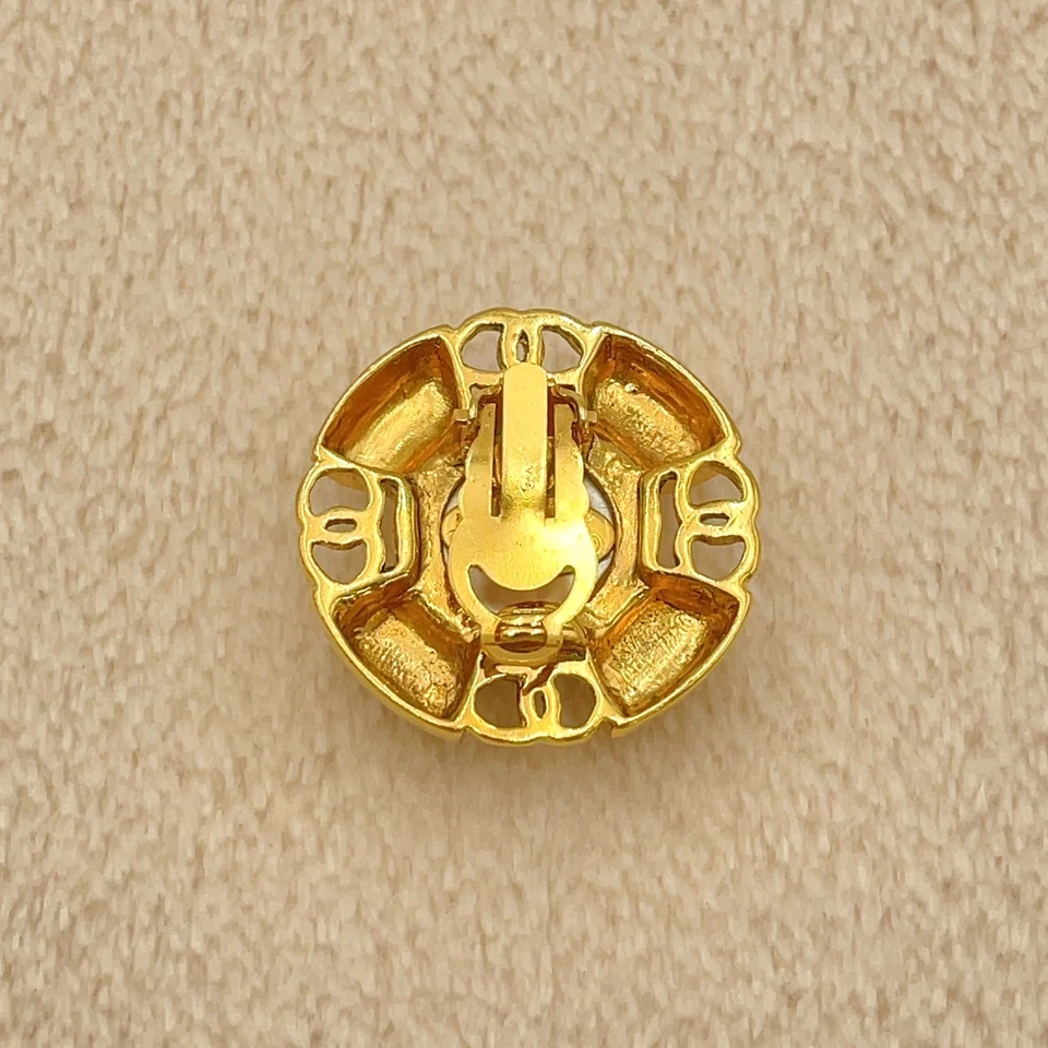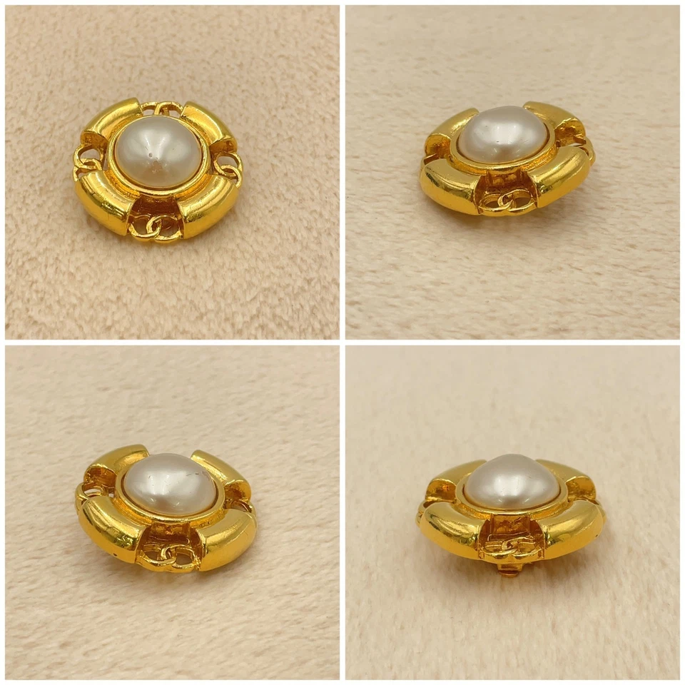 These Chanel Coco earrings feature a classic faux pearl design accented with gold-tone metal, offering a bold yet timeless Chanel look. The round silhouette and engraved detailing reflect the house’s iconic costume jewelry style from the era. In fair condition, the earrings show visible wear consistent with age and use, including chipping to the faux pearl finish. The box is included but shows wear, which is typical for vintage Chanel accessories. Despite these condition notes, the earrings remain a collectible statement piece with unmistakable Chanel character.