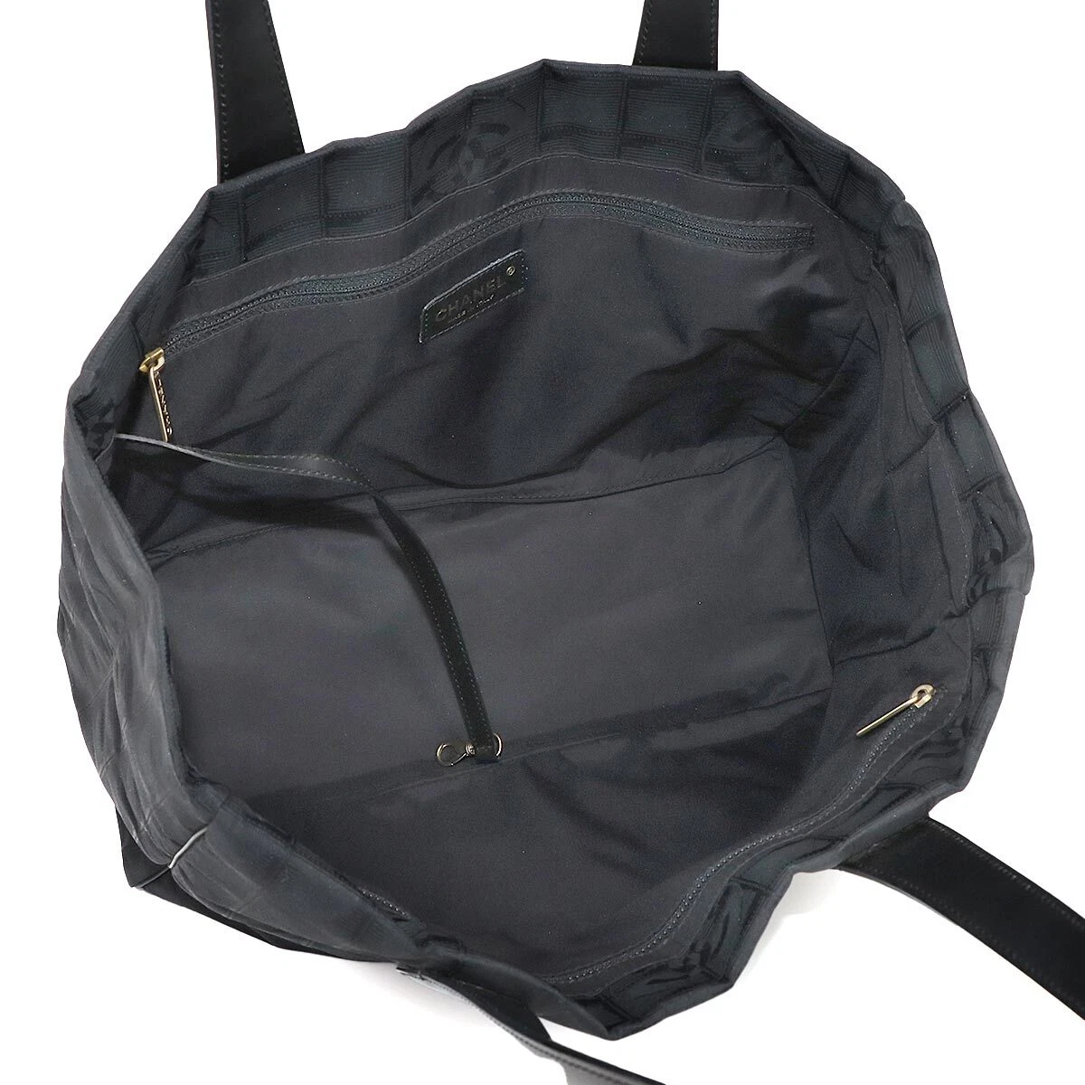 Exterior shows minimal wear with subtle handle wrinkles, minor friction marks on the vanish coating, and slight plating peeling on bottom studs. Interior exhibits professional-grade condition with nominal fluffing on the tag leather and inconsequential friction marks and soil deposits. This authentic CHANEL Travel Line Tote maintains excellent structural integrity despite these minor cosmetic considerations.