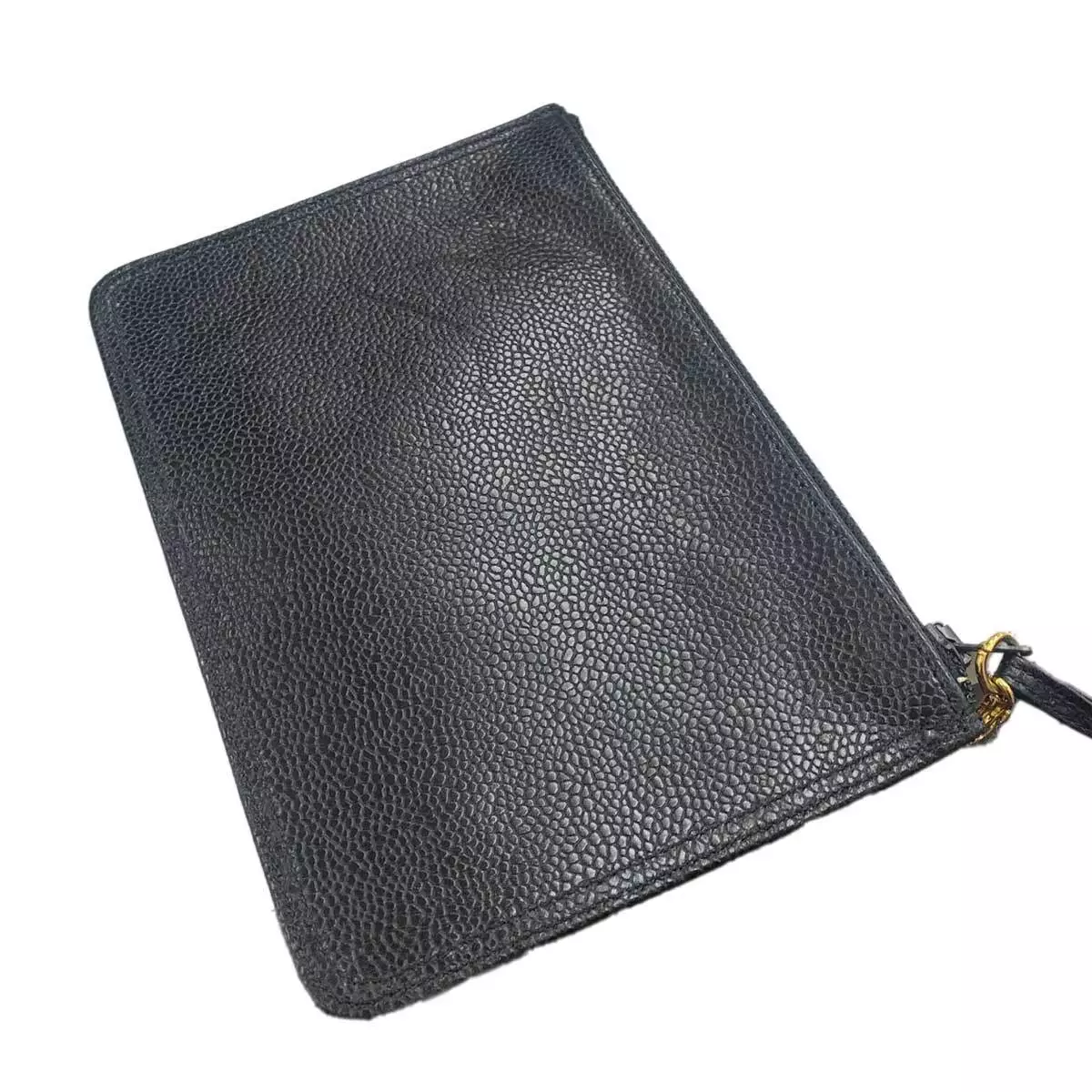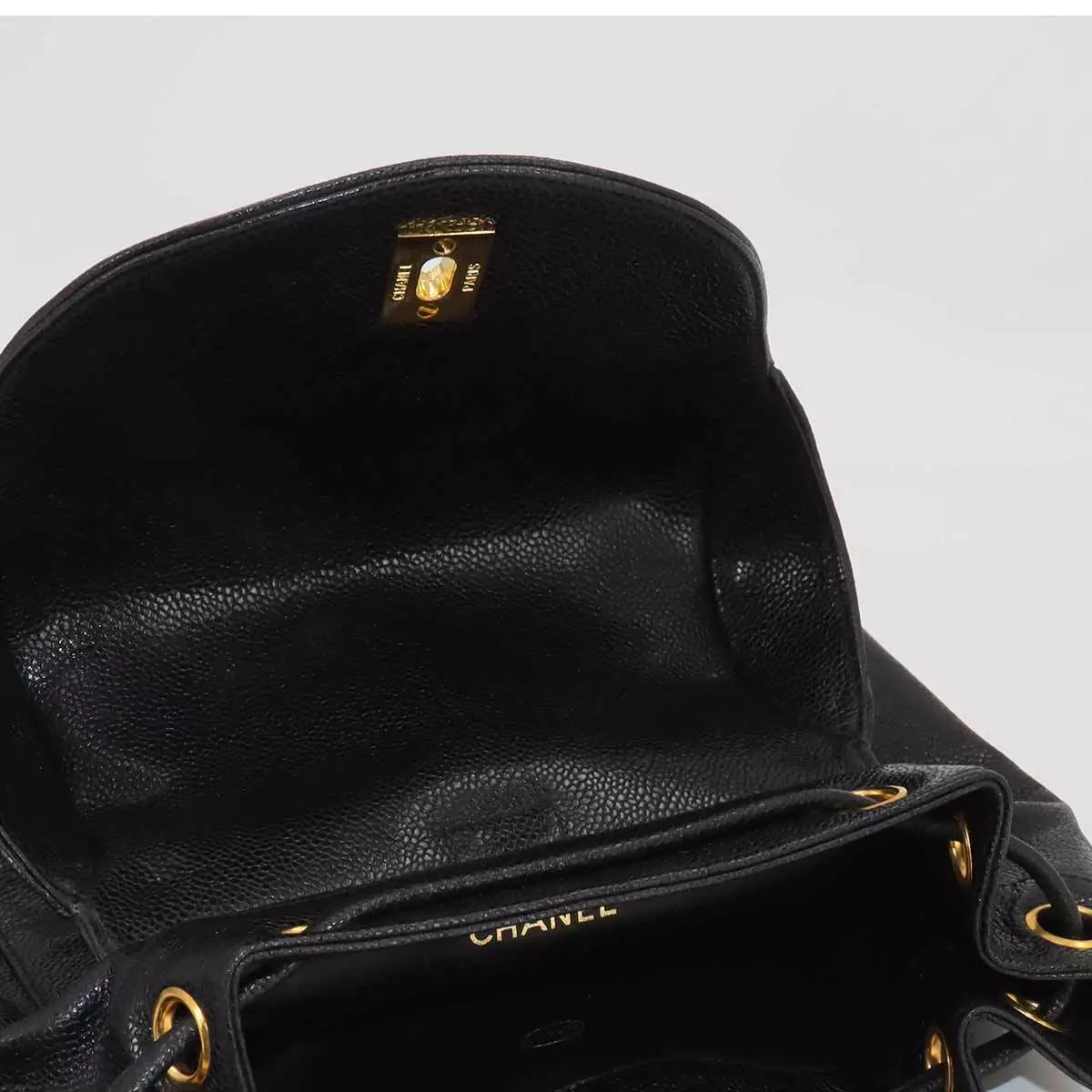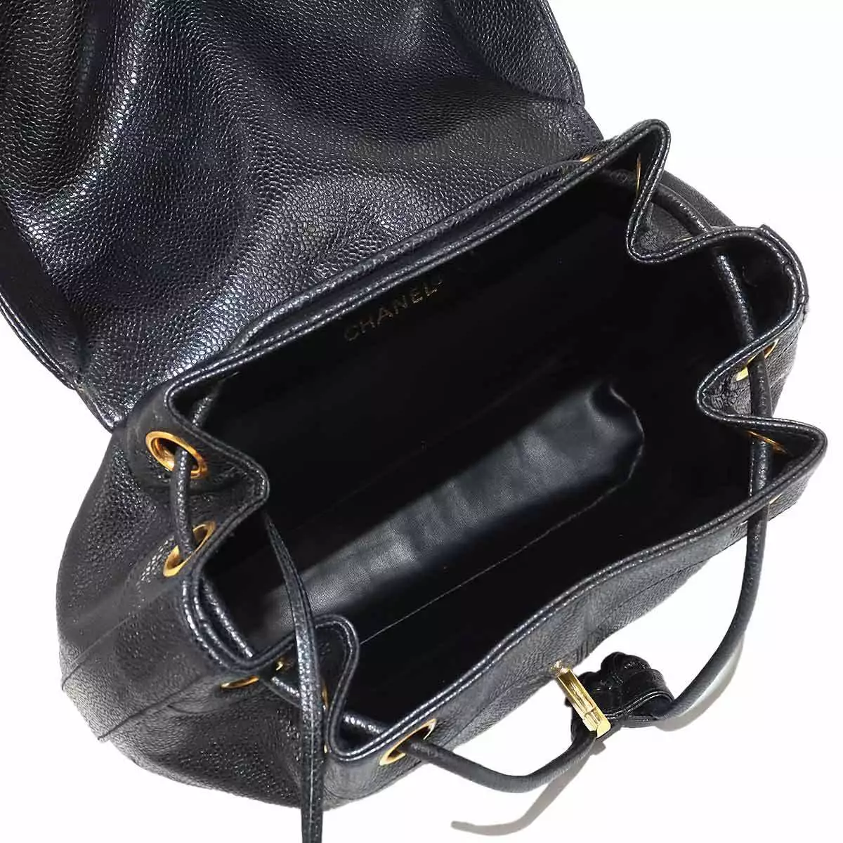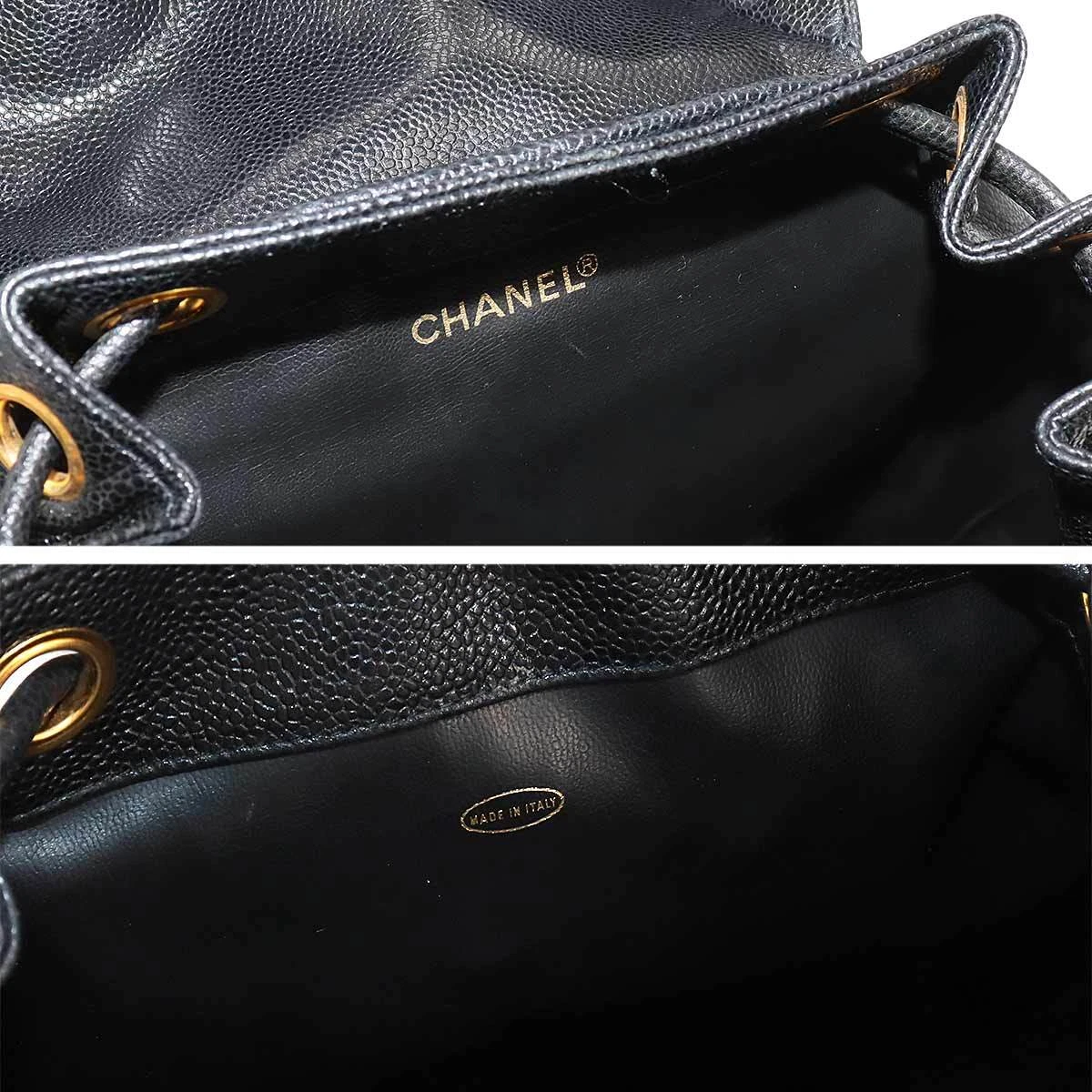 The exterior of this CHANEL Triple Coco Chain Backpack presents minimal surface abrasions, with isolated friction marks and minor scratches evident on both the caviar skin leather and metal hardware components. Interior assessment reveals comparable condition characteristics, with limited wear patterns consisting of slight friction points and superficial scratches on interior leather and metal elements.