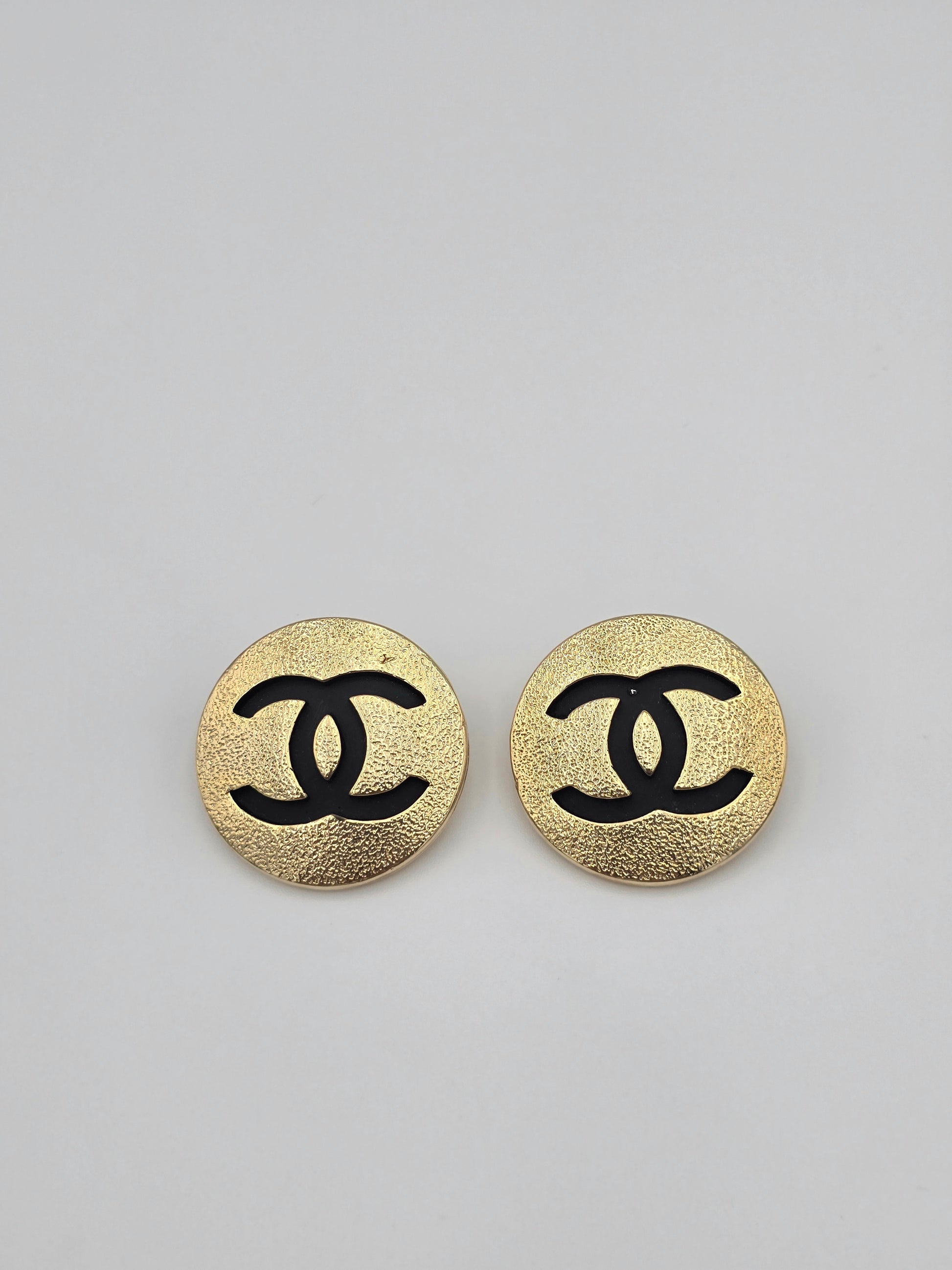 In Excellent condition, these Chanel Vintage 1980s medallion earrings showcase the classic CC logo in a textured gold tone, complemented by black accents. Designed with a secure clip-on closure, they offer comfortable wear without pierced ears. Their timeless style and impeccable craftsmanship make these earrings a distinguished accessory for collectors and fashion connoisseurs alike. Ideal for elevating both formal and casual looks with a touch of iconic luxury.
