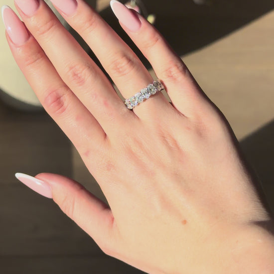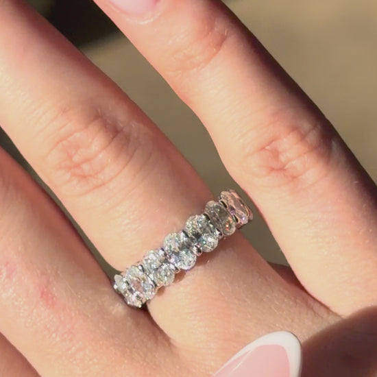 This elegant diamond band showcases approximately 6 carats total weight of brilliant-cut diamonds, arranged in a continuous row for a striking yet refined presence. Each stone is graded D color and VVS clarity, offering exceptional brightness and crisp light return. Set in polished 14k white gold, the clean band structure allows the diamonds’ brilliance to take focus, creating a timeless piece that can be worn alone or paired with other rings for added impact.