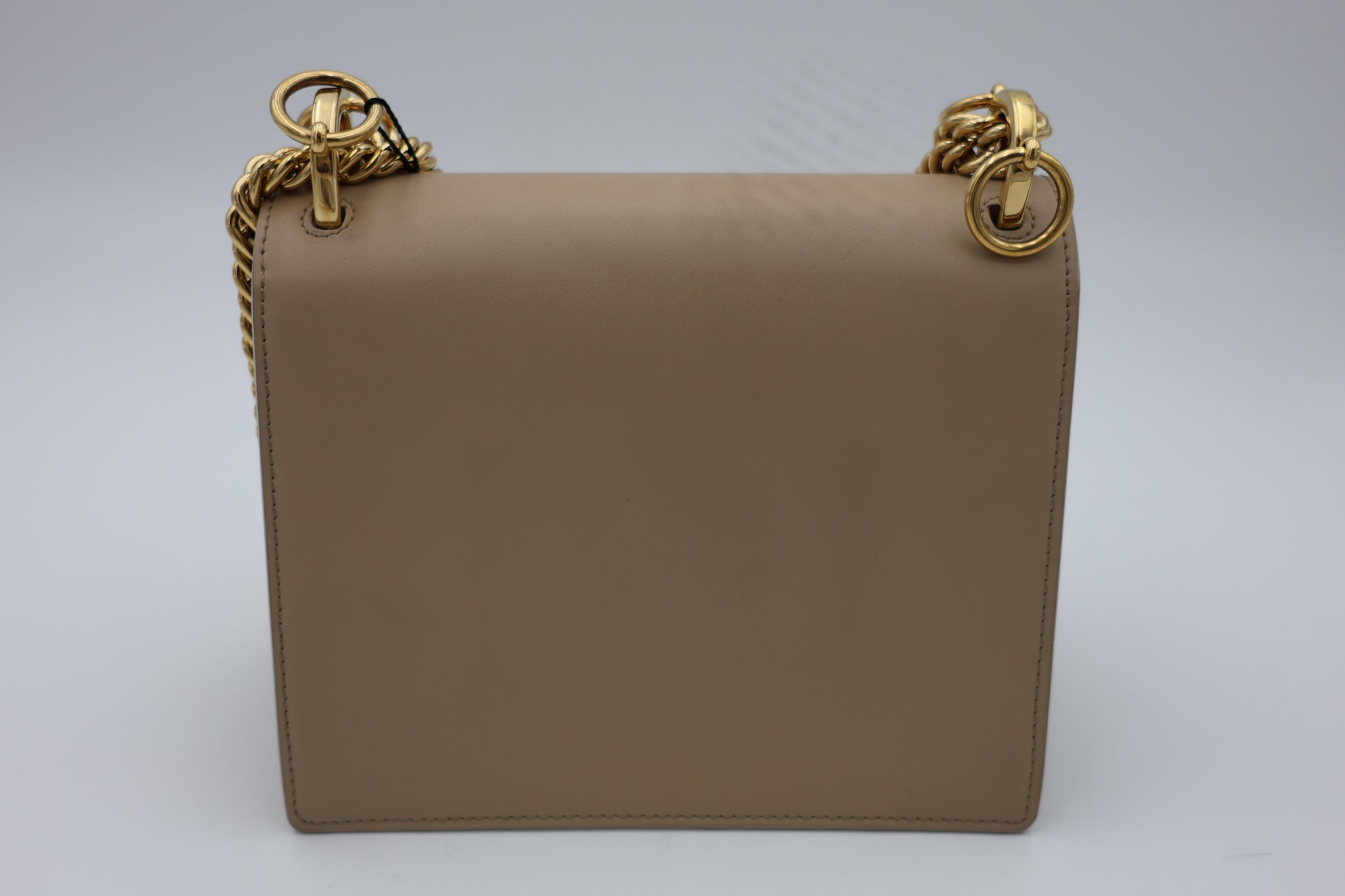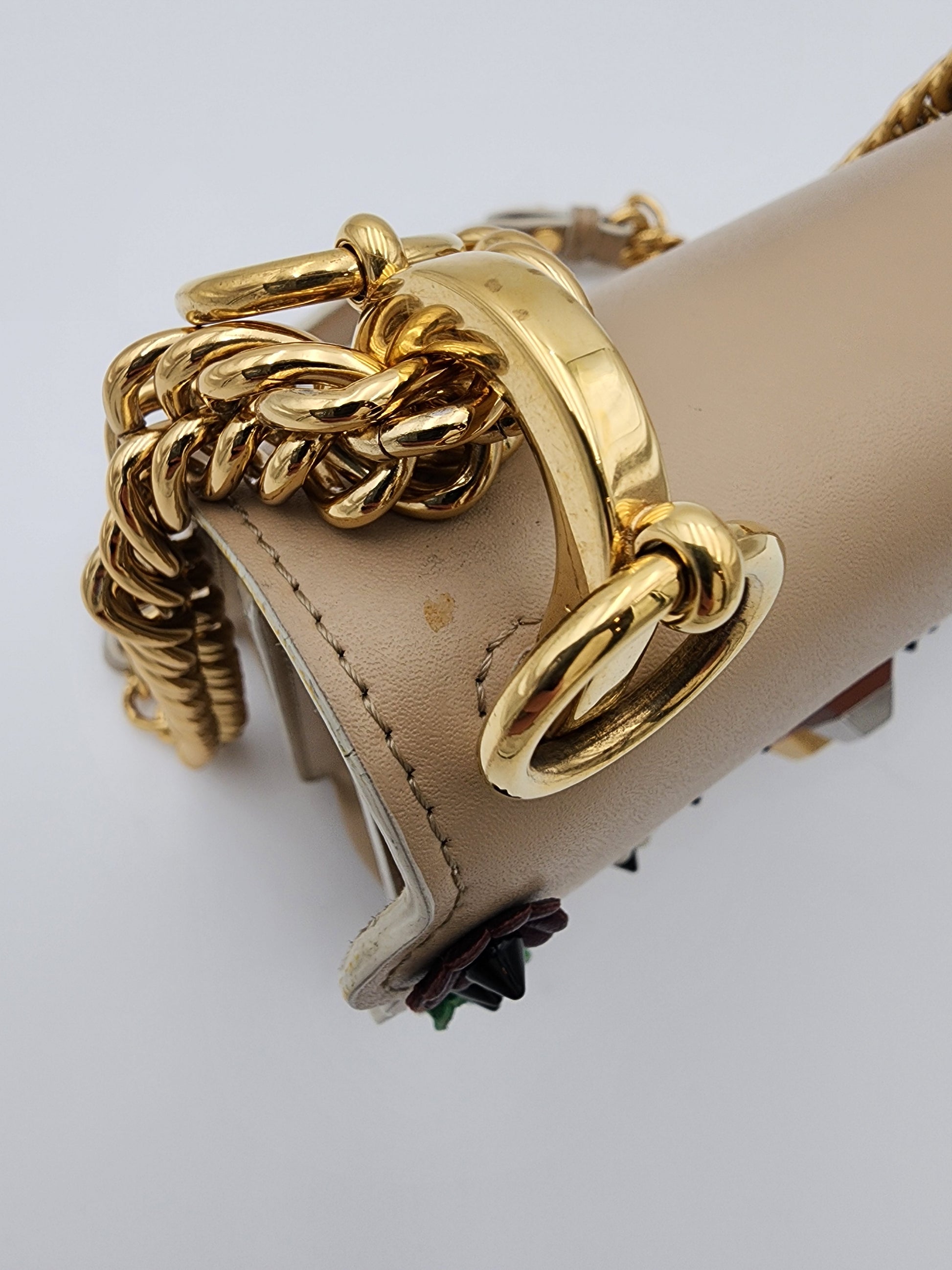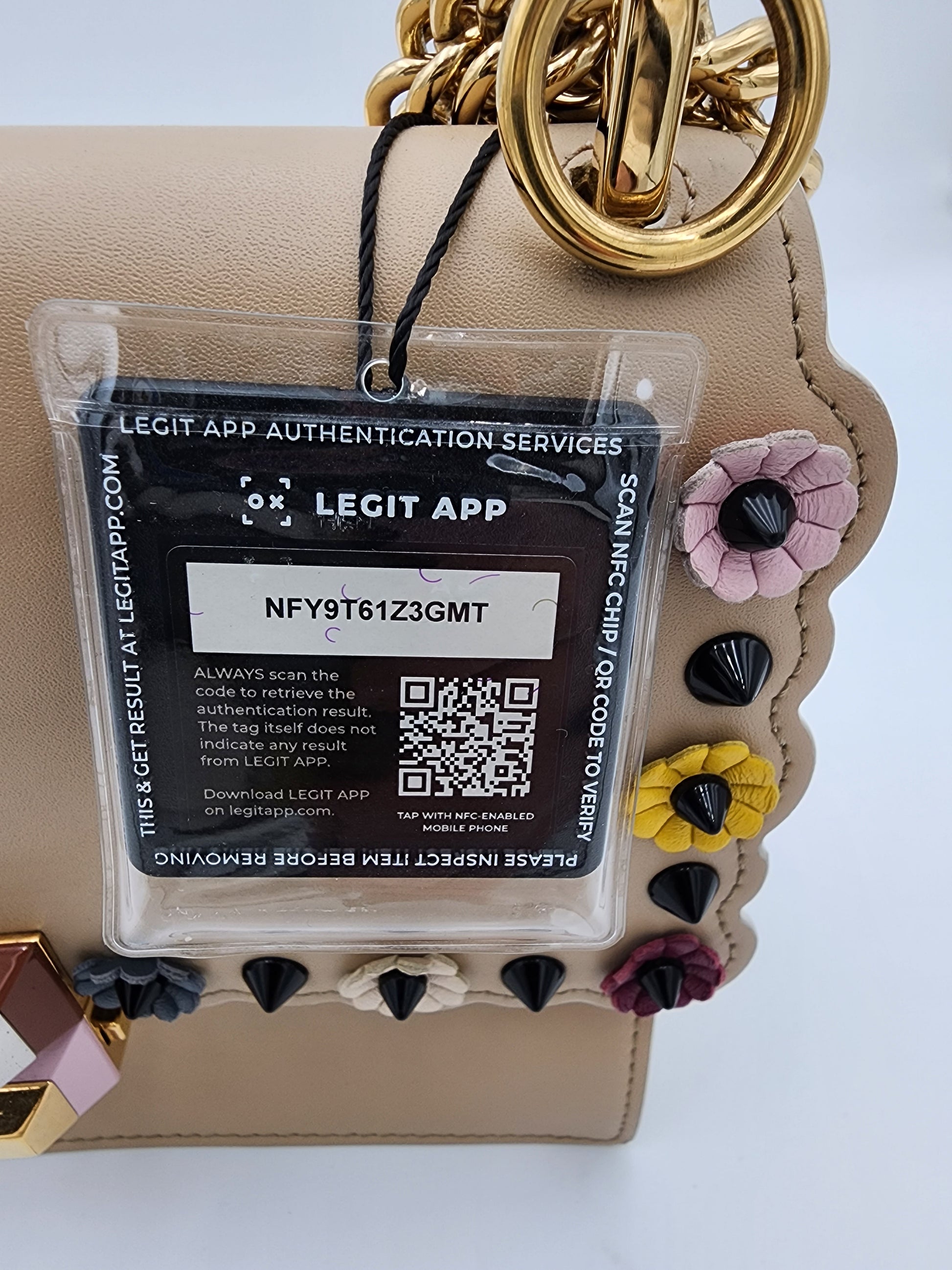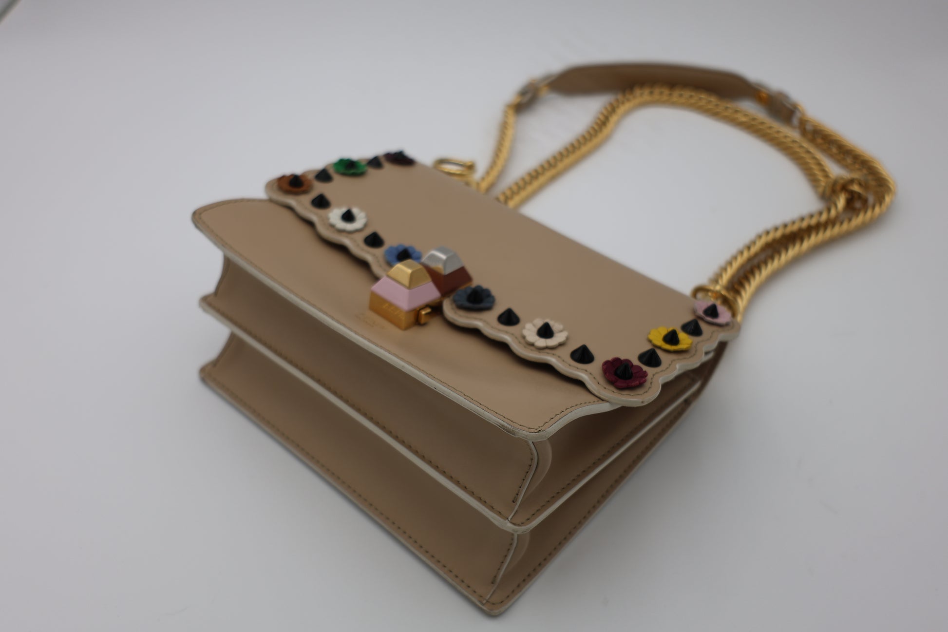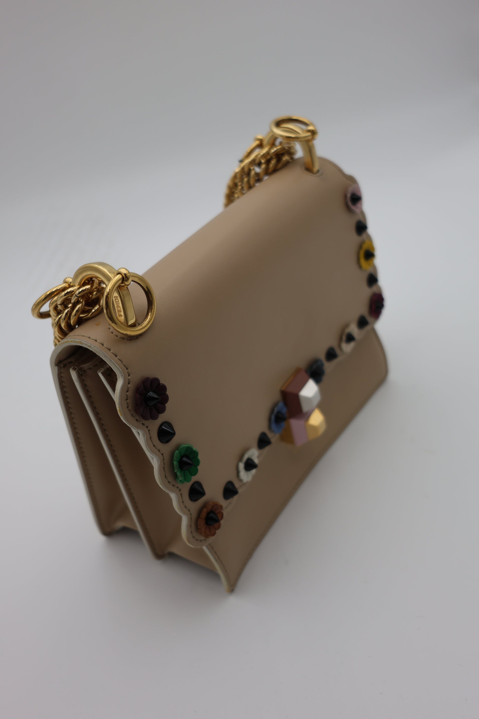 This Fendi Mini Kan I bag is crafted from smooth beige calfskin leather and defined by its distinctive scalloped edges, lending a playful yet precise silhouette. Multicolor leather floral appliqués and black pyramid studs add dimensional contrast, creating a layered, decorative finish that reflects Fendi’s inventive approach to design. The flap is secured with a metal and resin push-clasp closure, and the sliding chain strap allows the bag to be worn at varying lengths for shoulder or crossbody styling. Inside, a suede-lined interior is arranged with two compartments and a flat pocket, maintaining both structure and organization within its compact form.