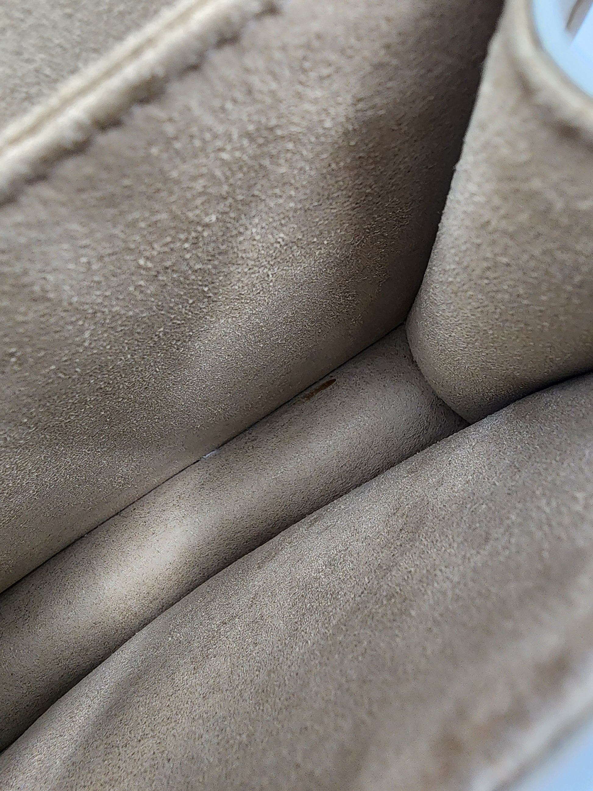 - There is a small mark visible on the front and some stains in the interior, while the leather, and hardware remain clean and well preserved.