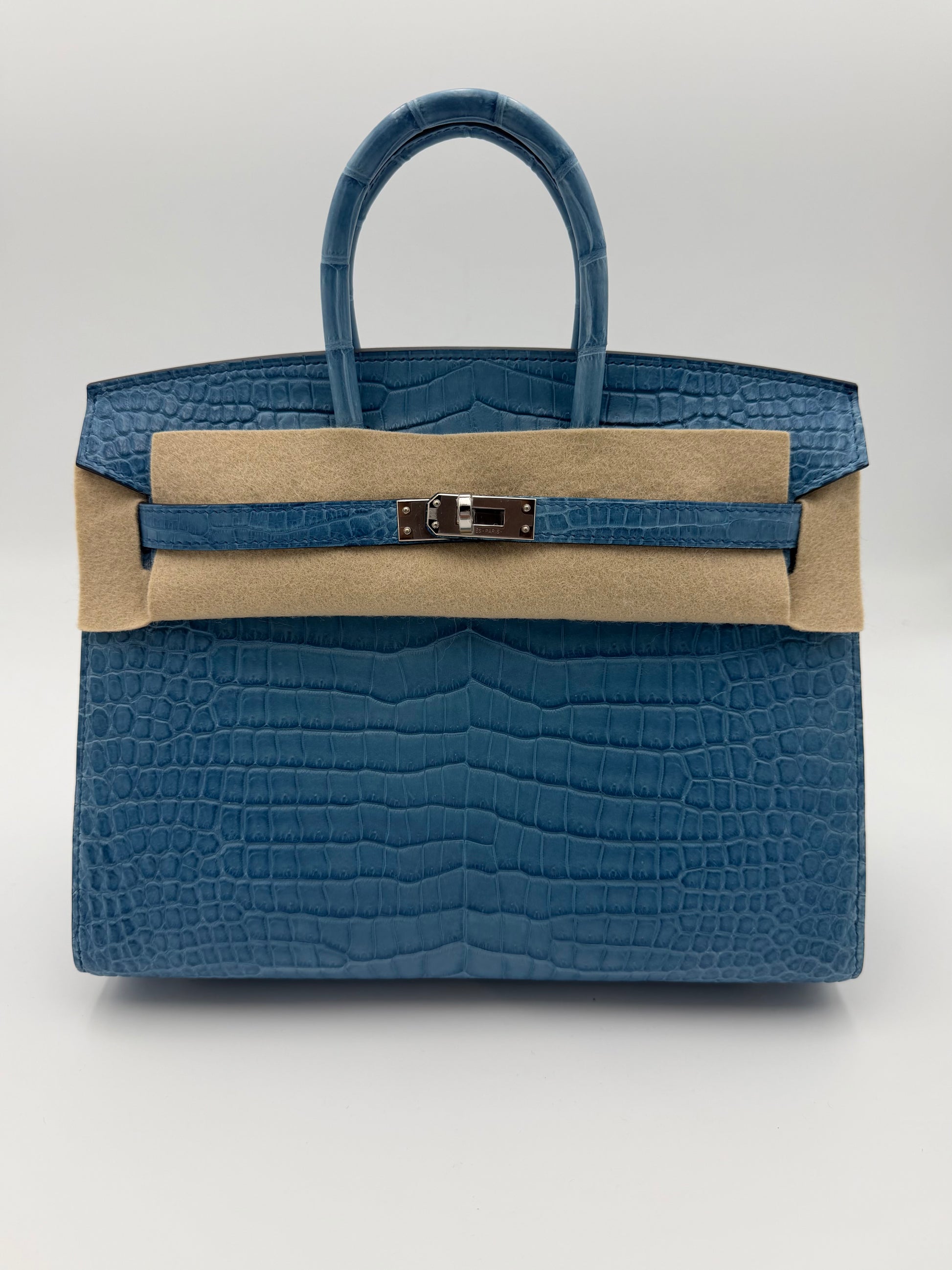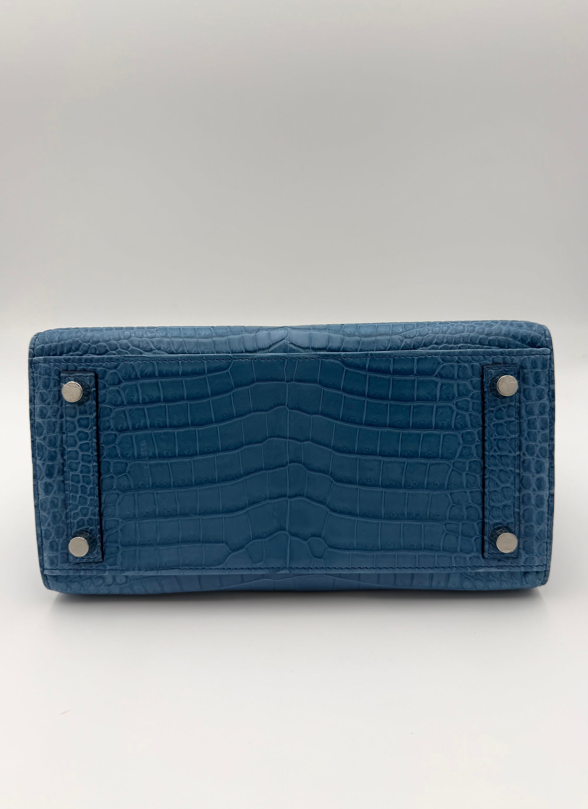 This extraordinarily rare Hermès Birkin 25 Sellier is crafted from Matte Mykonos Blue Porosus Crocodile, the most coveted exotic leather in the Hermès universe. Porosus crocodile, sourced primarily from Australia, is prized for its exceptionally fine, tight scales and unmistakable natural pore pattern, giving the bag a refined texture and a luxurious matte finish. Paired with sleek palladium hardware and the crisp Sellier construction, this piece embodies elegance, exclusivity, and advanced craftsmanship.