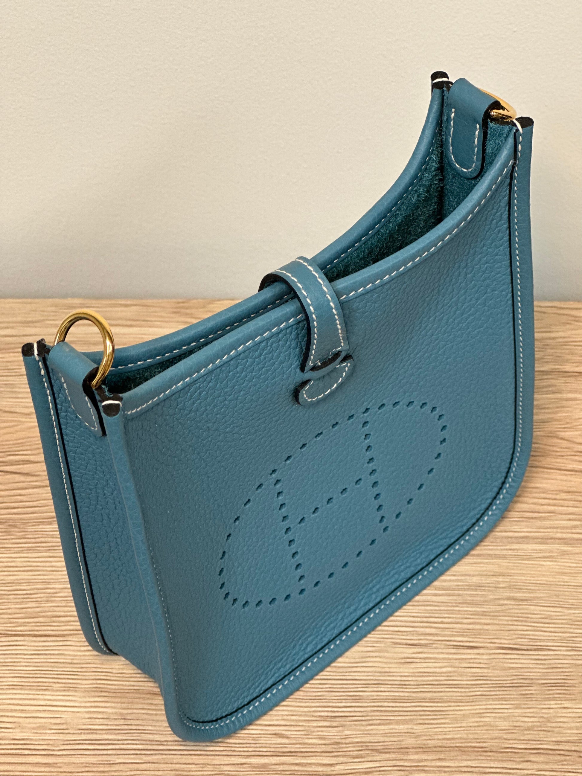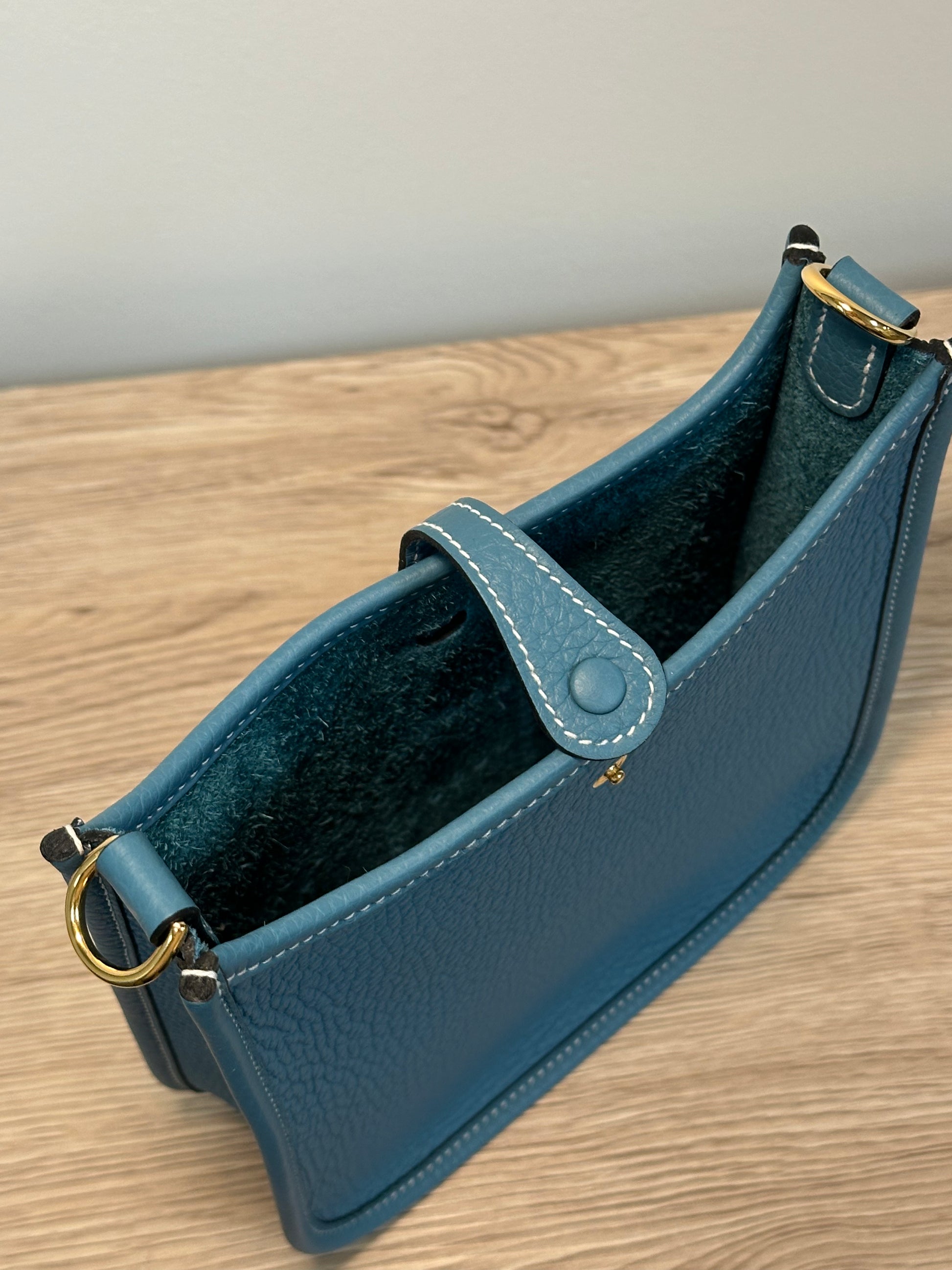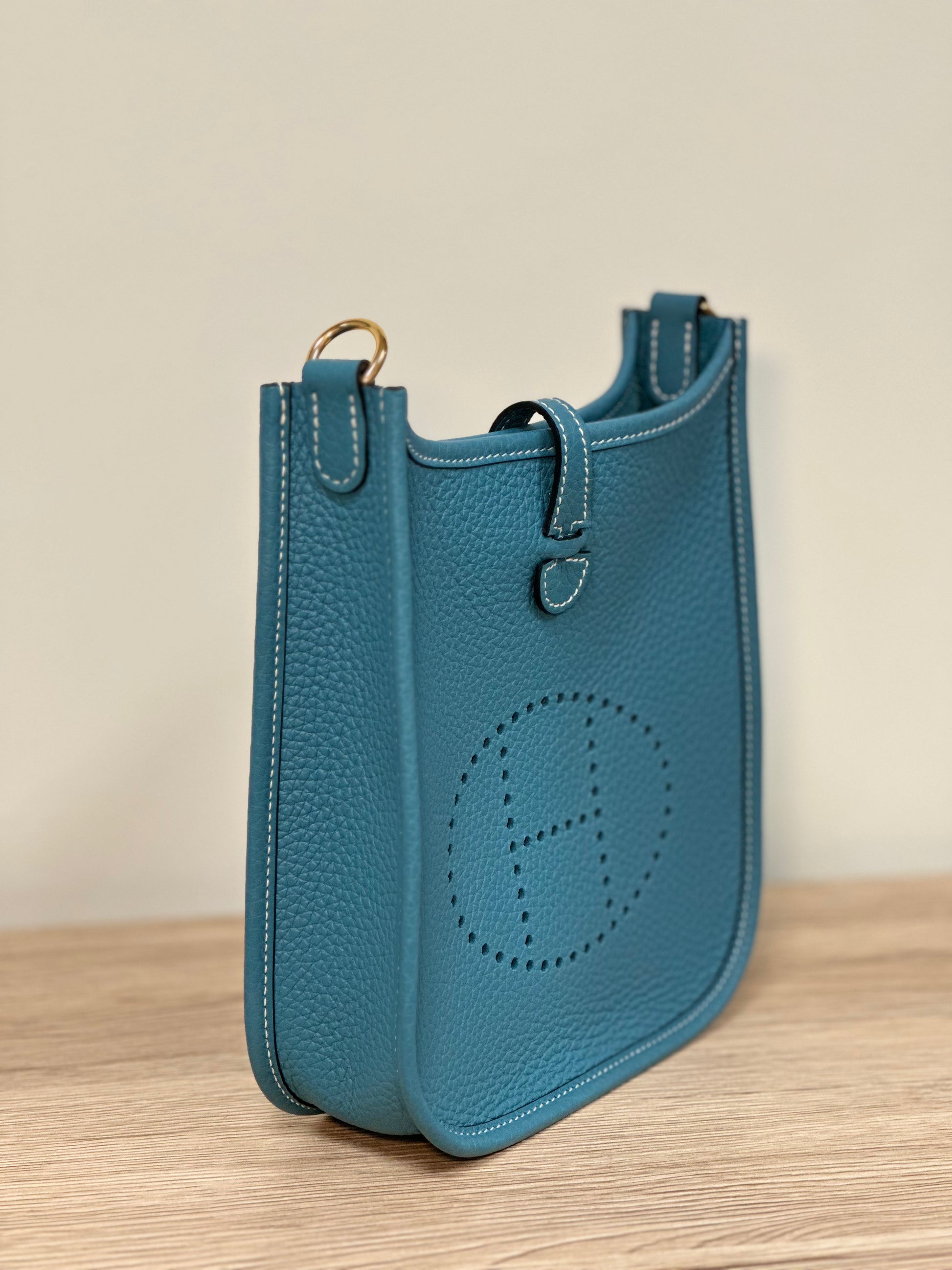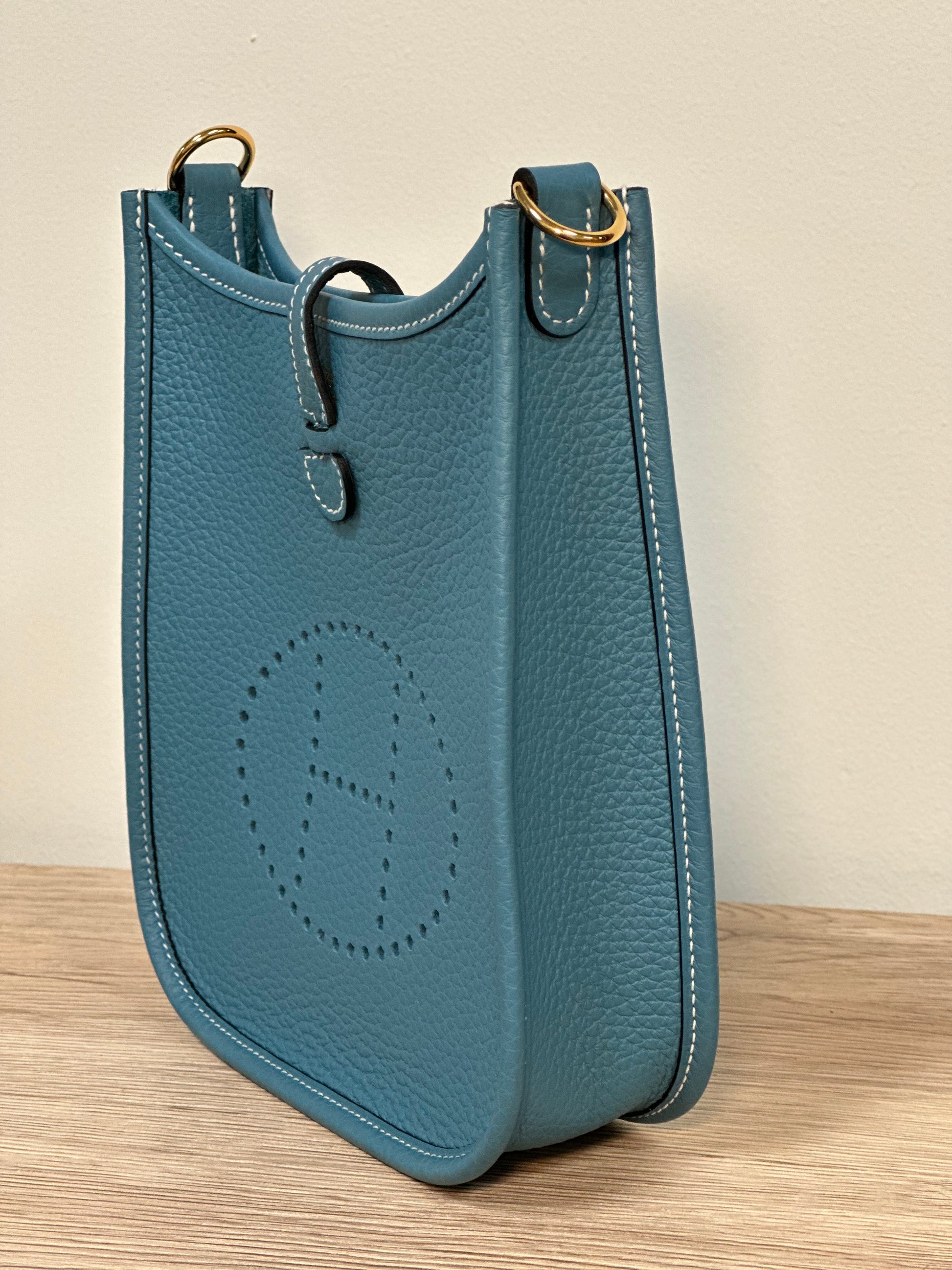 This Hermès Evelyne 16 TPM Crossbody Bag is crafted from New Bleu Jean (jeans blue) Taurillon Clemence leather and features a matching uni wool sangle strap. The design includes the signature perforated leather "H," a leather tab closure, and elegant gold-plated hardware.