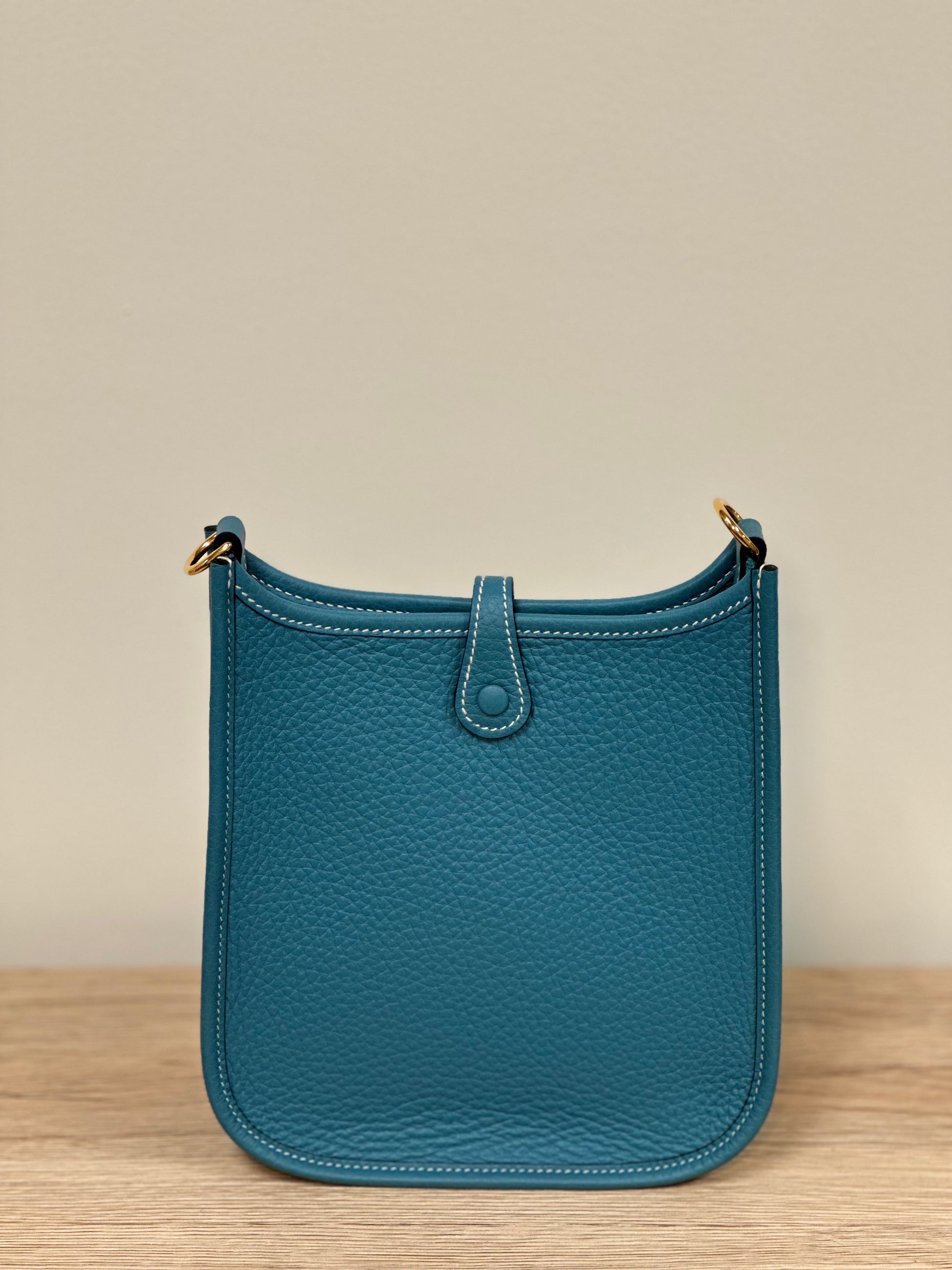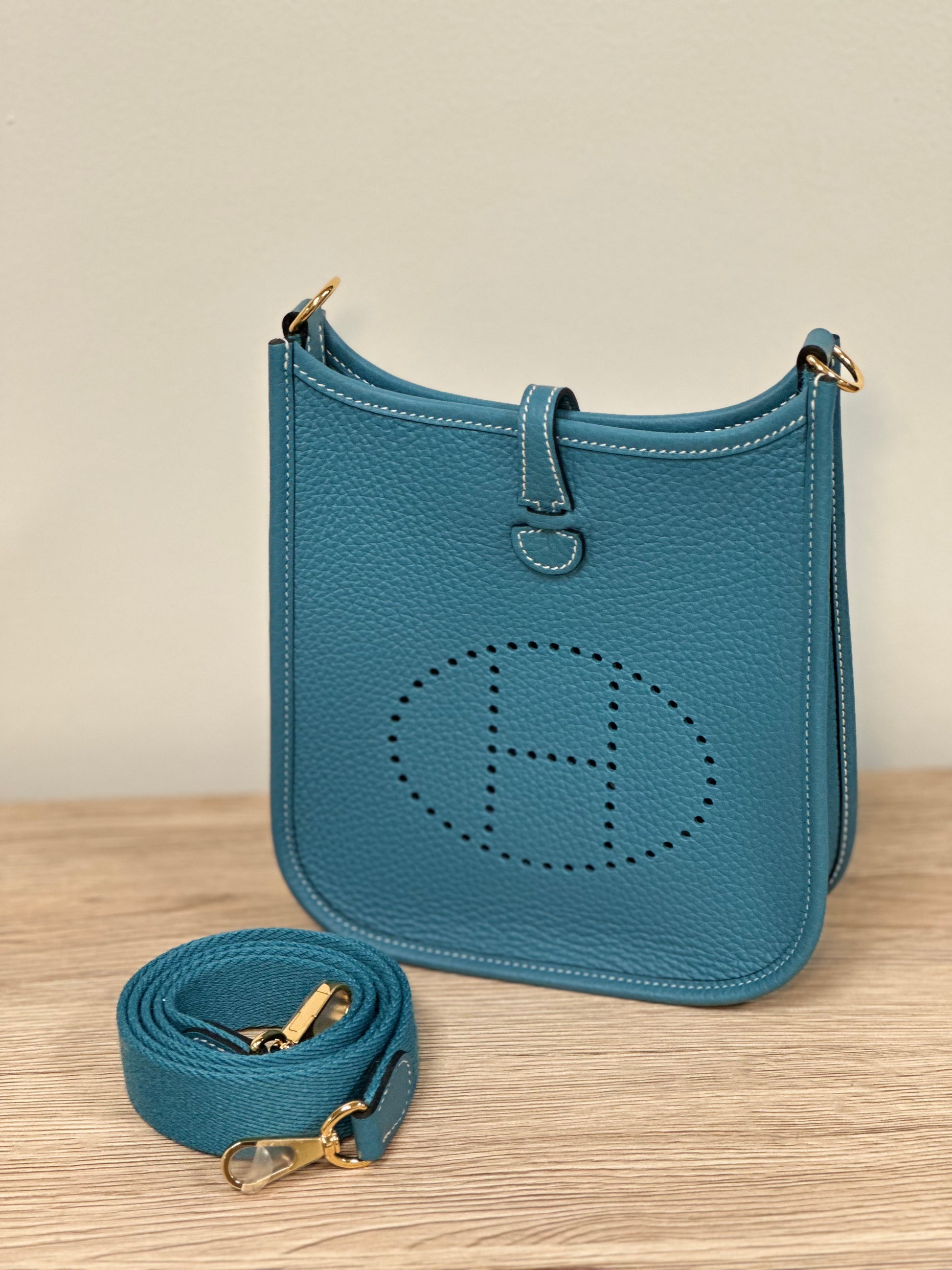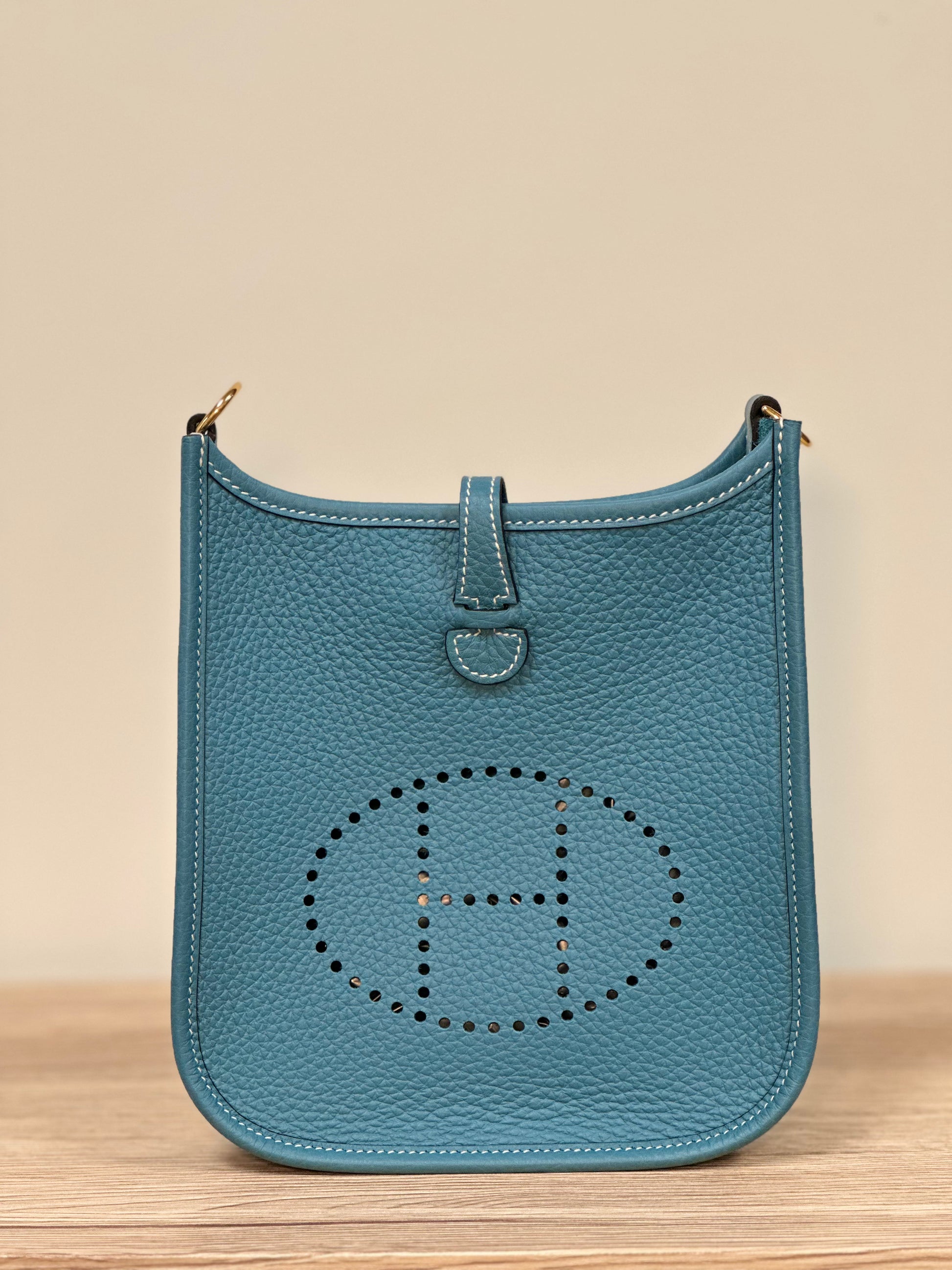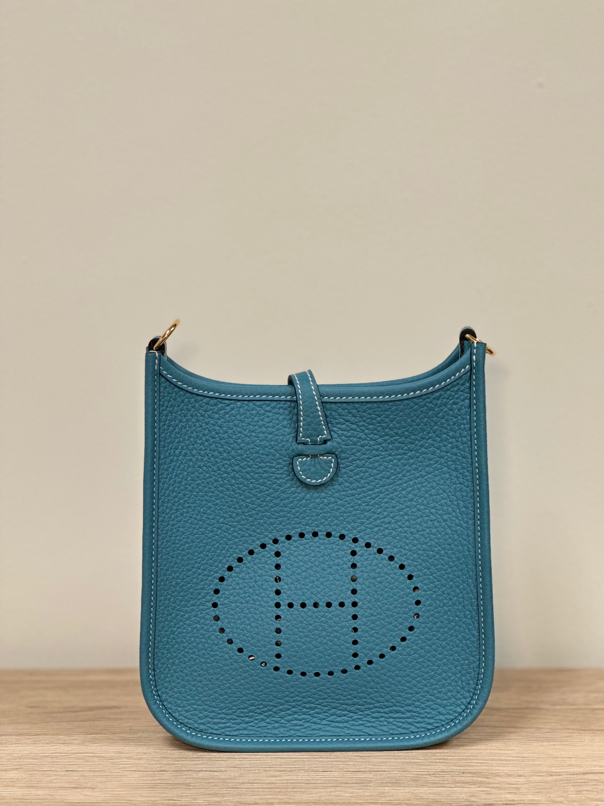 This Hermès Evelyne 16 TPM Crossbody Bag is crafted from New Bleu Jean (jeans blue) Taurillon Clemence leather and features a matching uni wool sangle strap. The design includes the signature perforated leather "H," a leather tab closure, and elegant gold-plated hardware.