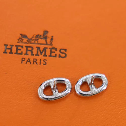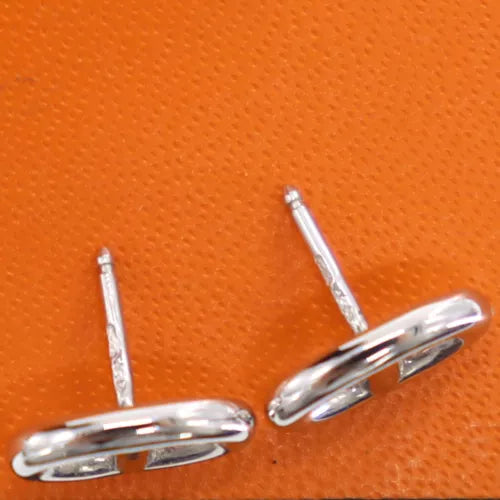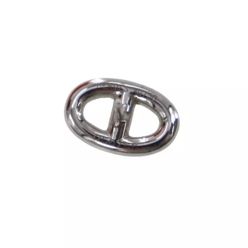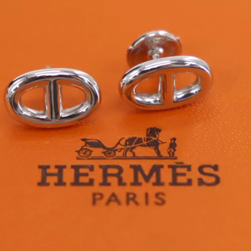 Pre-owned Hermès Chaine d'Ancle Enchene Earrings in Ag750 Silver with an elegant elliptical shape. The earrings show signs of regular use with some damages, including a scratch and one broken catch. One screw back is broken and cannot be used. Despite the condition, the earrings retain their classic Hermès charm.