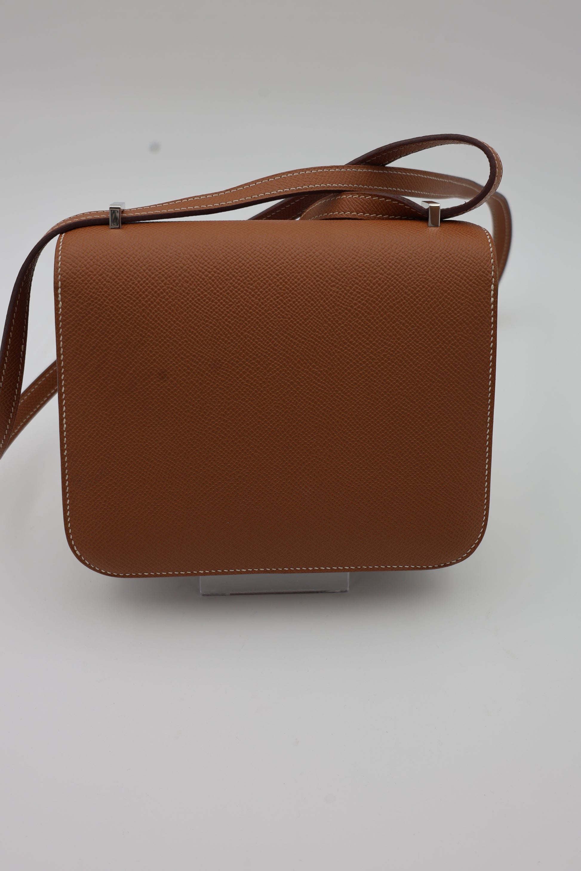 The Constance 18 is one of Hermès’ most recognizable silhouettes, defined by its clean lines and iconic “H” clasp. Rendered in the house’s signature Gold color, the warm caramel tone is complemented by contrast white stitching, a hallmark of Hermès craftsmanship. Crafted from Epsom leather, a structured and durable calfskin with a refined grain, the bag maintains a crisp, architectural shape. The palladium hardware offers a cool-toned contrast, centering the design around the signature snap-lock closure. The interior is thoughtfully organized with dual compartments and a slip pocket, while the adjustable leather strap allows for both shoulder and crossbody wear.