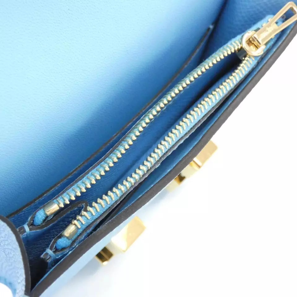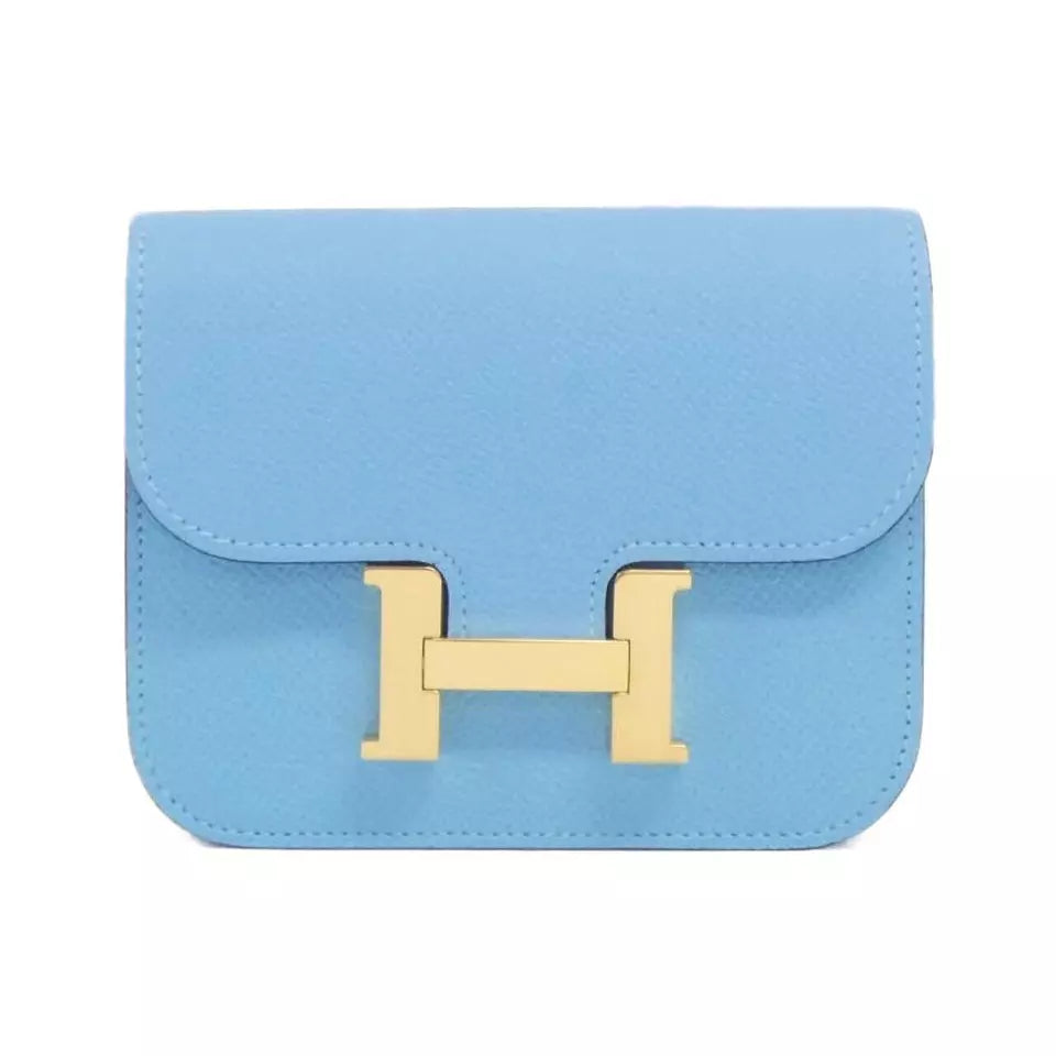 This authentic Hermes Constance Slim Wallet in Celeste with Palladium hardware is a luxurious and stylish accessory. Made from Epson leather, this unisex wallet is compact and practical, featuring two inside pockets and a coin case. Despite being a pre-owned item, it is in mint condition with minimal signs of wear such as partial rubbing, blackening, small scratches, and minor discoloration. Comes with the original dust bag and box.