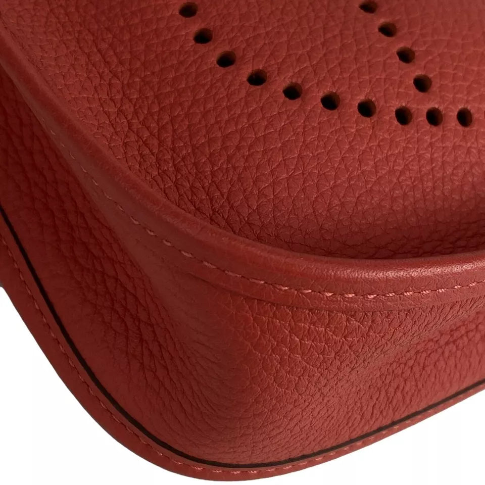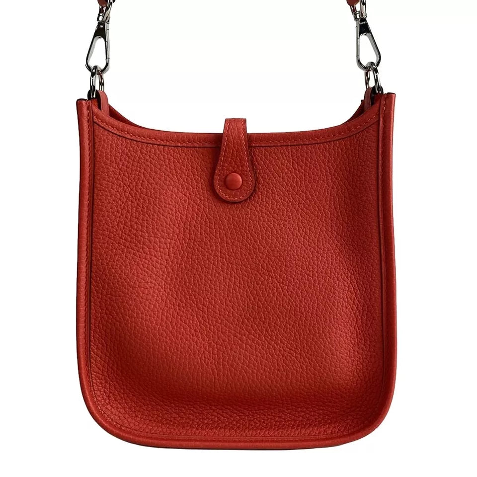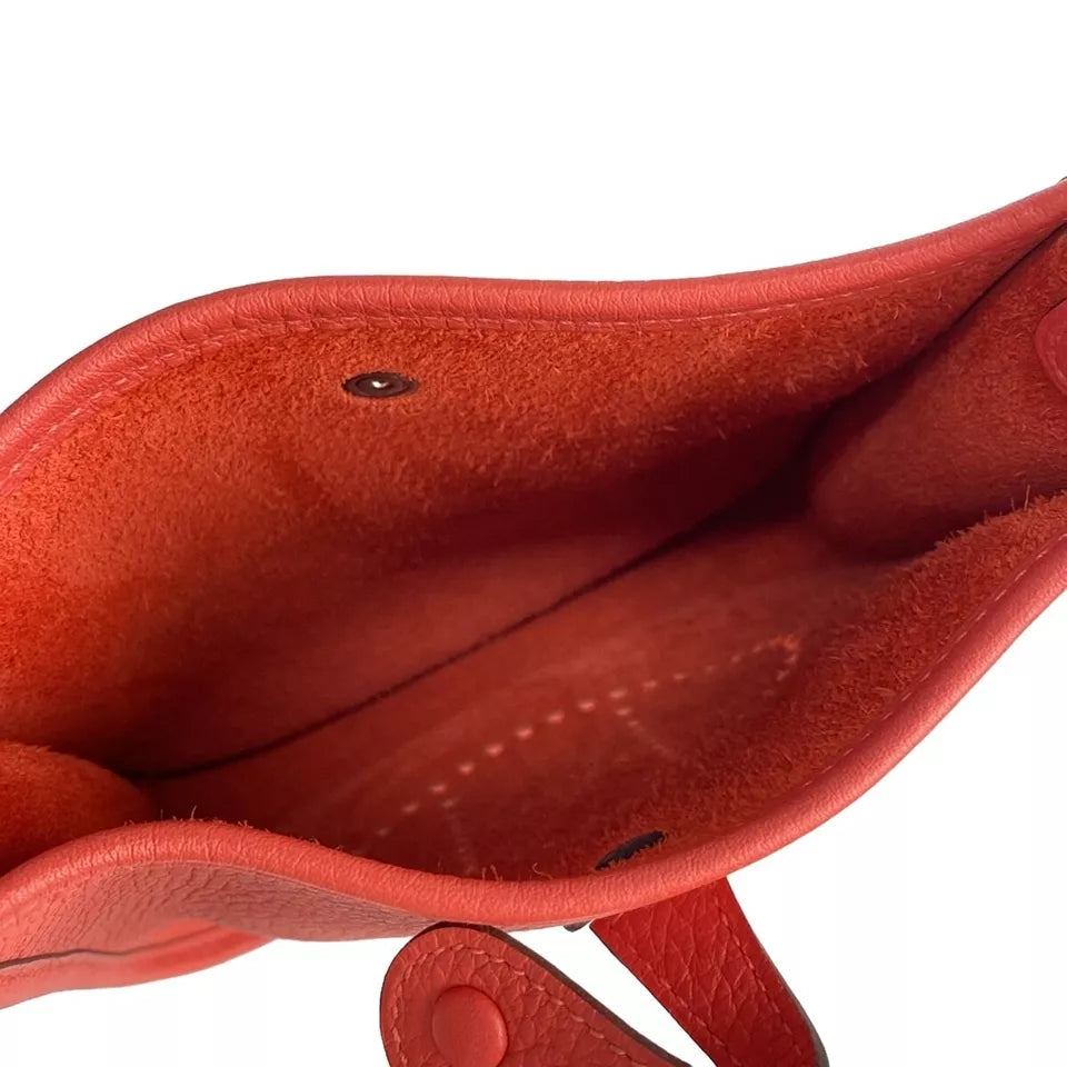 The HERMES Evelyne TPM Amazone is a stunning shoulder bag crafted from luxurious Taurillon Clemence leather in the striking Rouge Pivoine color. This compact and elegant bag features a perforated H logo on the front and is perfect for adding a pop of color to any outfit. The bag is lightweight and designed for everyday use.