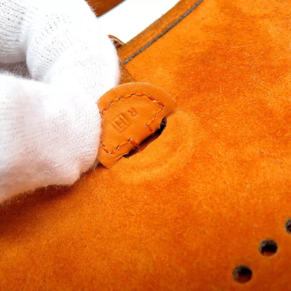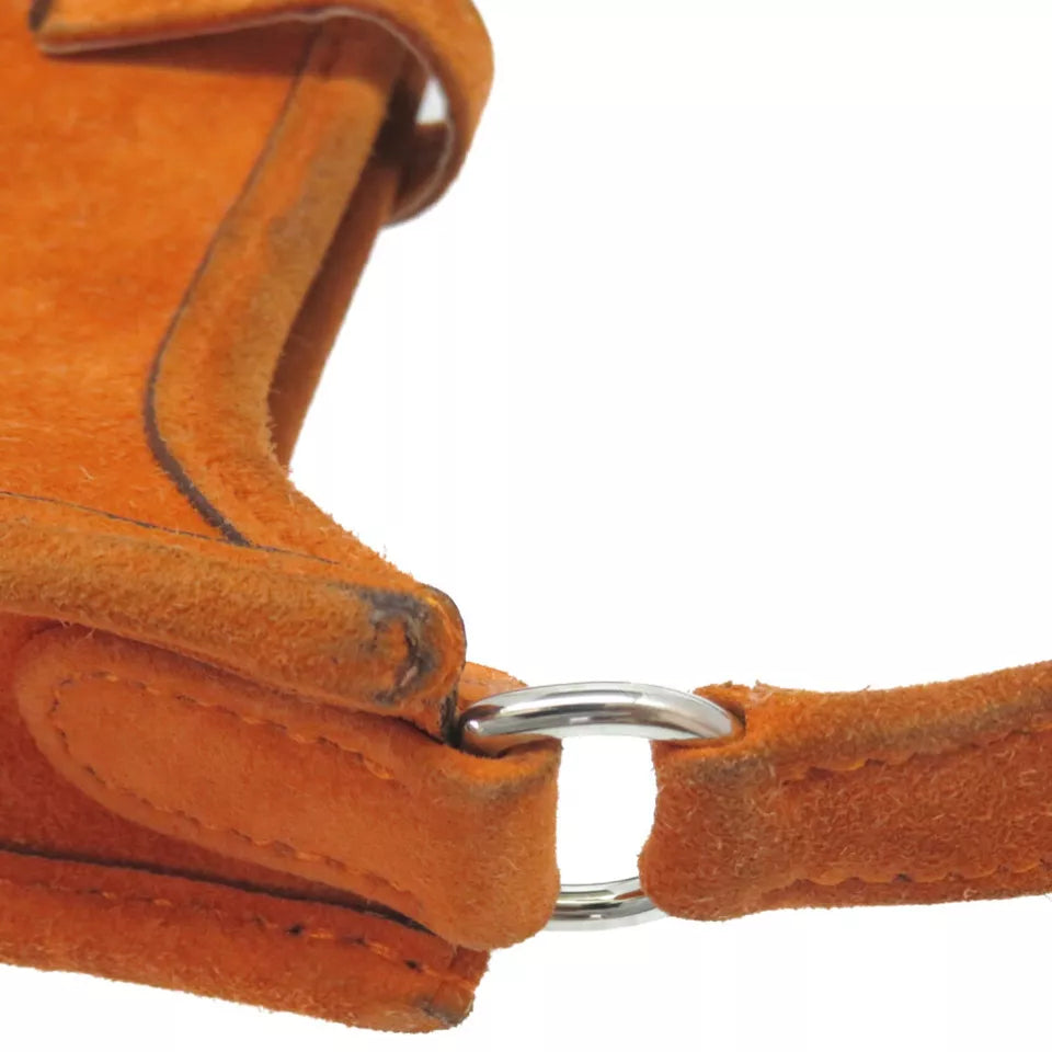 This authentic Hermes Evelyne TPM Shoulder Bag in vibrant orange is crafted from Doblis leather, giving it a soft and luxurious feel. Manufactured in France in 2004, this bag features a compact design perfect for casual outings. It shows signs of regular use, including fluffing, edge thread darkening, and some stains.