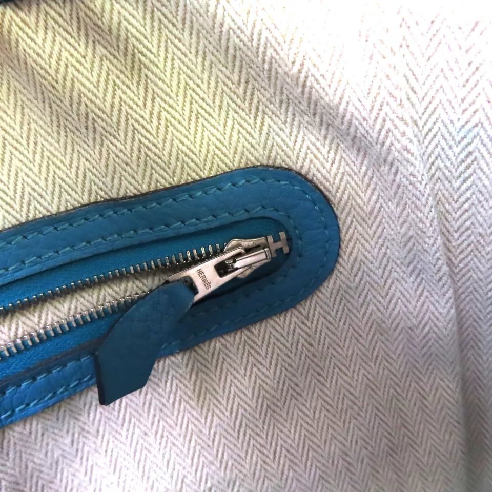 This Hermes Garden Party TPM Tote Bag in stunning Turquoise Blue is crafted from luxurious Negonda leather and calfskin, providing both durability and a stylish appearance. The tote features a spacious interior with an interior zip pocket and a hook button closure, making it both practical and chic. Perfect for everyday use, this bag adds a vibrant pop of color to any ensemble.