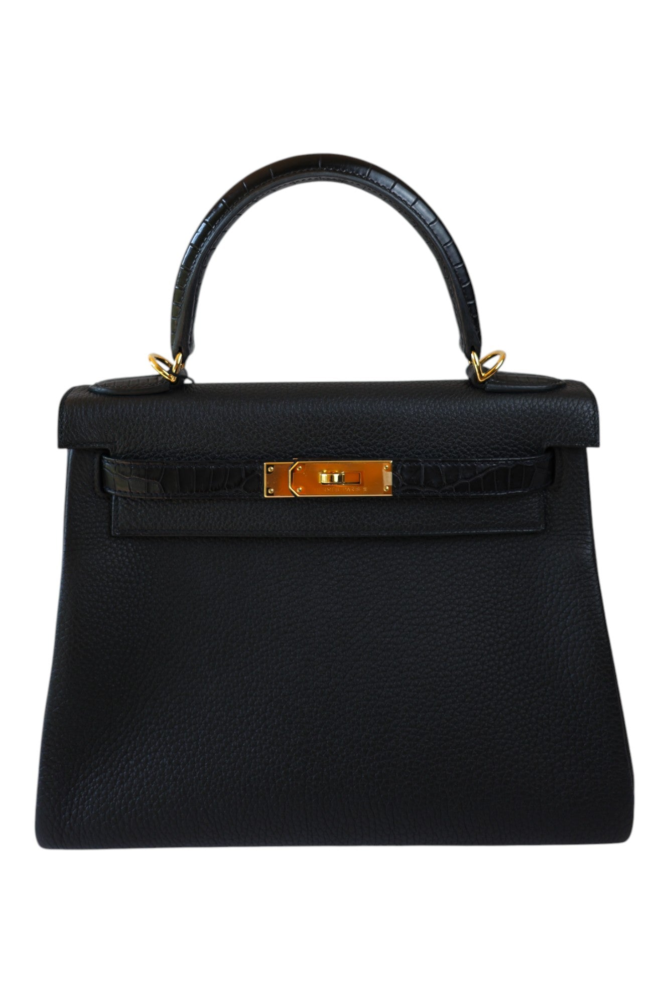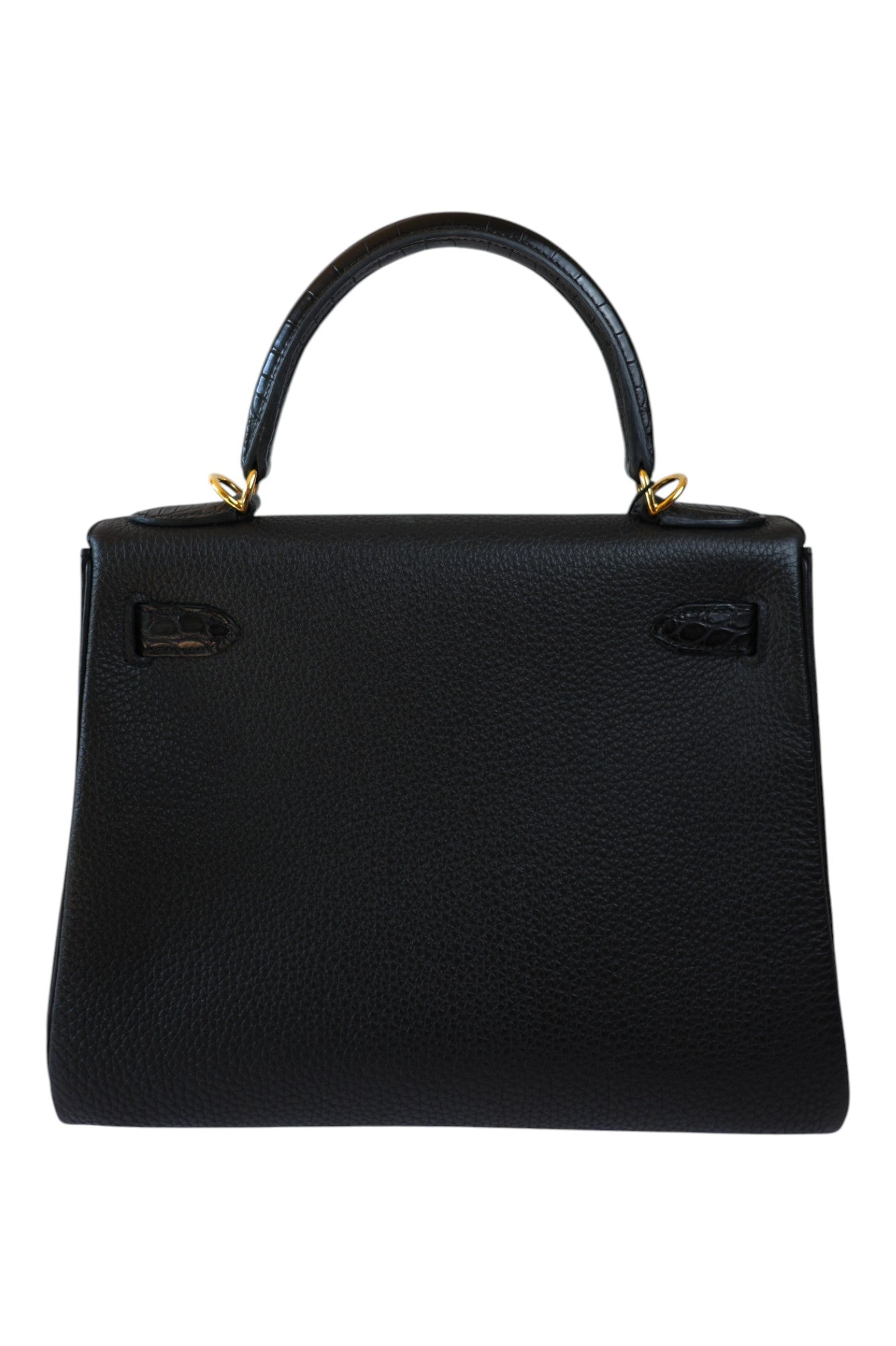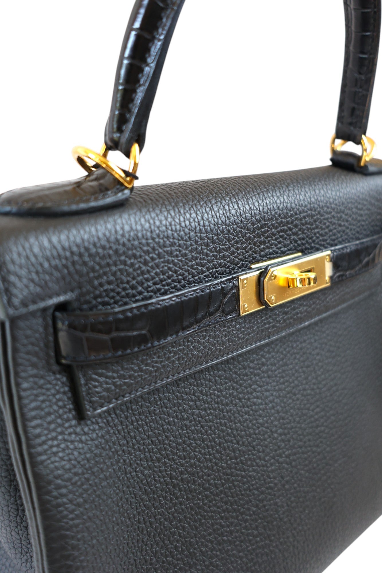 This elegant Kelly 28 Touch is crafted from Noir Togo leather with Alligator details, finished with gold hardware. Stamped Z (2021), in excellent condition, this bag perfectly balances timeless elegance with exotic allure.