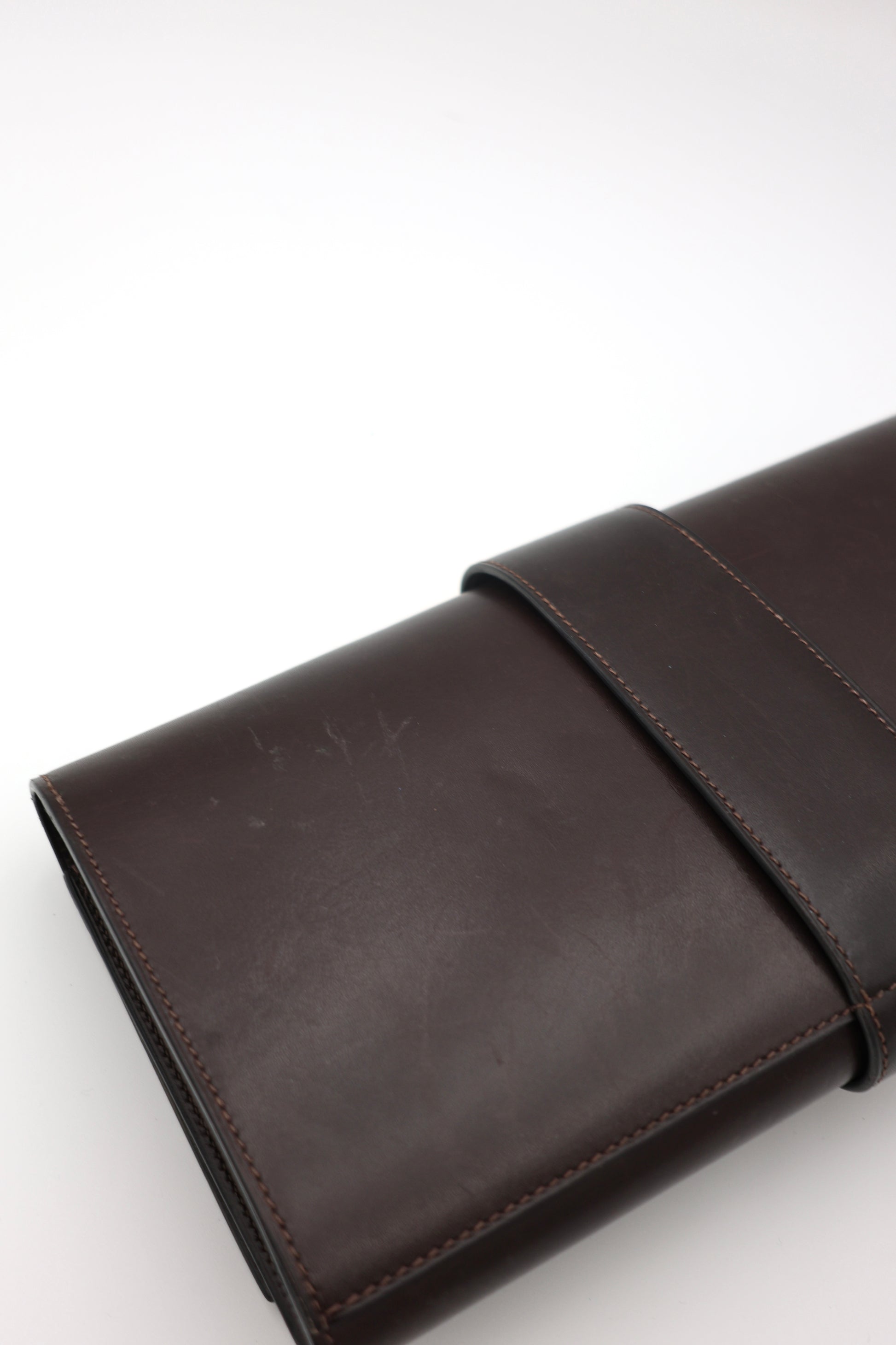 Preowned in Good condition. The clutch shows light scratches and scuffing throughout the leather, but remains in overall good condition.