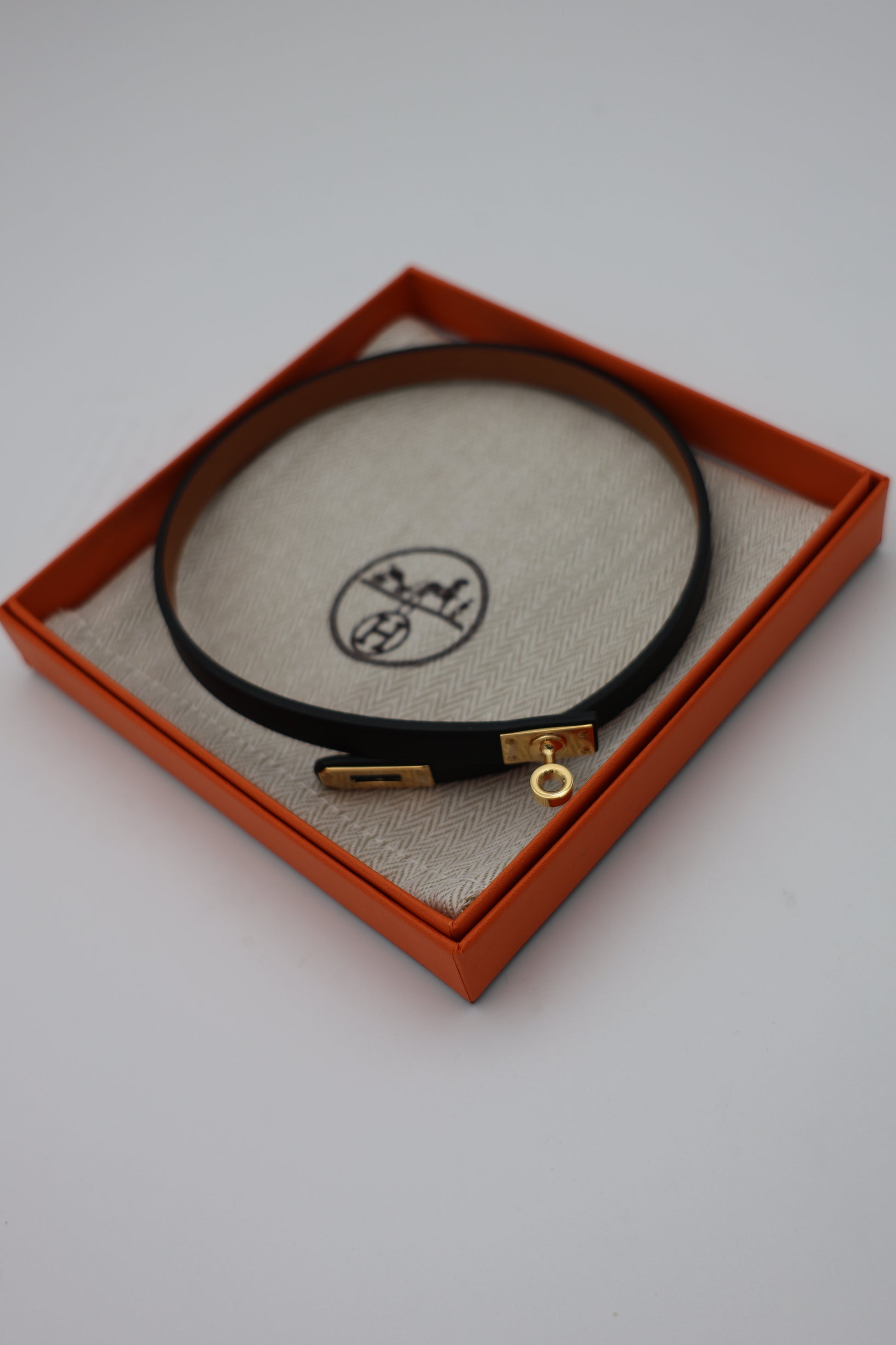 This Hermès Mini Kelly choker is crafted from Swift calfskin in Noir, offering a sleek, sculptural interpretation of the house’s iconic Kelly closure. The gold-plated turn-lock detail anchors the design at the front, echoing the hardware of the classic handbag in a refined, jewelry-inspired format. The supple leather wraps close to the neckline, balancing softness with the precision of the polished metal. Made in France, the piece reflects Hermès’ meticulous craftsmanship and its seamless translation of handbag codes into modern accessories.