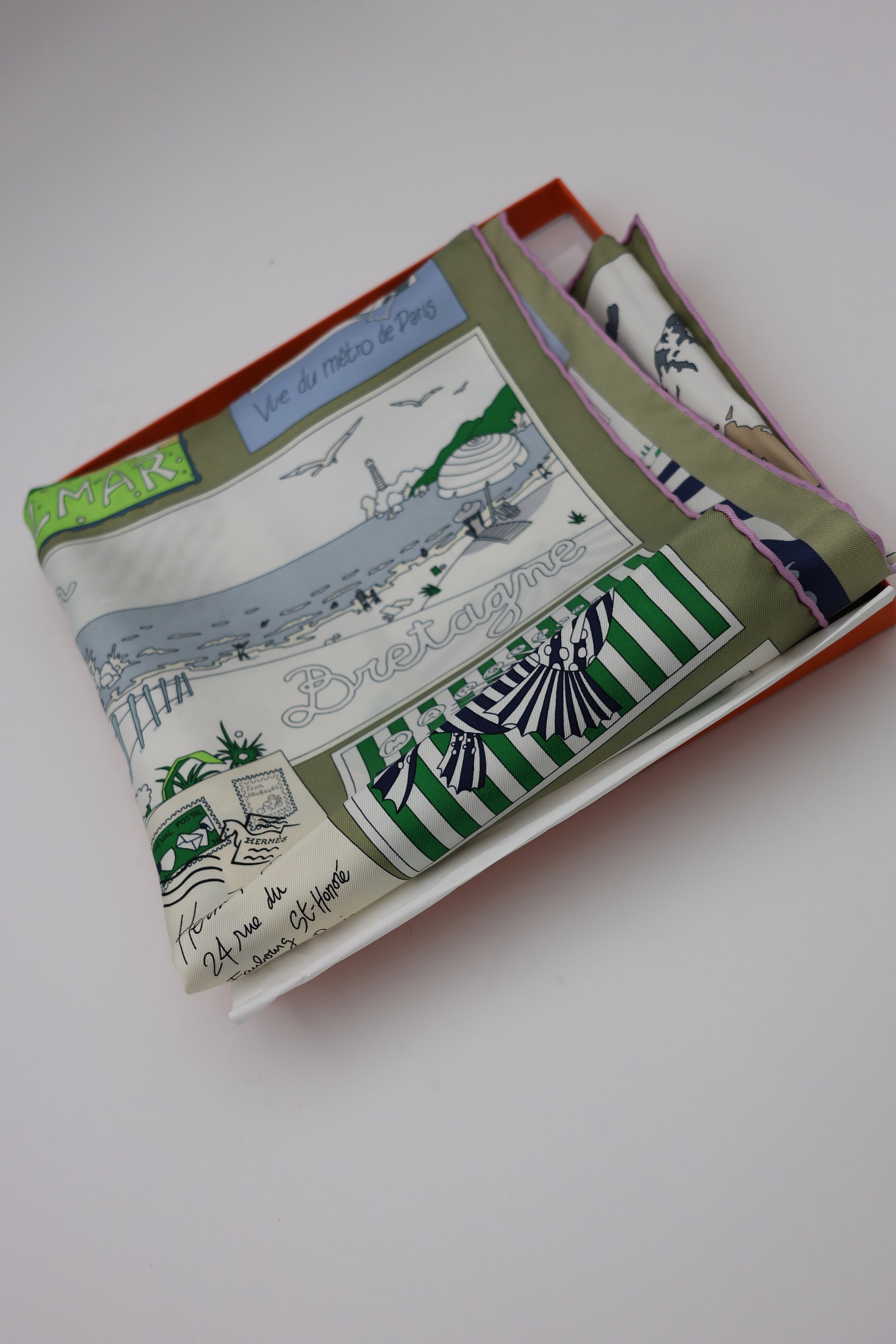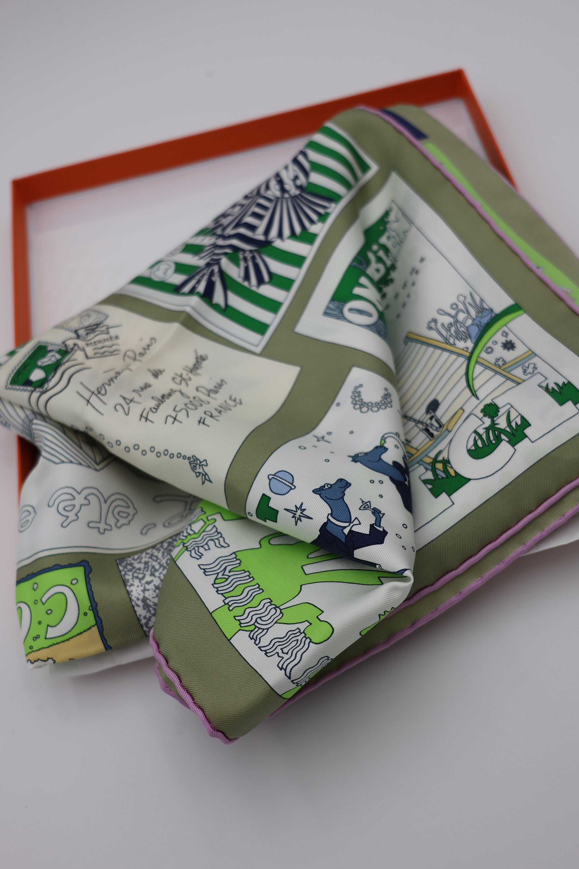 Hermès On Est Bien Ici ! Scarf 90 Kaki / Blanc / Bleu Glacier