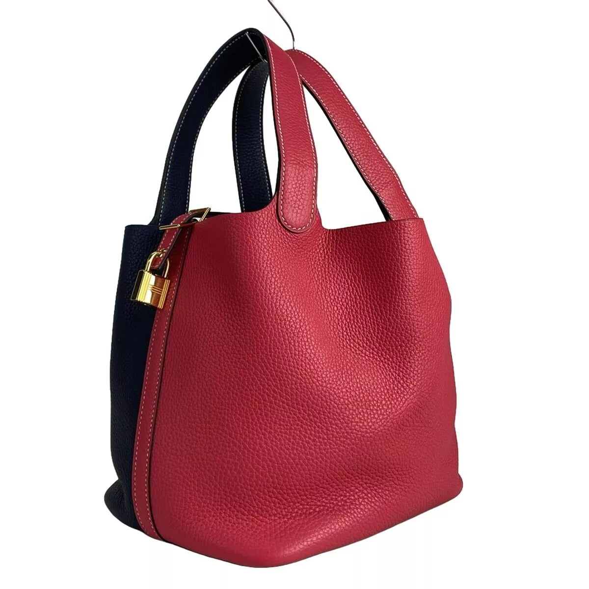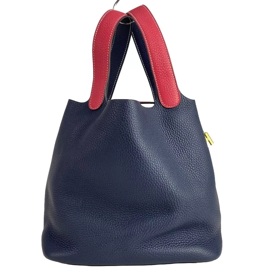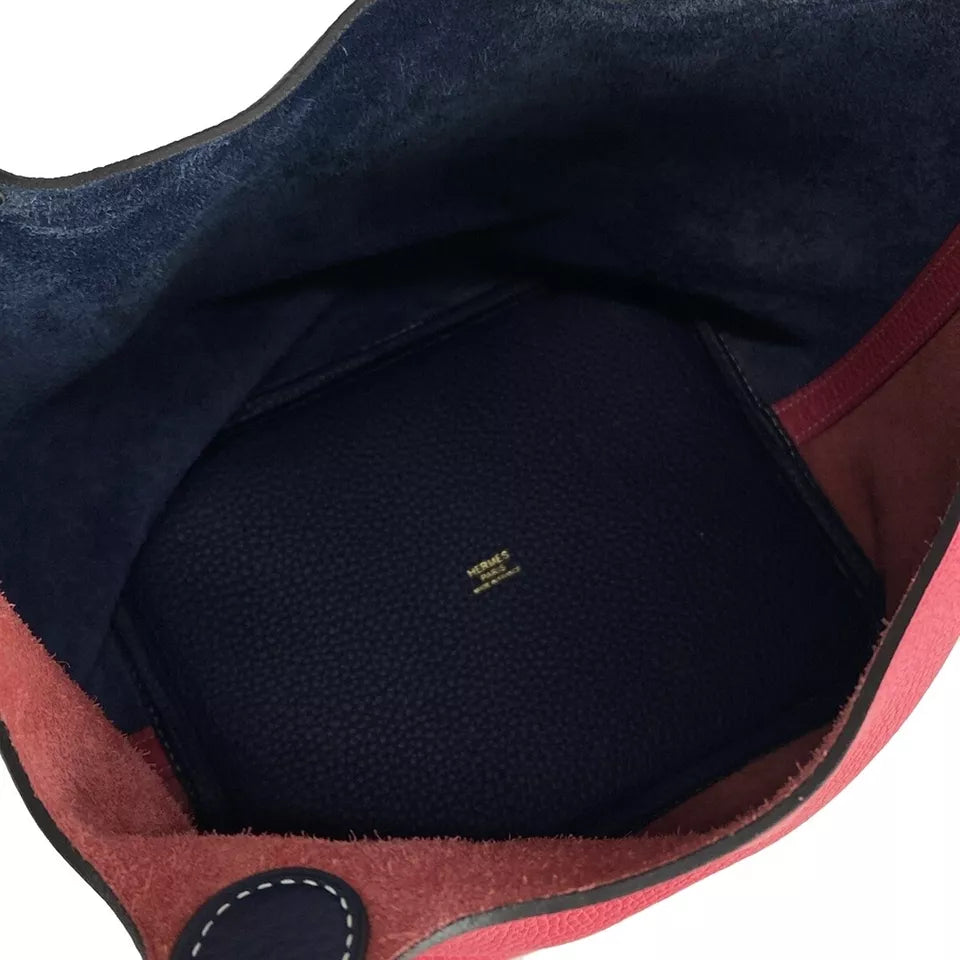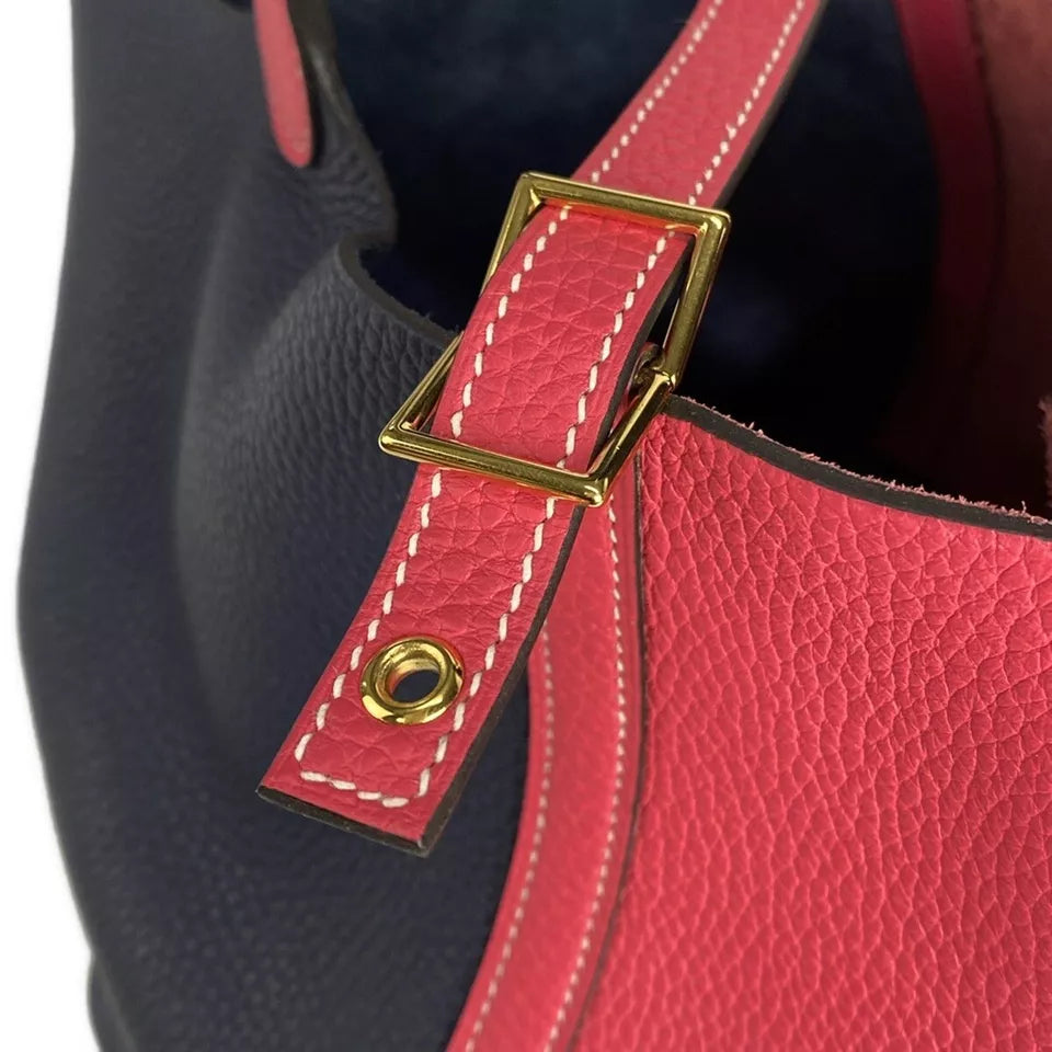 The HERMES Picotin Lock Kazak MM is an elegant handbag crafted from luxurious Taurillon Clemence leather in a striking combination of Rose Extreme and Blue Nuit. Featuring a minimalist design, this bag offers an understated sophistication perfect for any occasion. It comes with a gold-tone cadena lock, adding a touch of luxury, and is accompanied by a dust bag for the cadena.