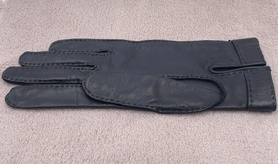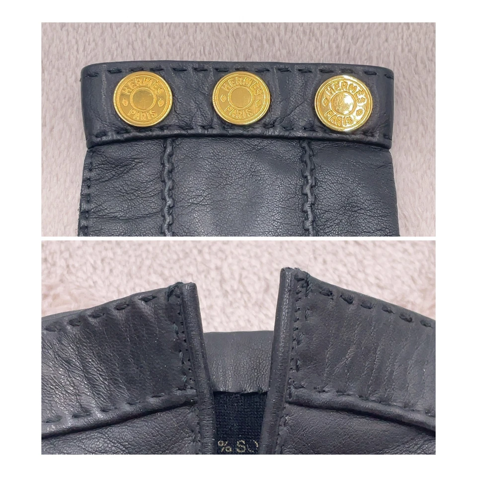 These Hermès Série gloves offer a refined balance of elegance and craftsmanship, blending smooth black leather with striking gold-tone hardware for a chic, modern finish. Designed in a classic silhouette, they provide both warmth and sophistication, making them an ideal accessory for cooler seasons or elevated styling. Their slim, tailored fit and luxurious materials showcase the timeless Hermès attention to detail. Light signs of wear, such as faint scratches and slight dullness on the metal components, remain minimal and do not affect overall beauty or use.