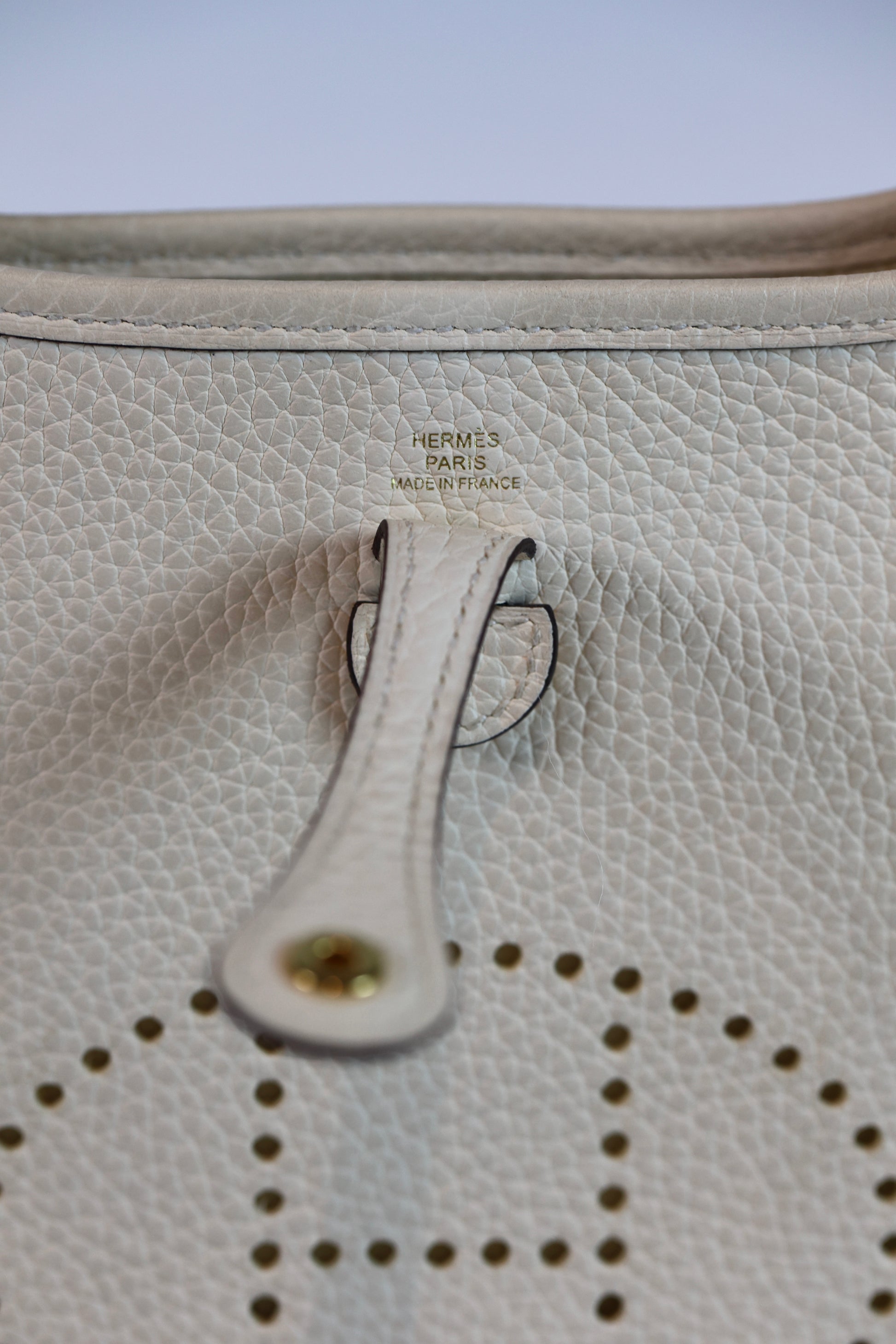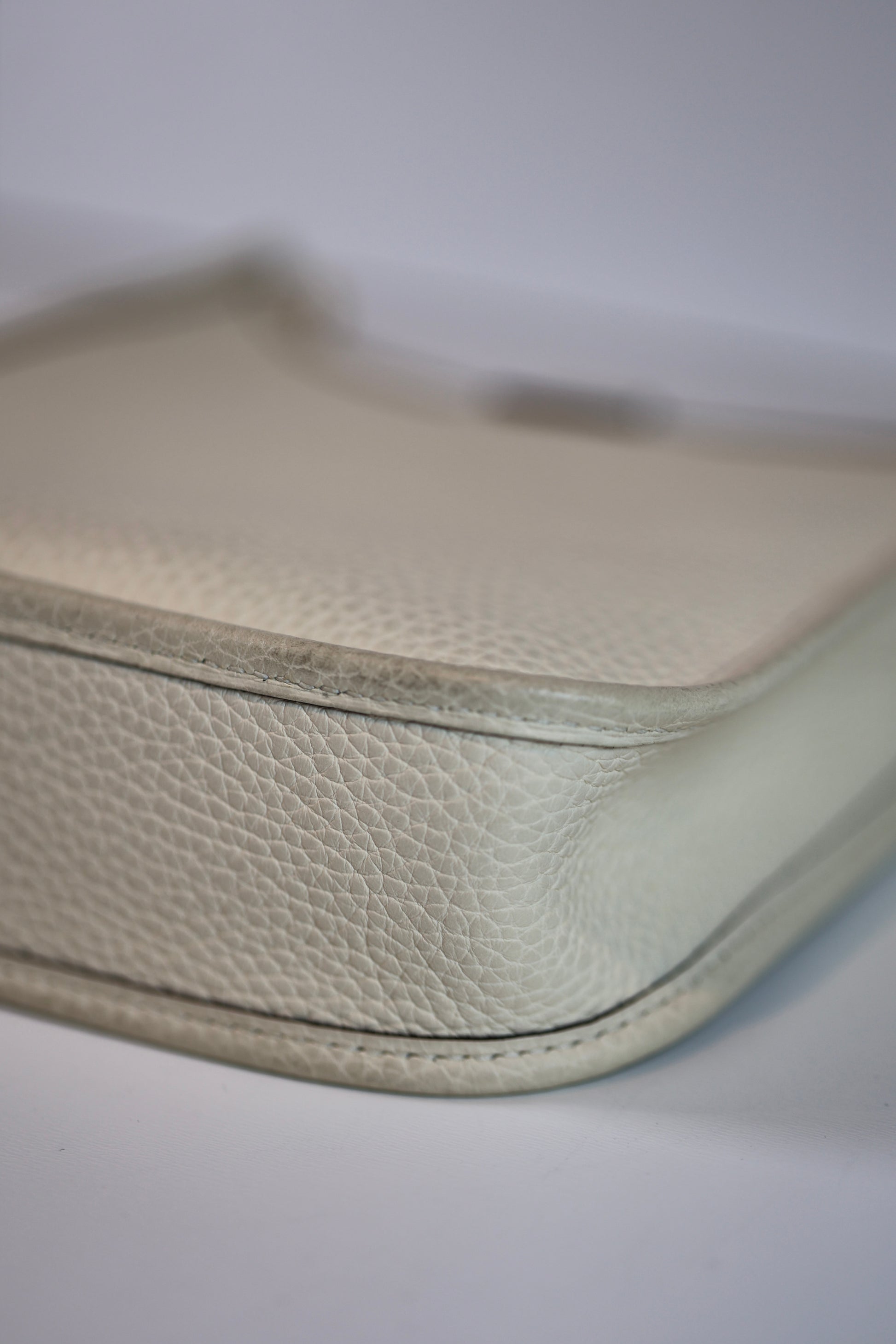 This authentic HERMES Taurillon Clemence Evelyne TPM in Nata is a coveted piece, crafted from taurillon calfskin leather in a sophisticated off-white shade. This petite messenger bag features a canvas body strap, polished gold-plated hardware, and the iconic perforated Hermes "H" oval logo. Perfect for effortless style, it opens with a crossover strap to a luxurious suede interior.