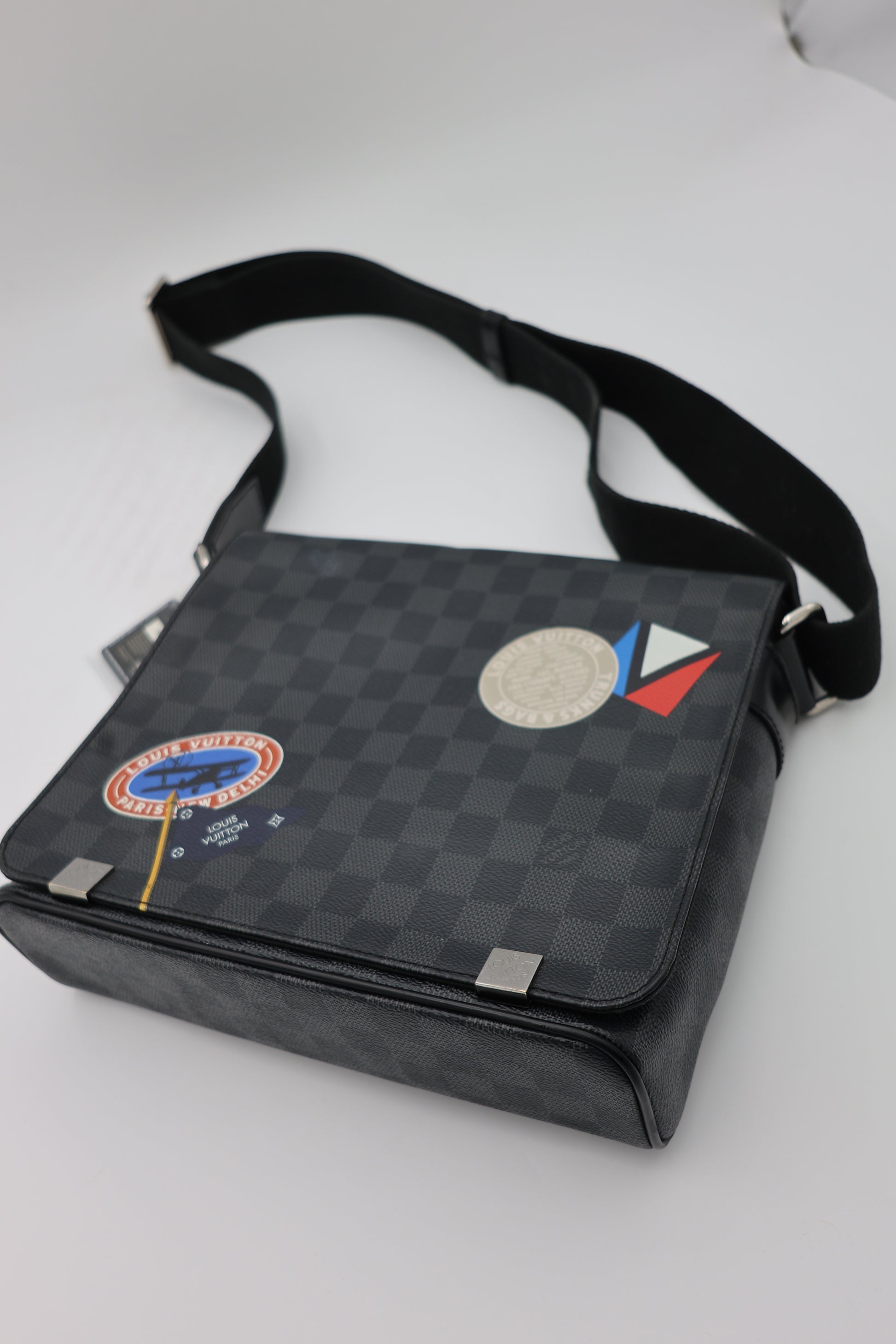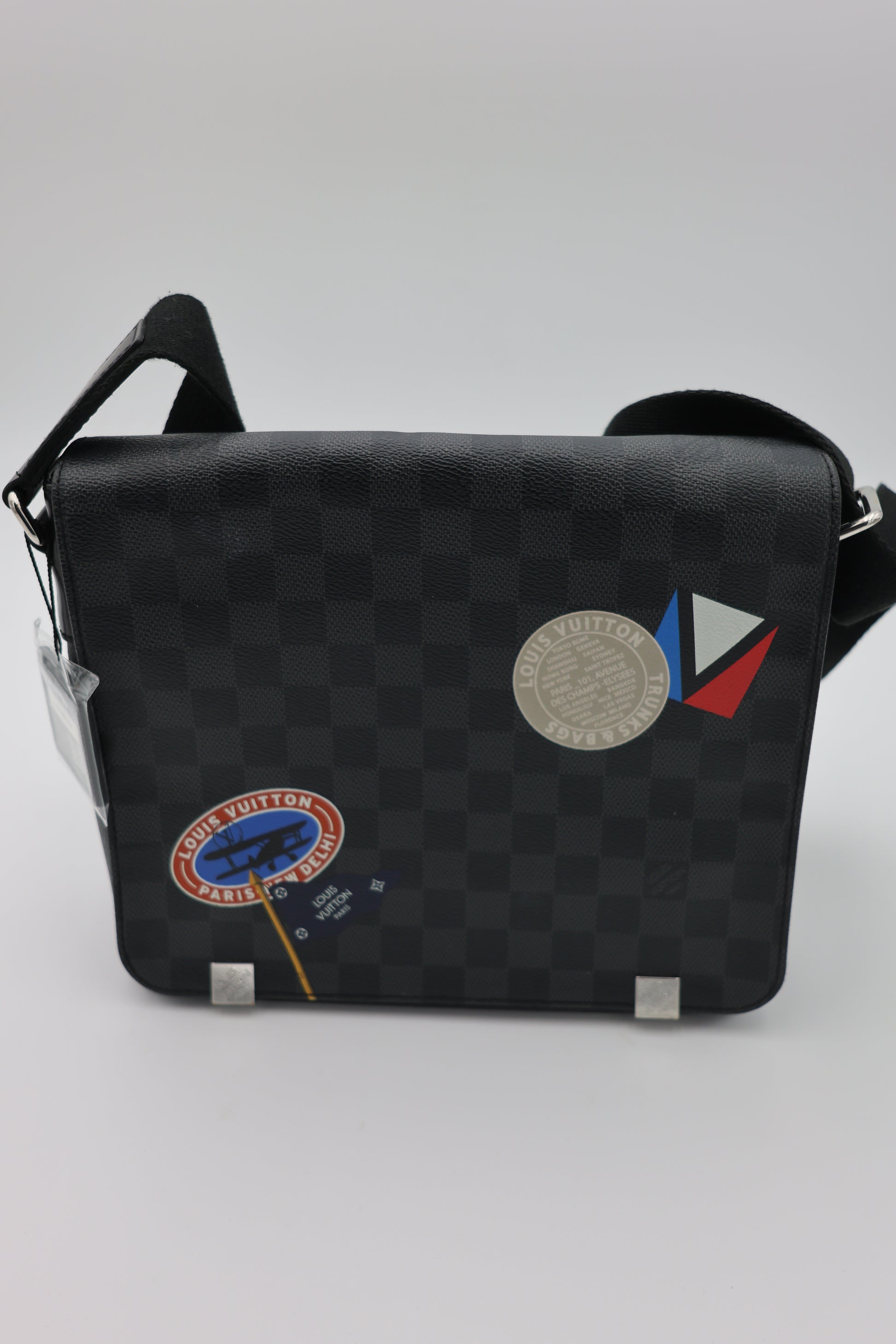 This limited edition Louis Vuitton District PM is crafted from Damier Graphite coated canvas and distinguished by its multicolored “LV League” heritage-inspired stickers, referencing the house’s historic trunk-making legacy. Introduced as part of the 2017 collection, the playful graphics contrast with the sleek, urban tone of the graphite canvas, creating a balance between archival nostalgia and contemporary design. The structured flap silhouette is secured with a magnetic closure and accented with silver-tone hardware. An adjustable textile shoulder strap allows for comfortable crossbody or shoulder wear, making it a practical everyday messenger with distinctive character.