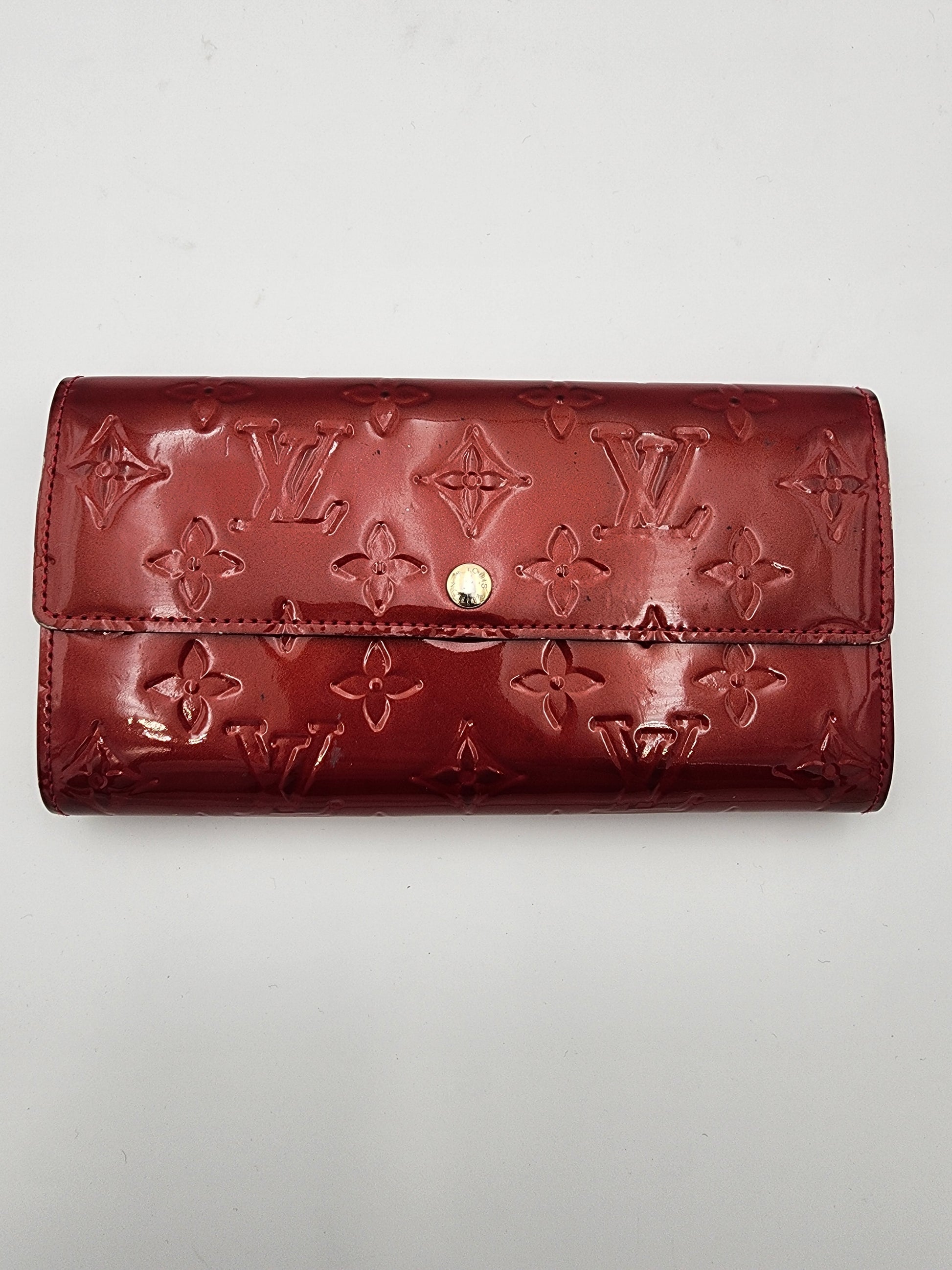 This Louis Vuitton Sarah wallet is rendered in Monogram Vernis leather in the vibrant Pomme D’amour shade, offering a polished interpretation of a classic house silhouette. The flap-front design opens to a well-organized interior with multiple card slots and a secure zip pocket, balancing elegance with everyday functionality. The patent leather surface reflects light beautifully while maintaining a refined, streamlined profile that feels intentional rather than ornate.