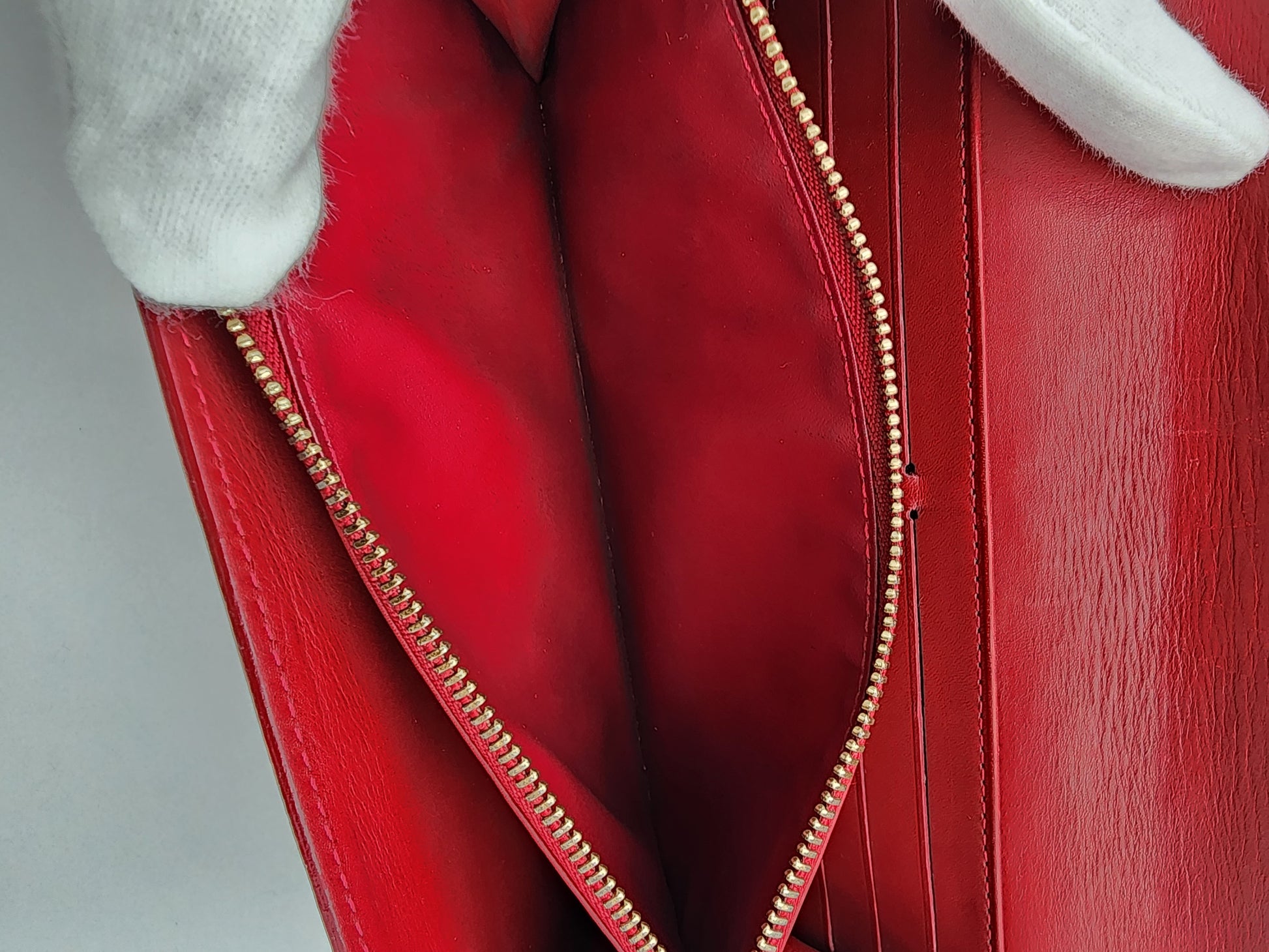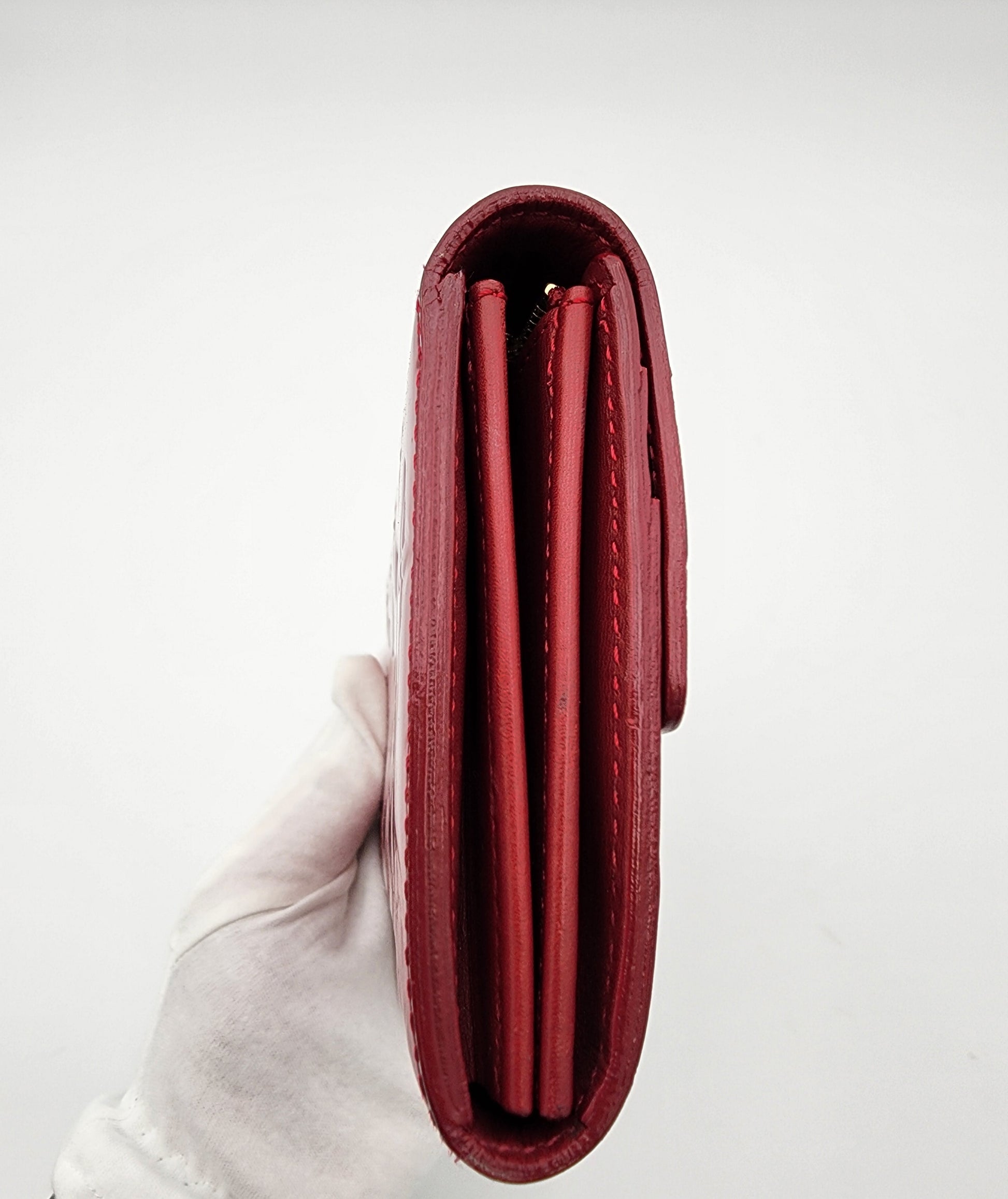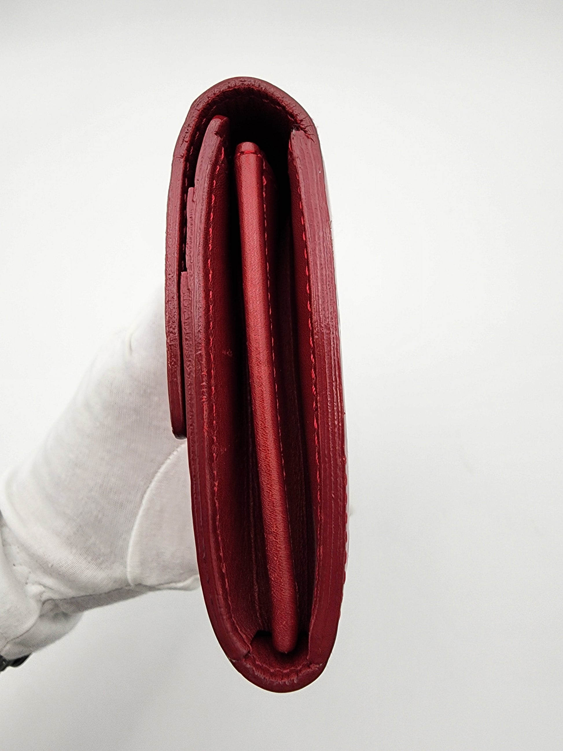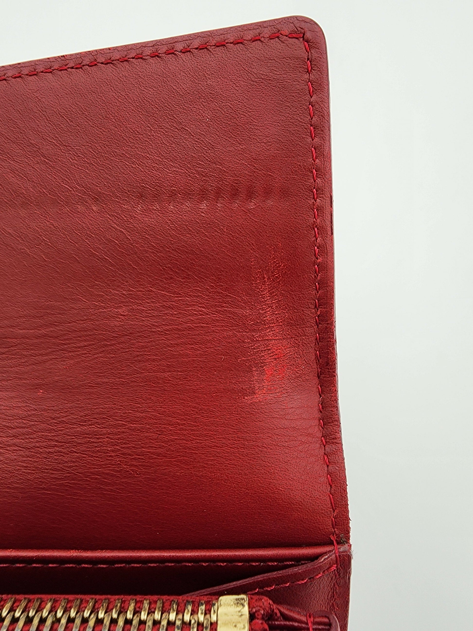 - There are some marks throughout, but the vernis leather remains glossy and smooth, preserving the richness of the finish and the wallet’s clean structure.