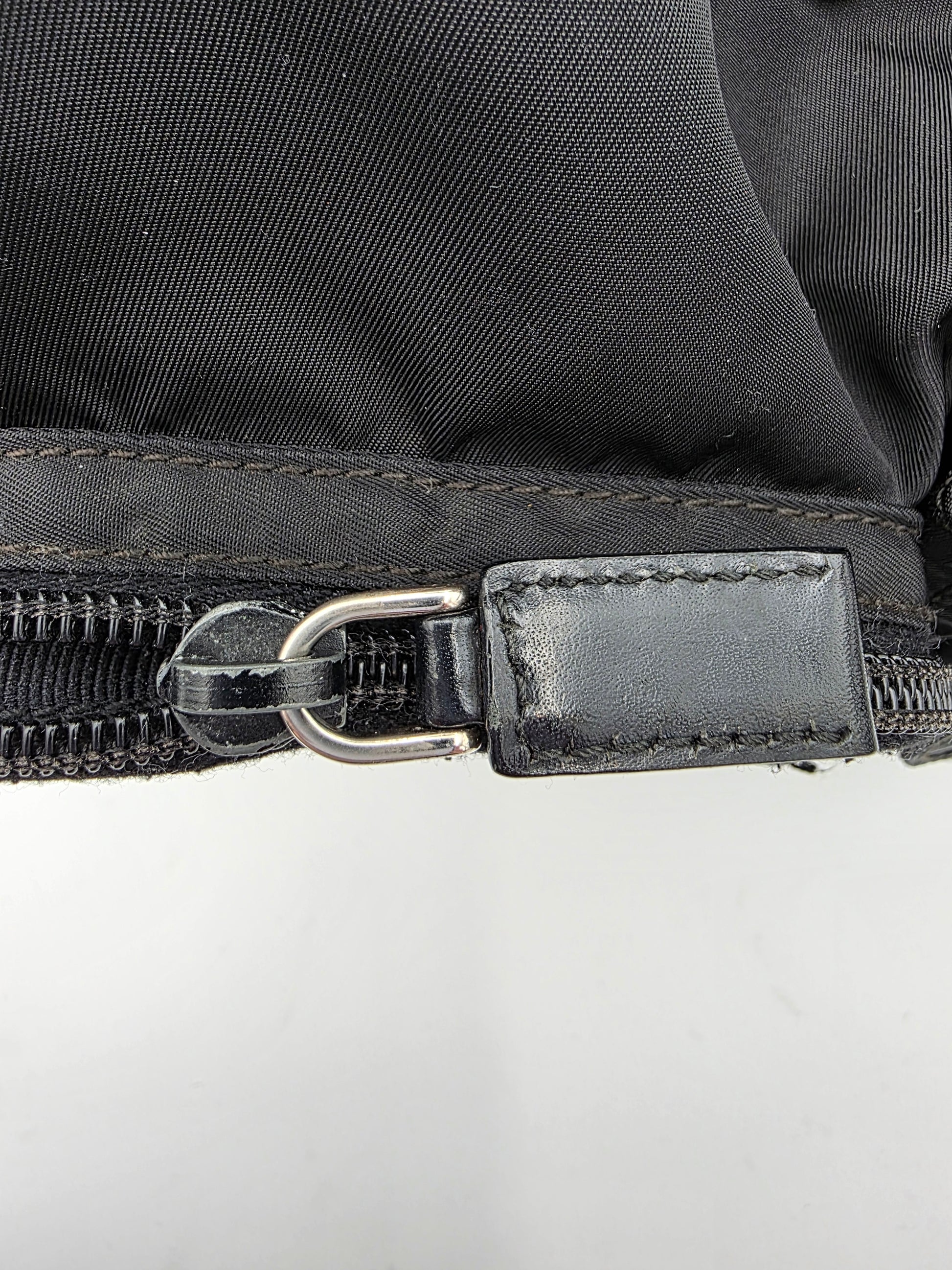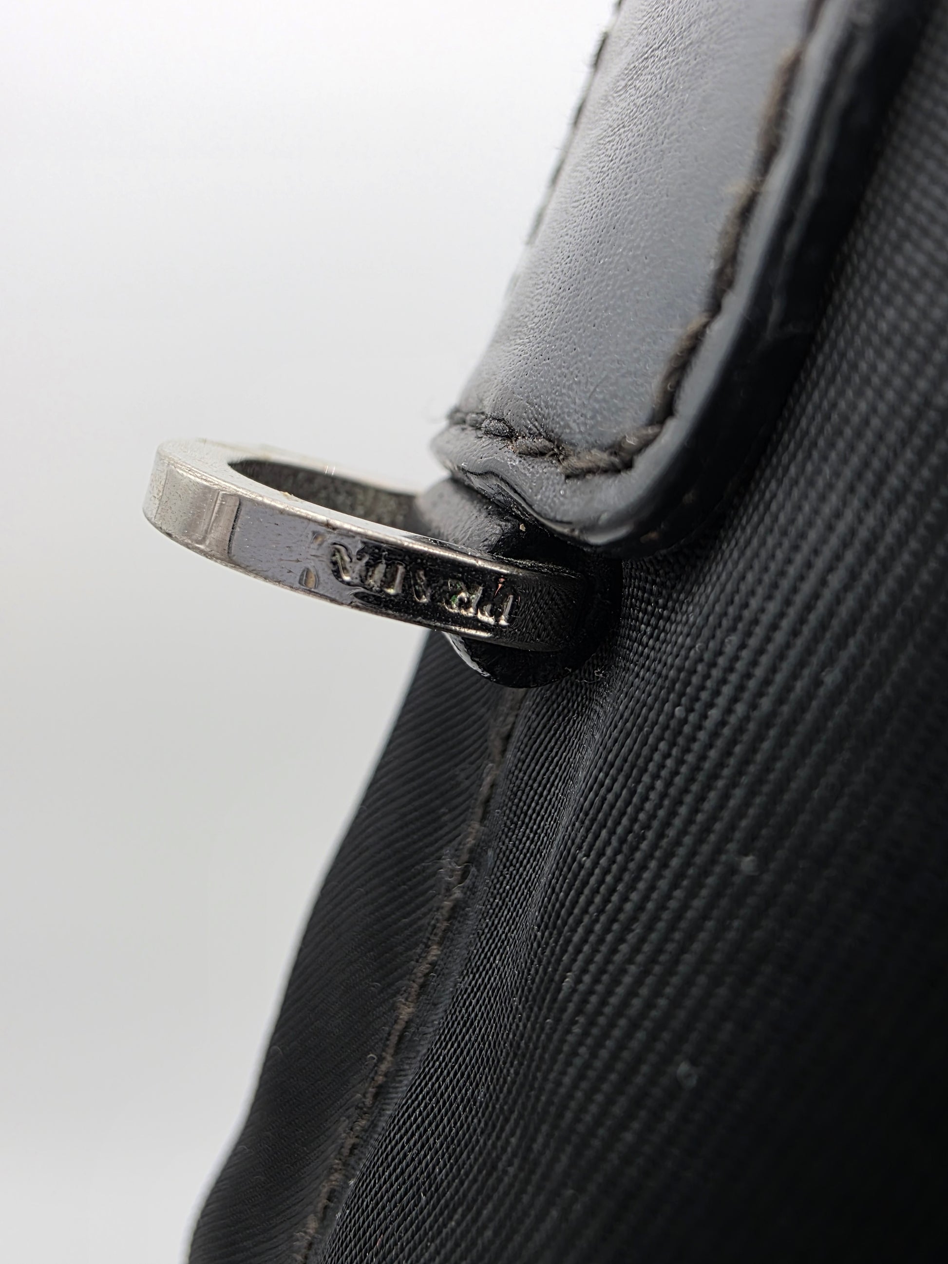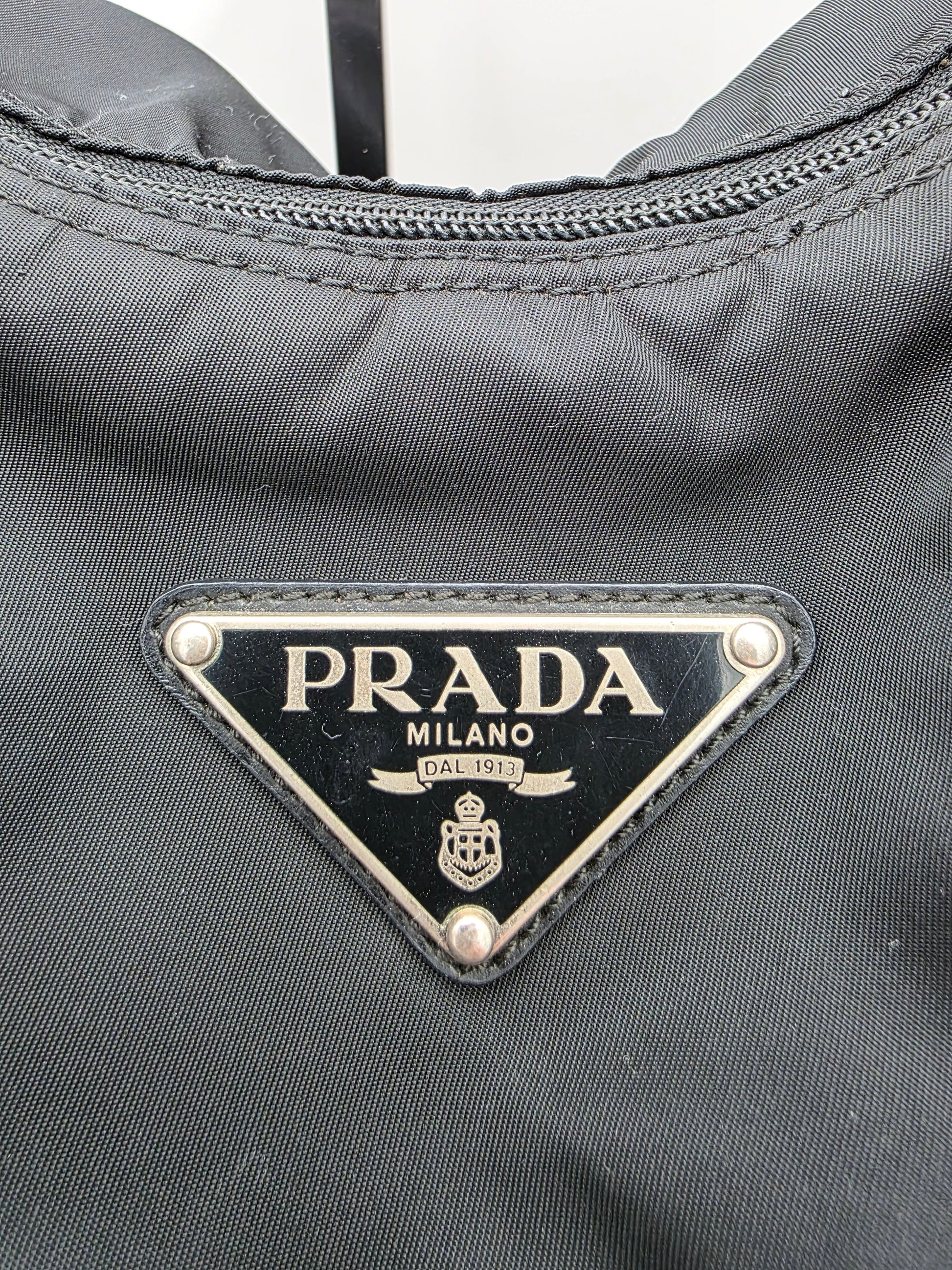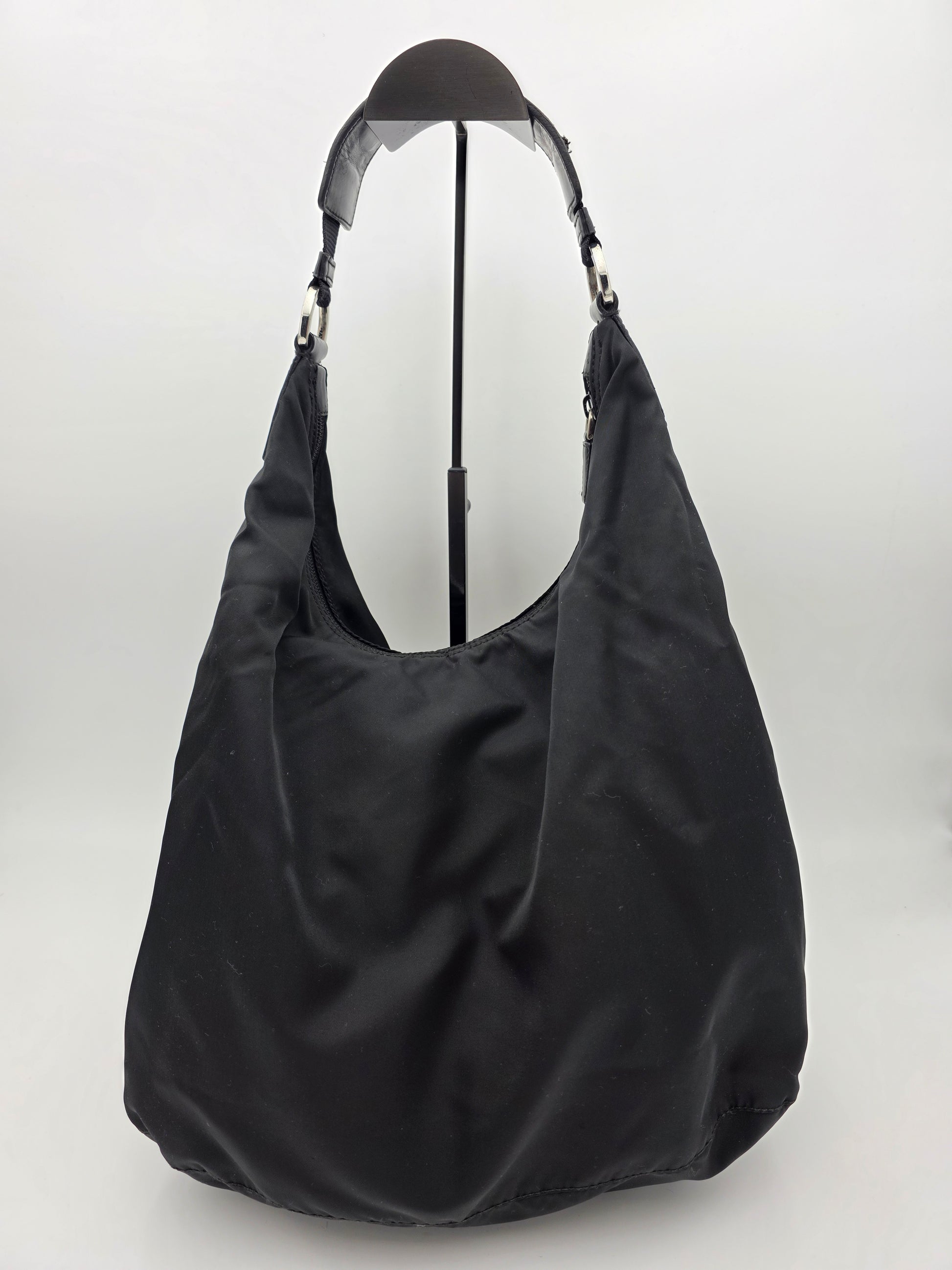 Crafted from Prada’s signature Tessuto nylon, this one-shoulder bag reflects the brand’s clean, utilitarian aesthetic. The lightweight black nylon body offers durability while maintaining a soft structure, complemented by subtle leather trim and the iconic triangular Prada logo plaque at the front. The spacious silhouette is designed for everyday functionality, with two exterior pockets and an interior pocket that provide practical organization while preserving the streamlined profile.