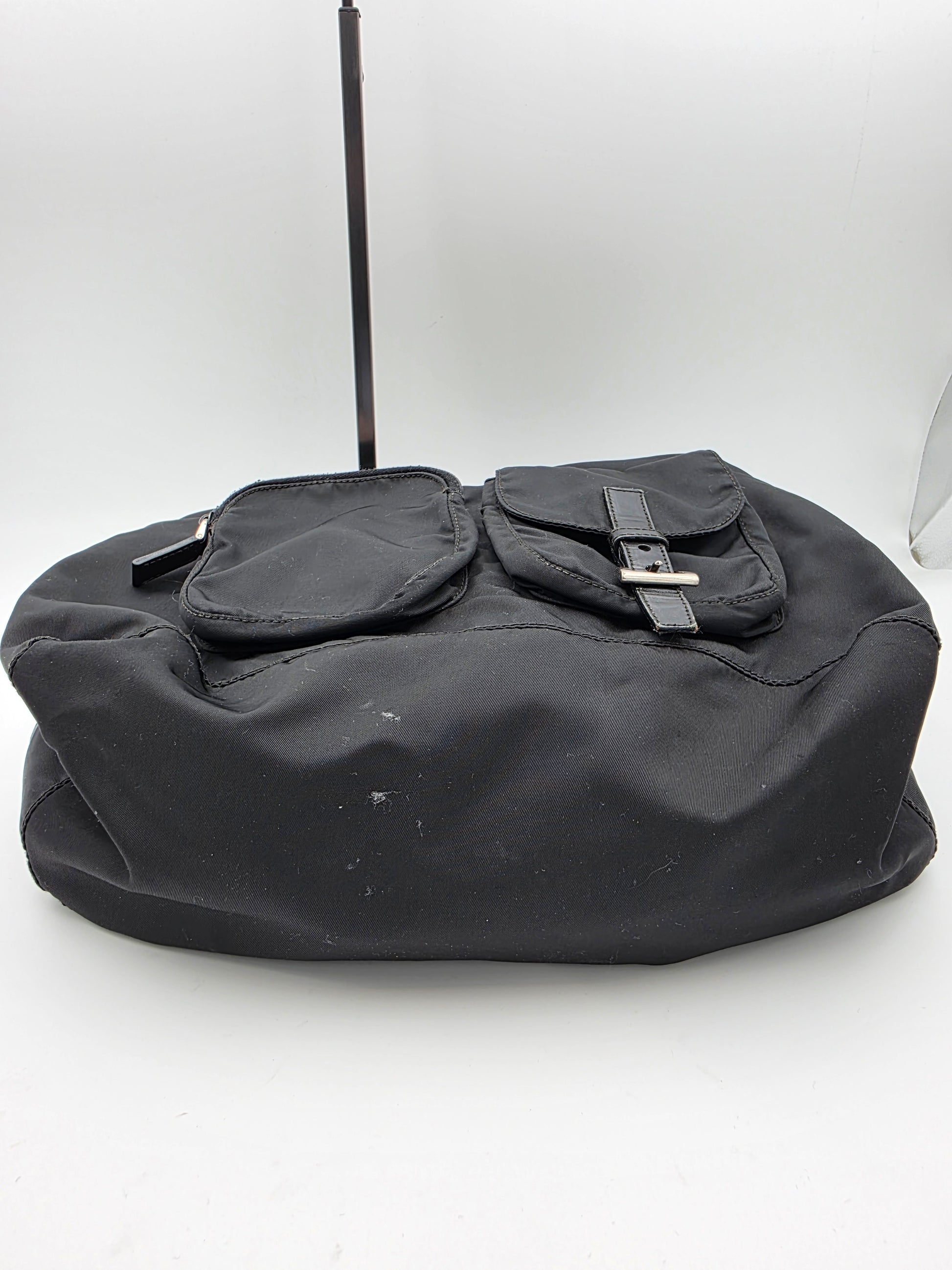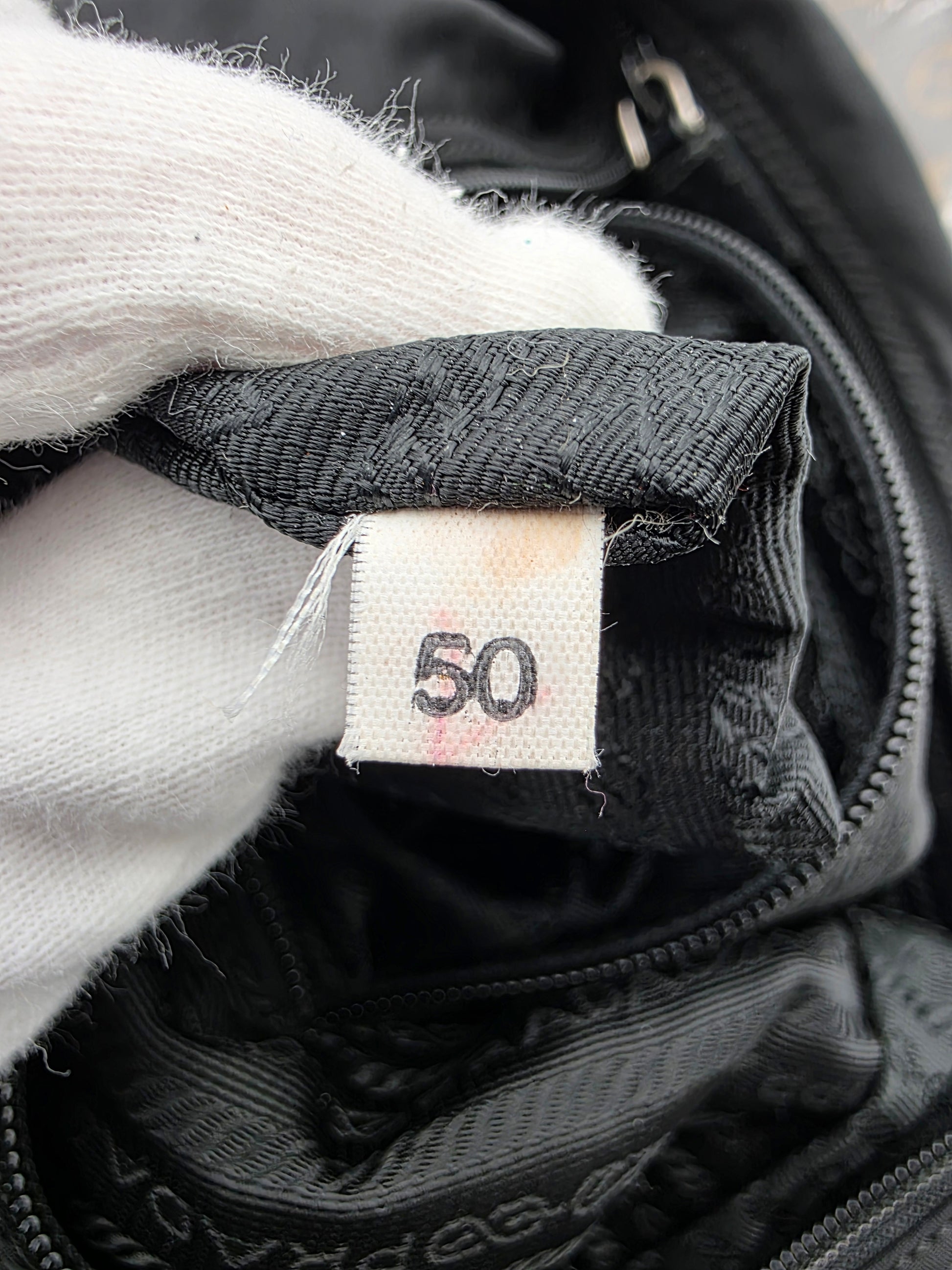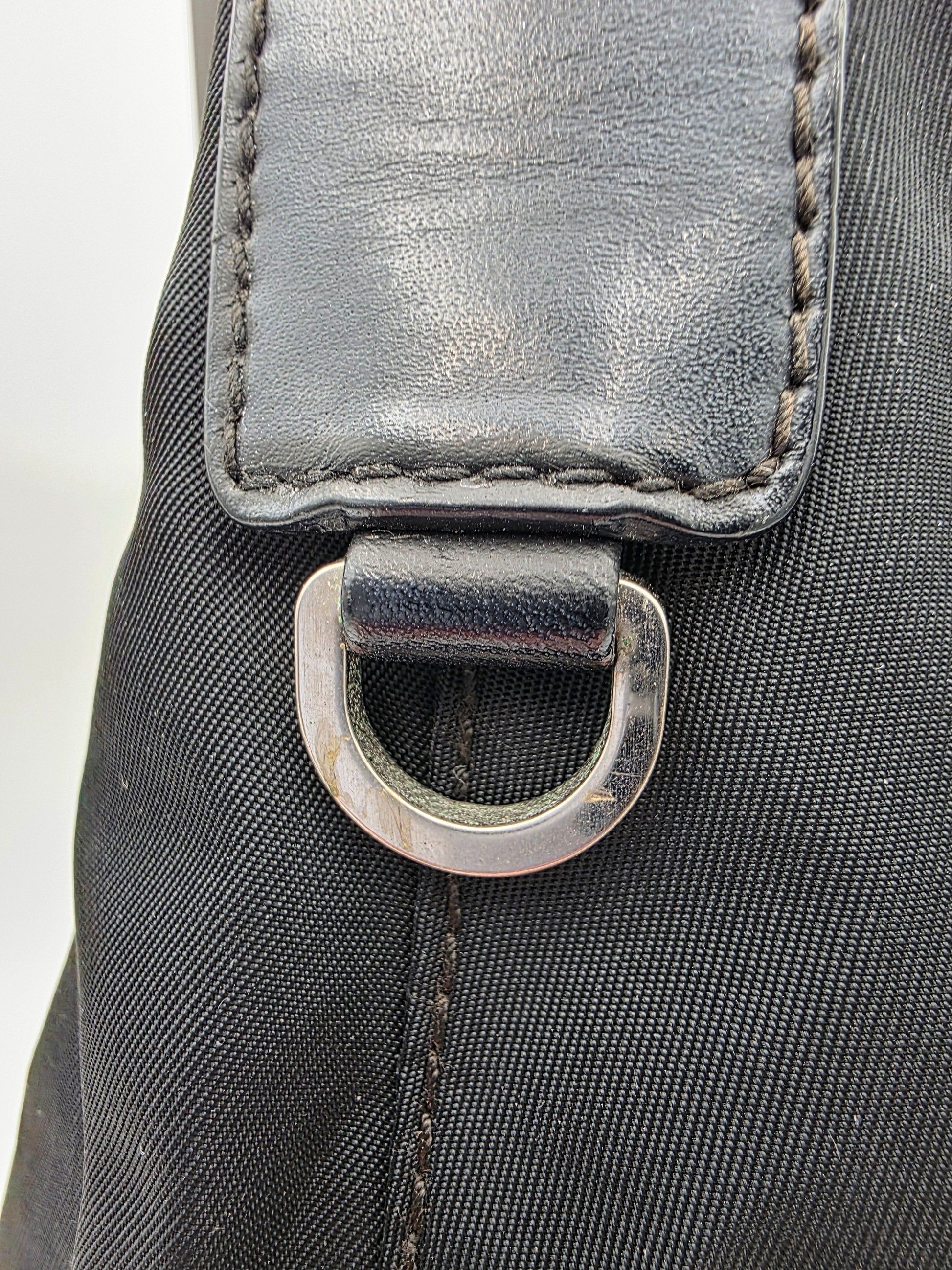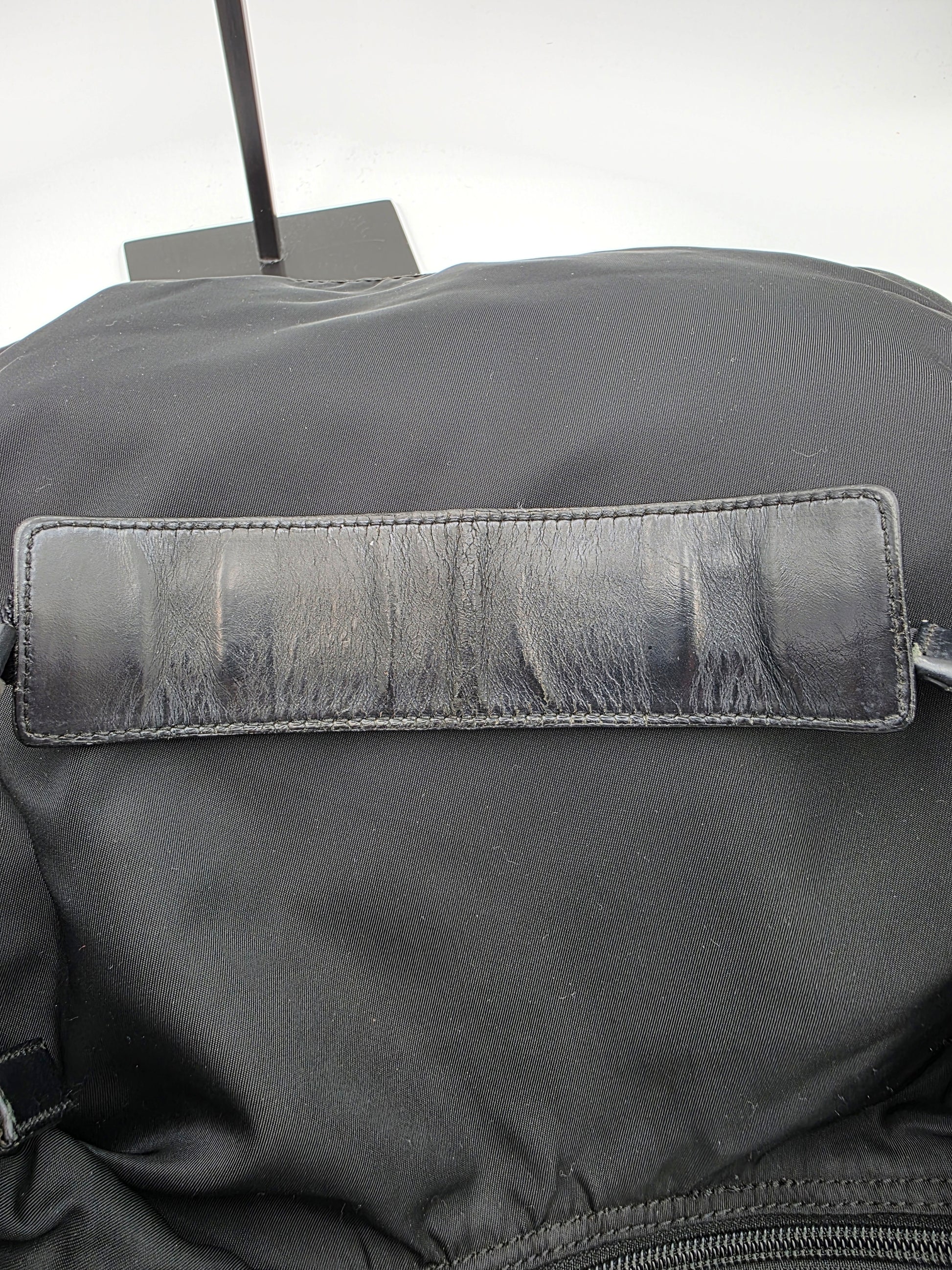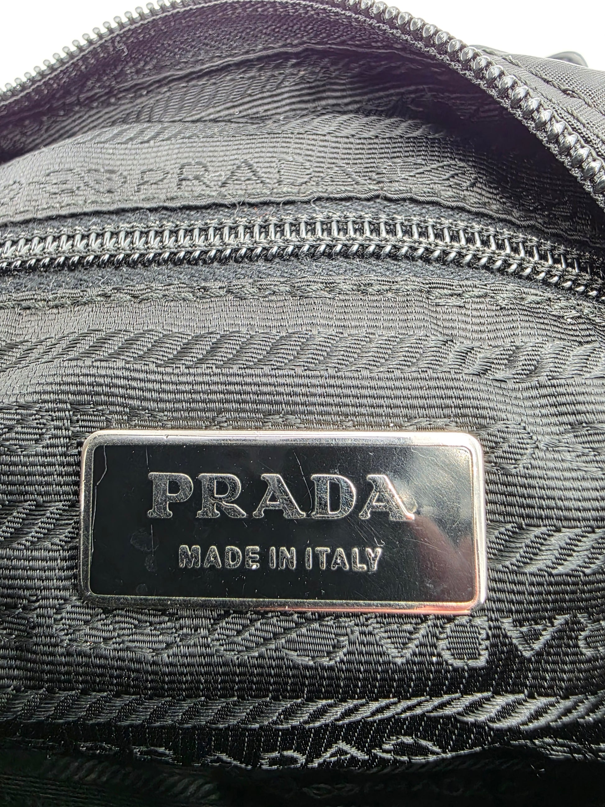 Crafted from Prada’s signature Tessuto nylon, this one-shoulder bag reflects the brand’s clean, utilitarian aesthetic. The lightweight black nylon body offers durability while maintaining a soft structure, complemented by subtle leather trim and the iconic triangular Prada logo plaque at the front. The spacious silhouette is designed for everyday functionality, with two exterior pockets and an interior pocket that provide practical organization while preserving the streamlined profile.
