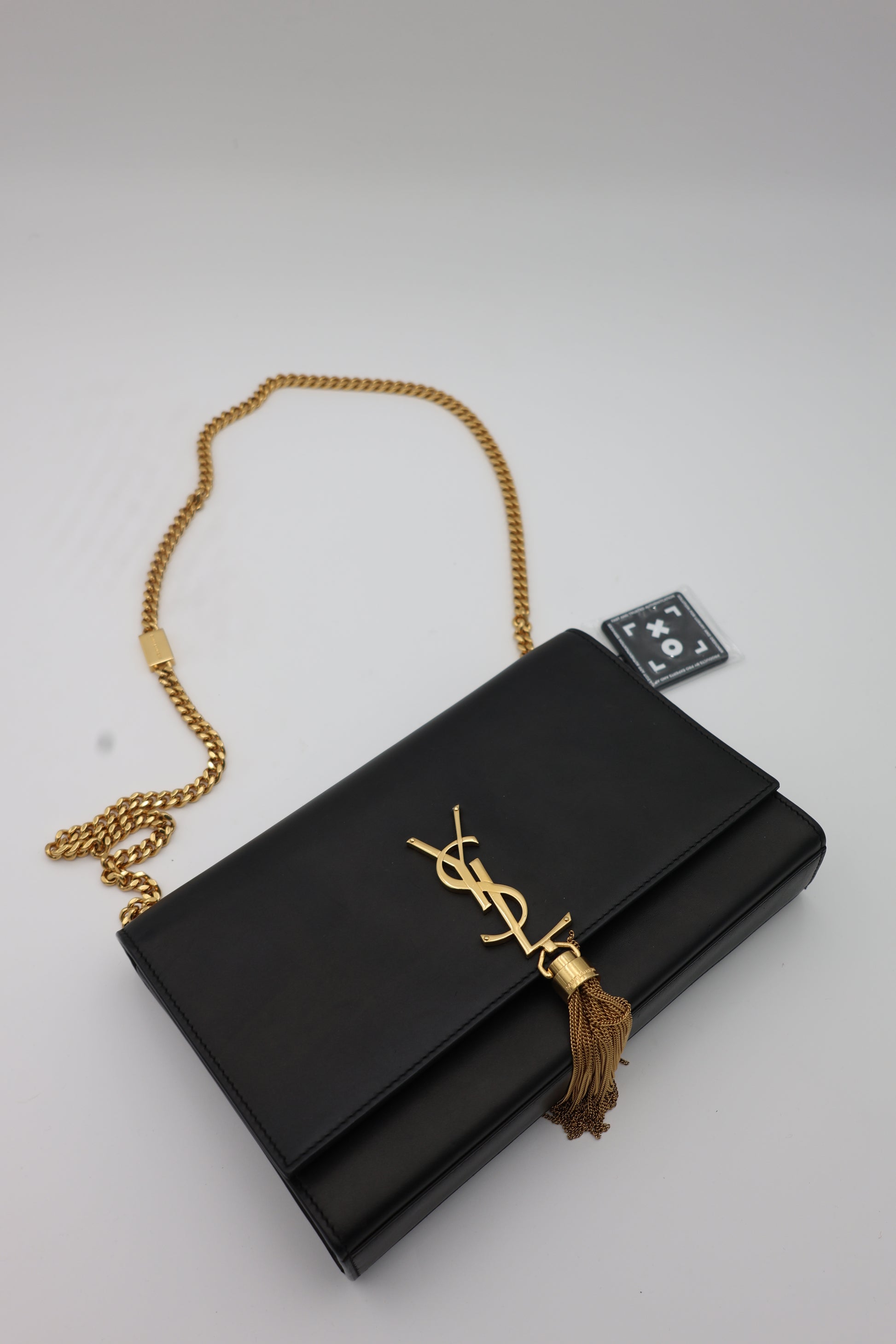 This Saint Laurent Kate Medium bag is crafted in Italy from smooth black calfskin, defined by its structured box silhouette and high-shine gold-tone hardware. The front is anchored by the iconic interlocking YSL Cassandre logo, extended into a cascading metal chain tassel that adds movement and contrast to the clean lines of the design. A gourmette chain strap allows for shoulder or crossbody wear, maintaining versatility without disrupting the refined profile. The magnetic snap closure opens to a fabric-lined interior with a slot pocket for essentials, balancing minimalism with practical organization. Elegant and precise in proportion, the Kate remains one of Saint Laurent’s most recognizable evening silhouettes.