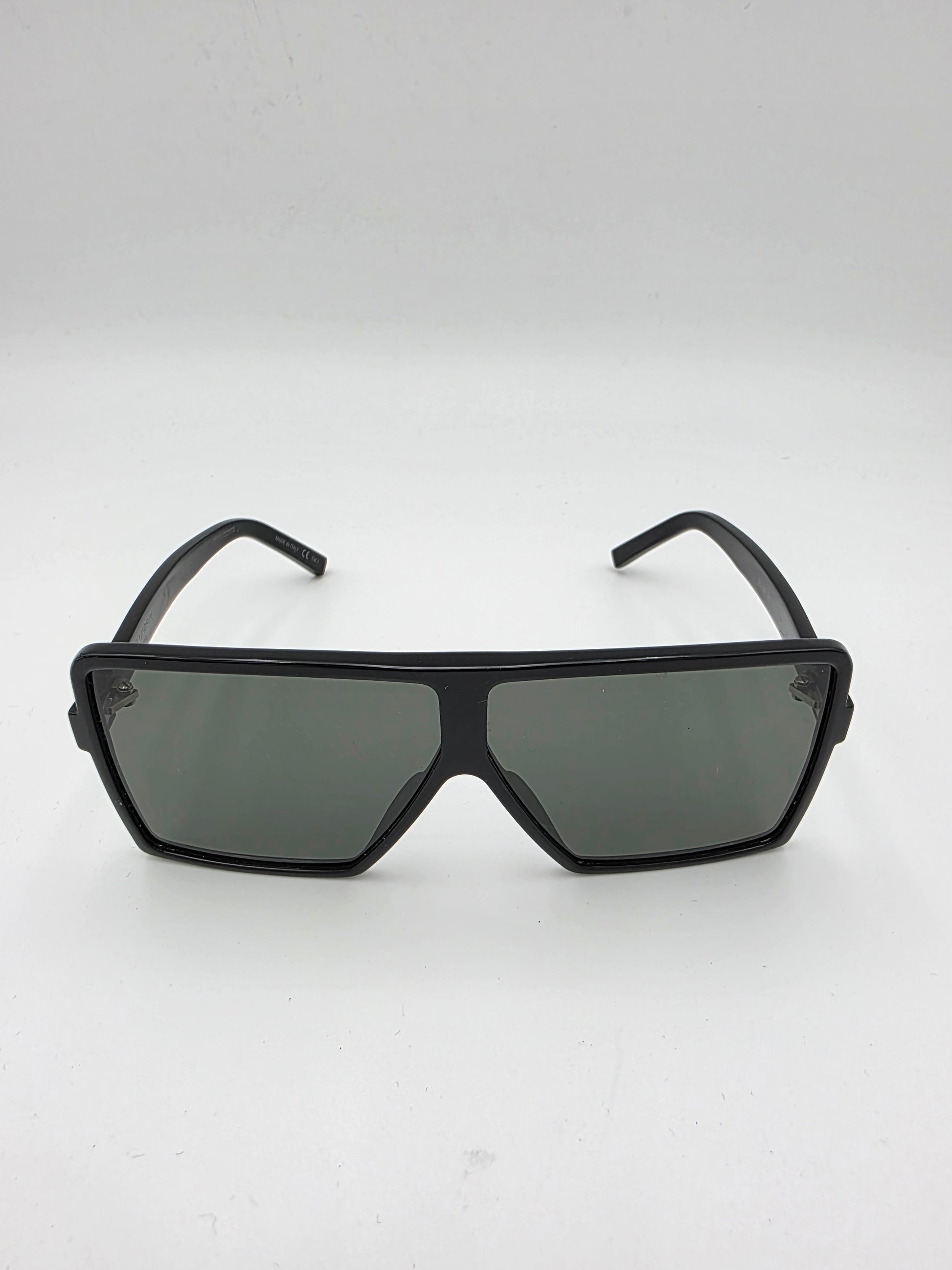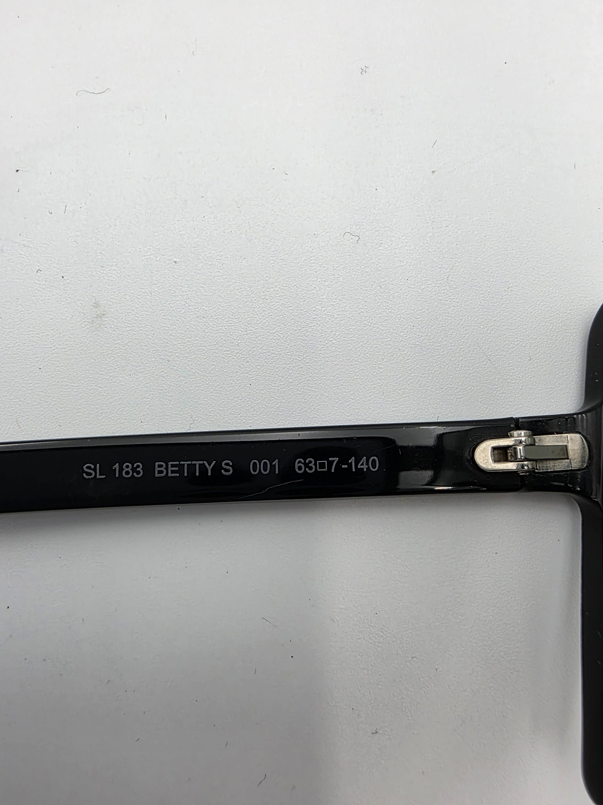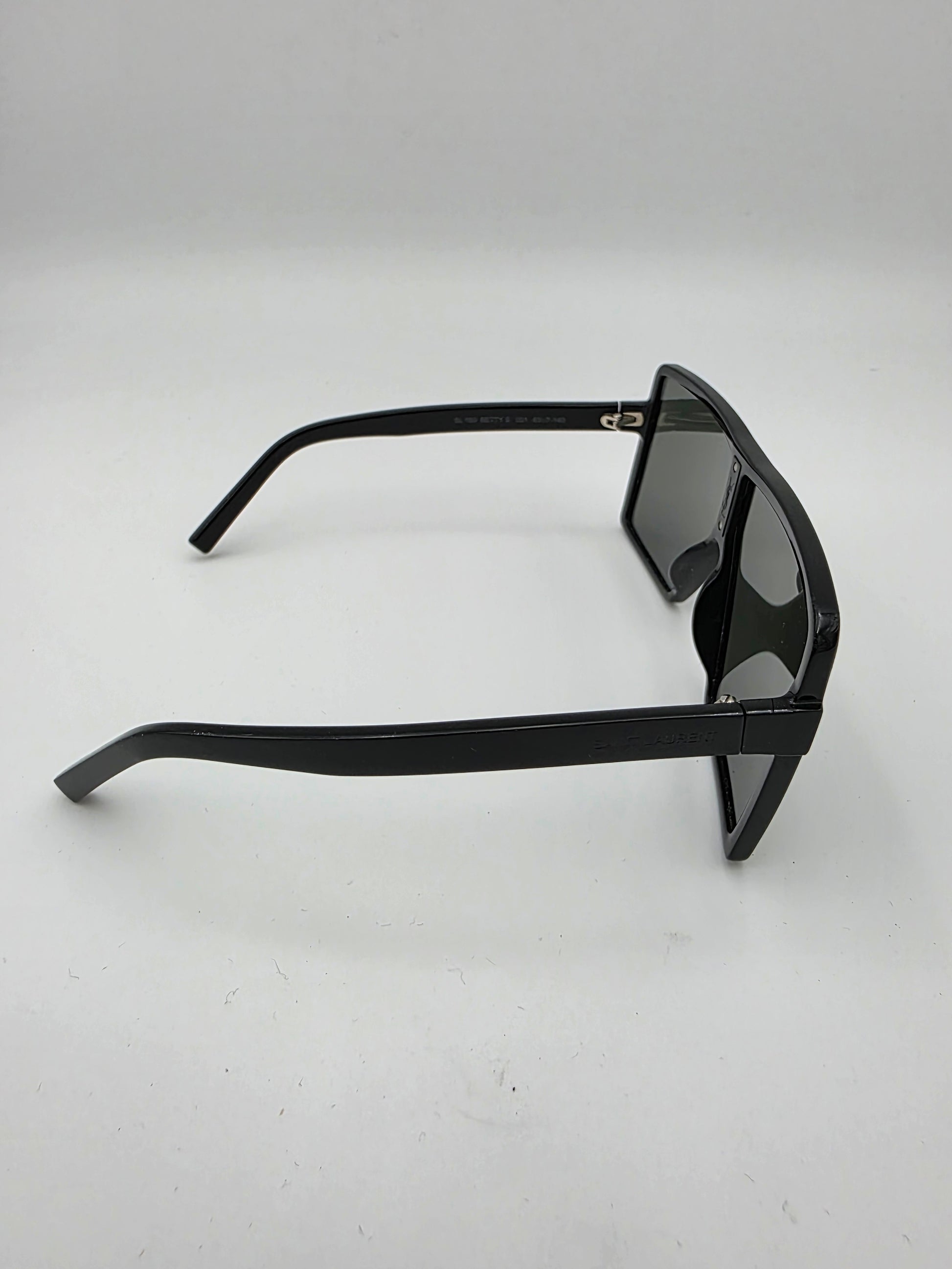 Part of the Betty eyewear line, the SL 183 Betty S presents a striking, futuristic interpretation of the classic square frame. The oversized mask-inspired silhouette creates a bold rectangular profile, emphasizing sharp volumes and clean architectural lines. Crafted from polished black acetate, the design is paired with grey mineral glass lenses that offer full UV protection. Subtle Saint Laurent details include the laser-engraved logo along the temples and a hidden metal plaque featuring the YSL Cassandre logo positioned behind the bridge, reinforcing the house’s understated approach to branding.