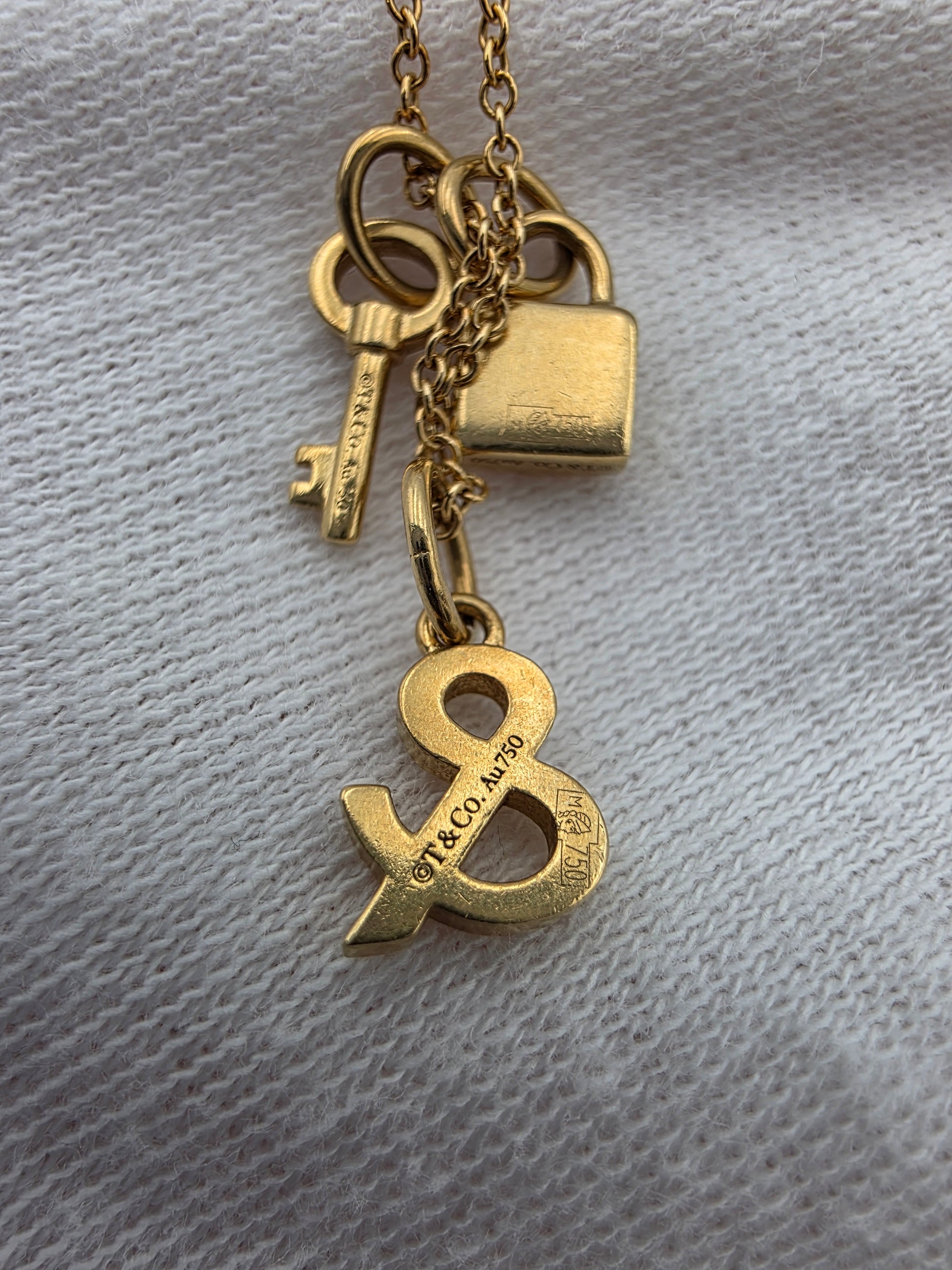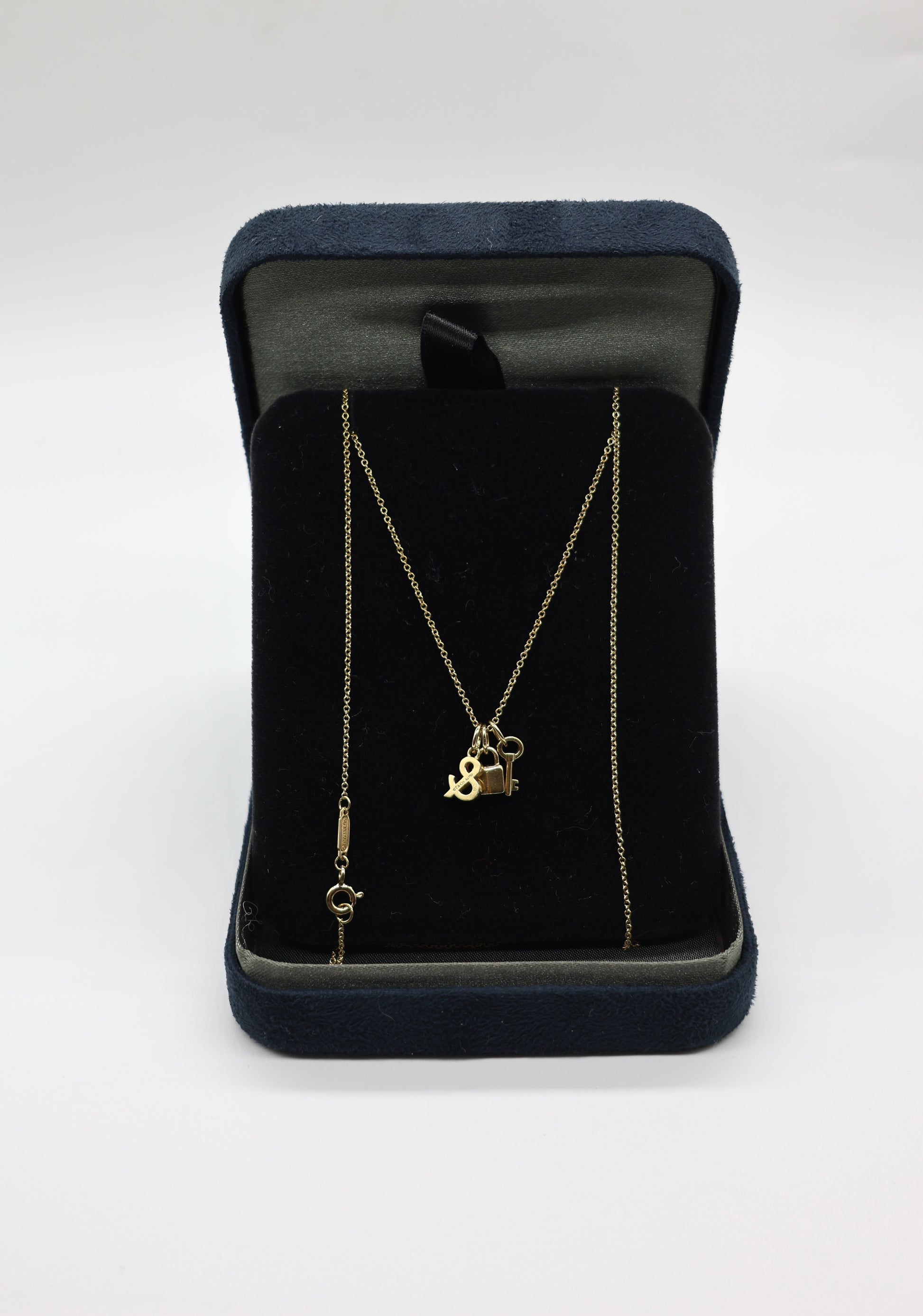 This is an authentic TIFFANY 18K Yellow Gold Lock and Key Pendant Necklace. The necklace is crafted of 18 karat yellow gold and features an assortment of charms, including a key, an ampersand, and a lock.